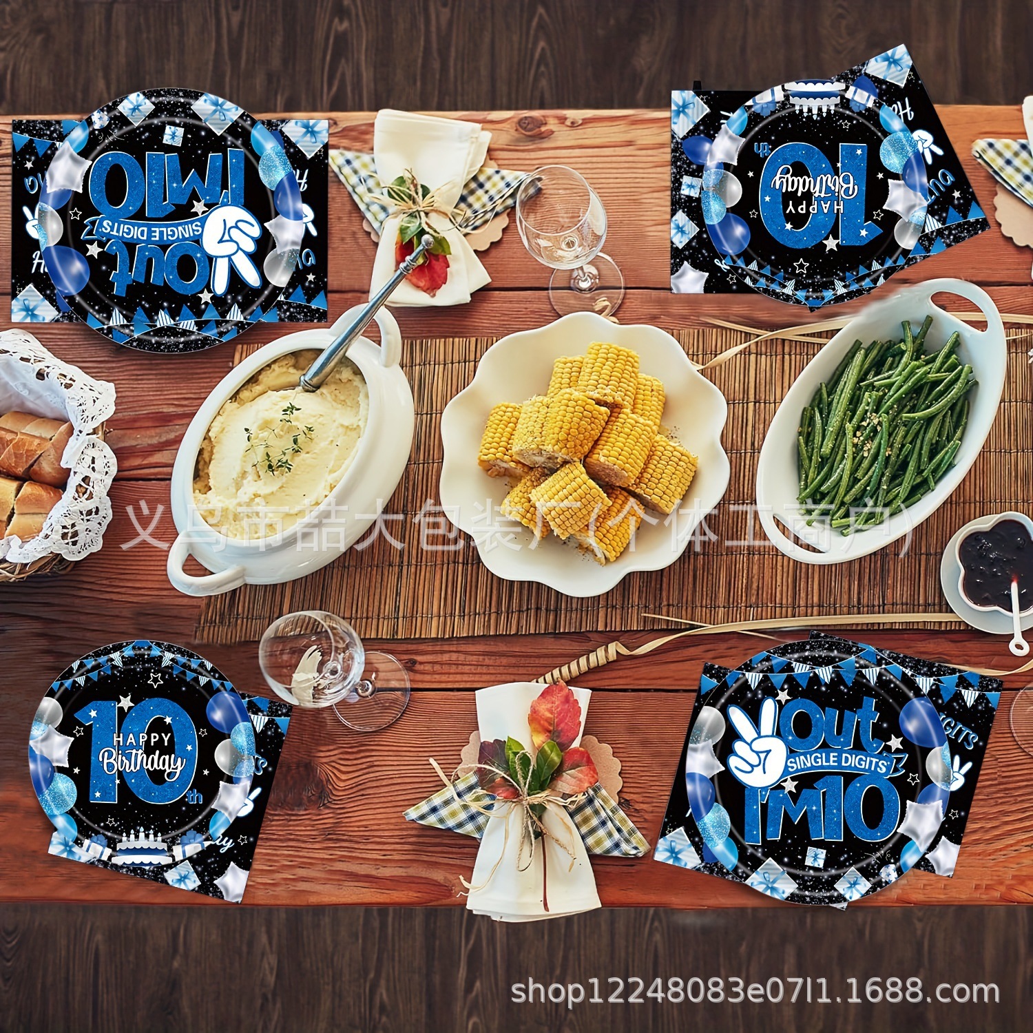 진한 파란색 소년 풍선 10 세 테마 파티 일회용 식기 세트 10 세 종이 접시 티슈 파티 장식