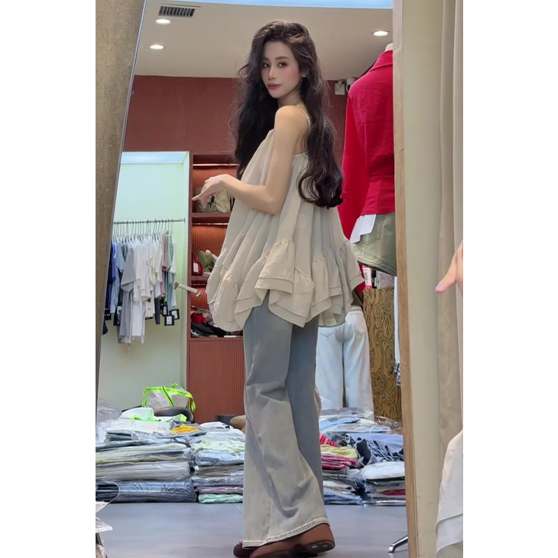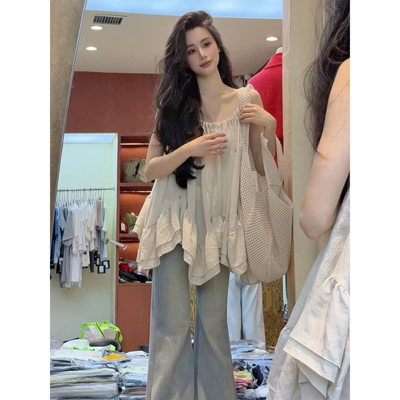 슬림 청바지 투피스 세트와 함께 러플 헴 슬링 탑이있는 2025 년 여름 새로운 한국식 우아한 착용스토어 가기