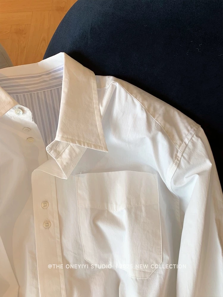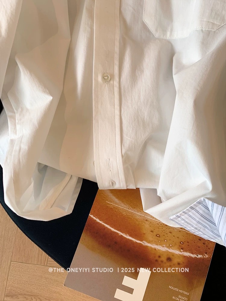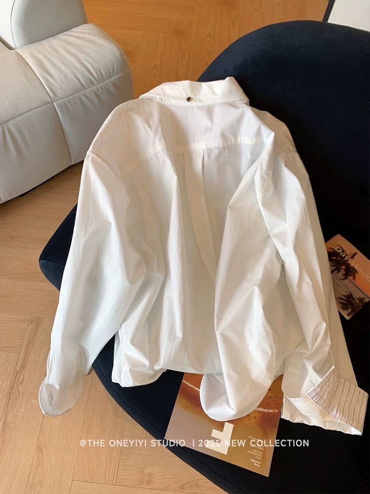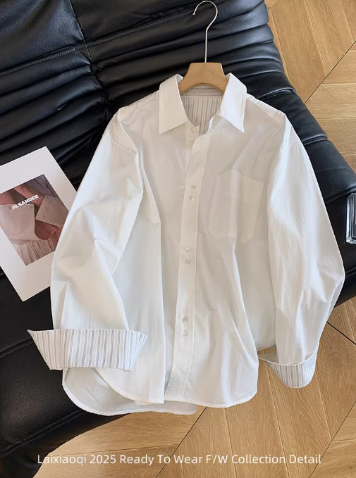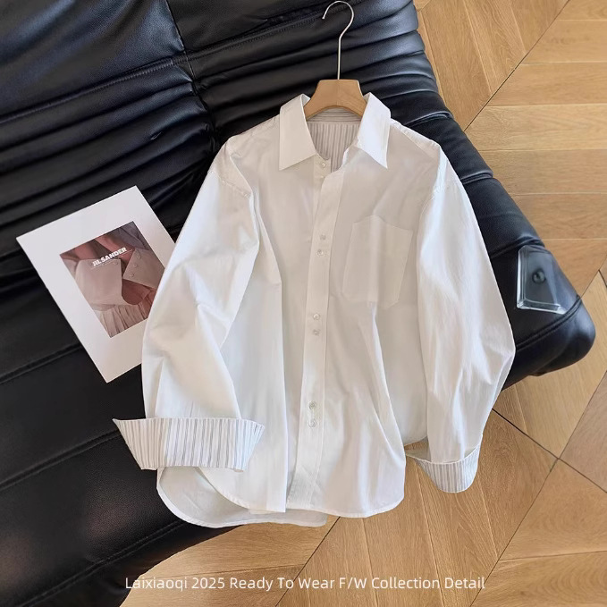 디자인 센스 커프 스티칭 스트라이프 폴로 칼라 화이트 셔츠 여성의 2025 봄 새로운 우아한 나이 감소 웨스턴 스타일 셔츠스토어 가기