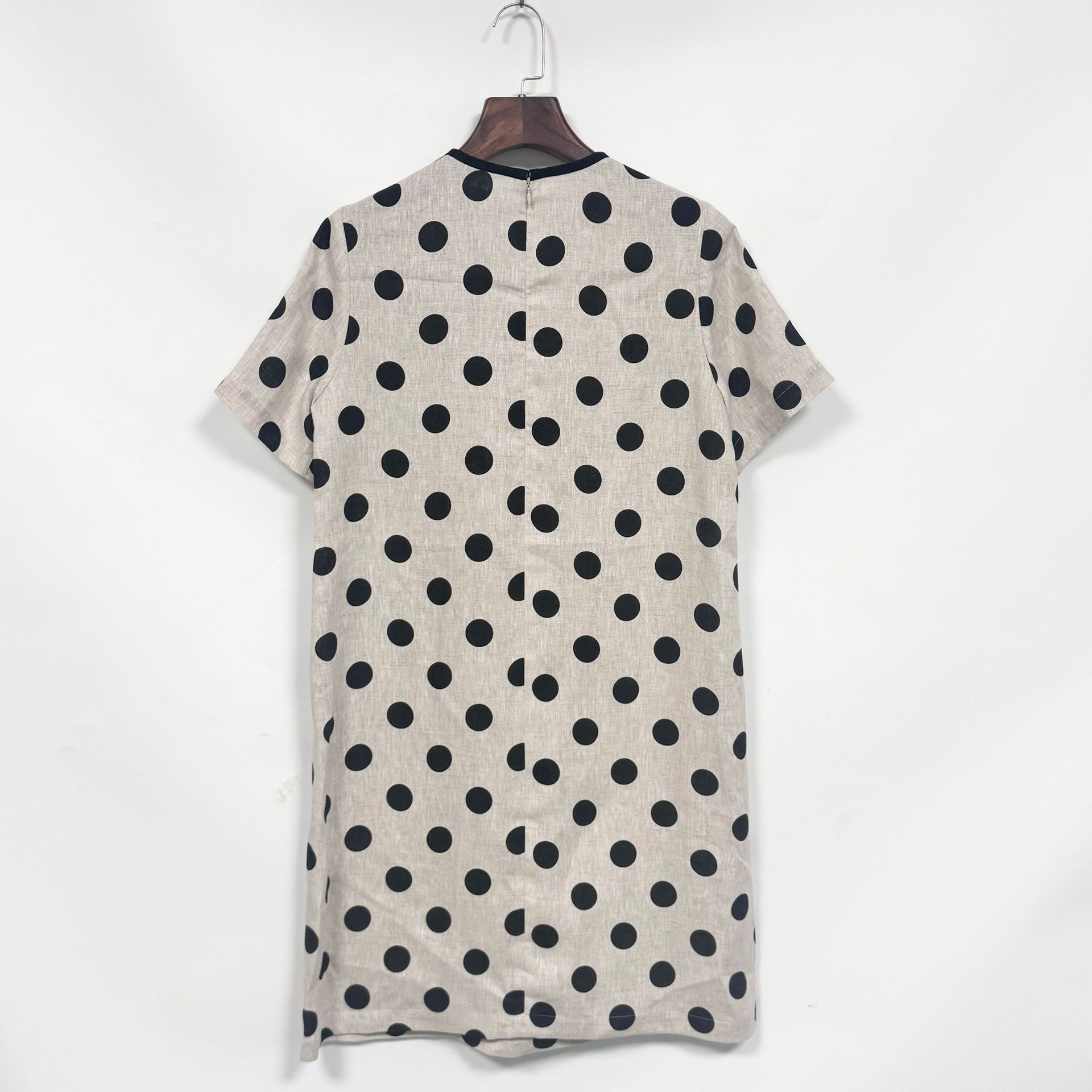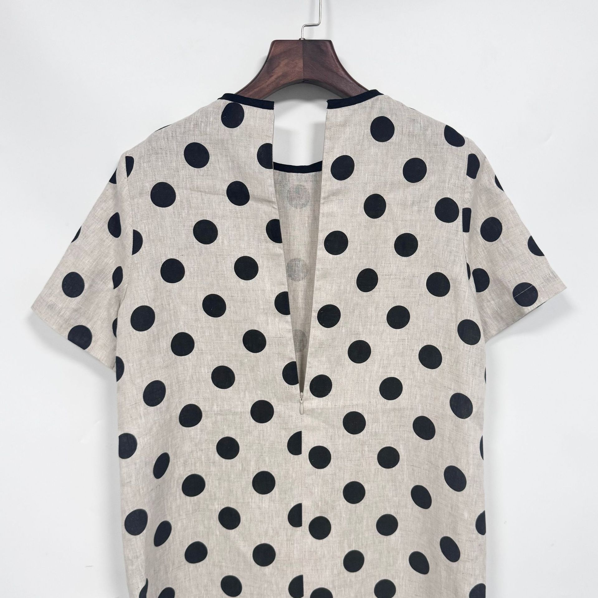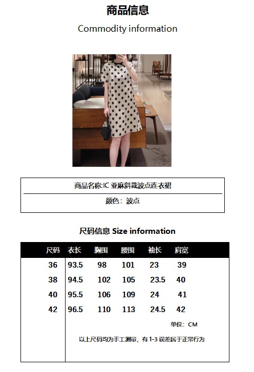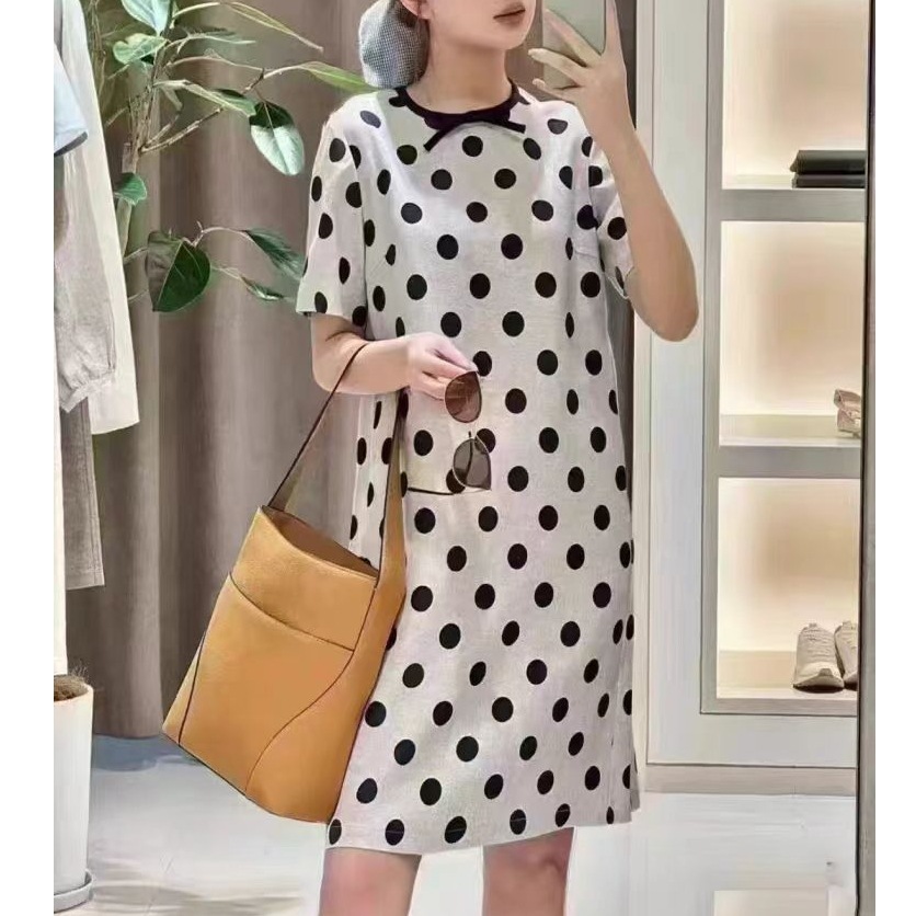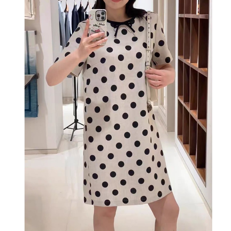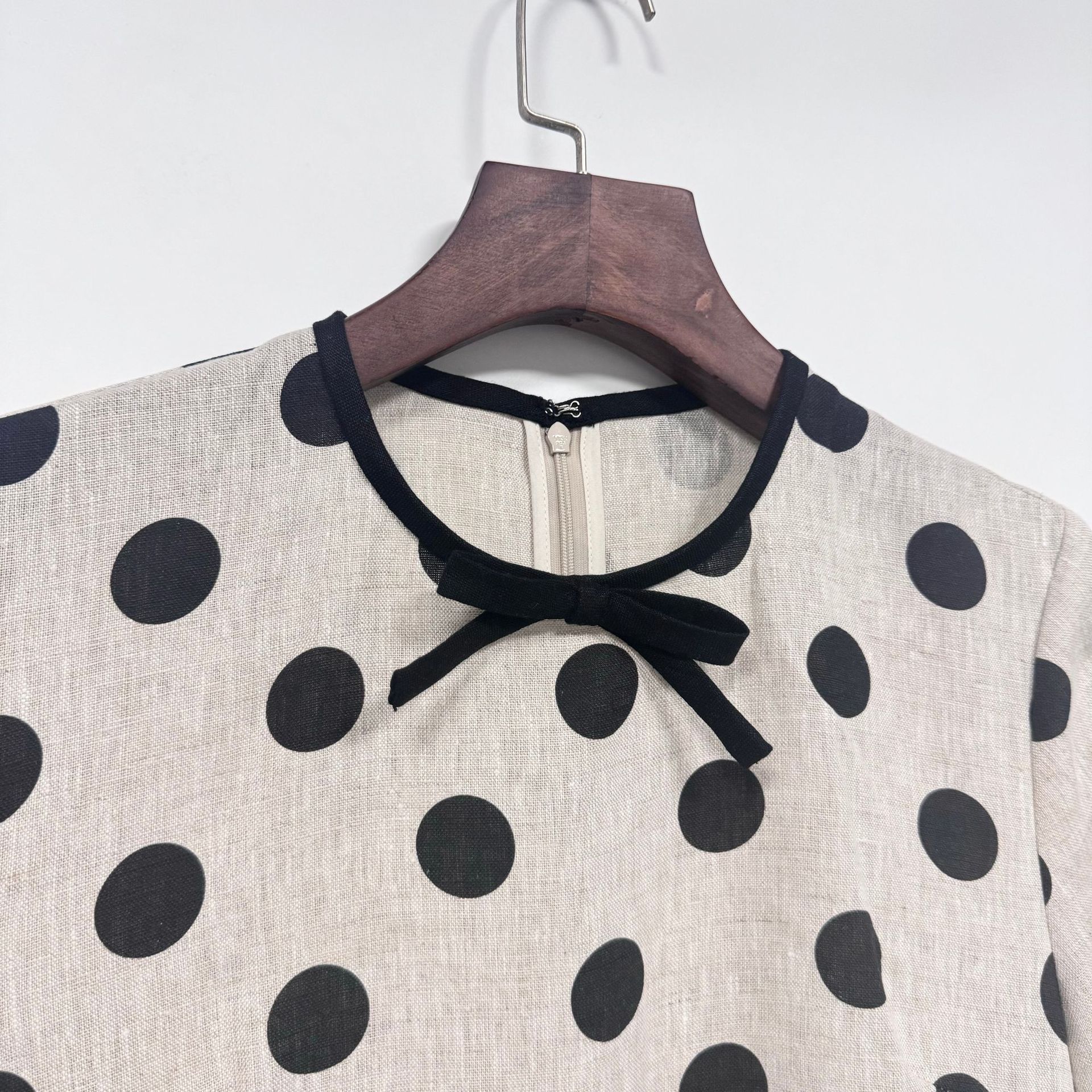 IC25 여름 새로운 간단한 캐주얼 트윌 린넨 짧은 소매 라운드 넥 보우 폴카 도트 원피스스토어 가기