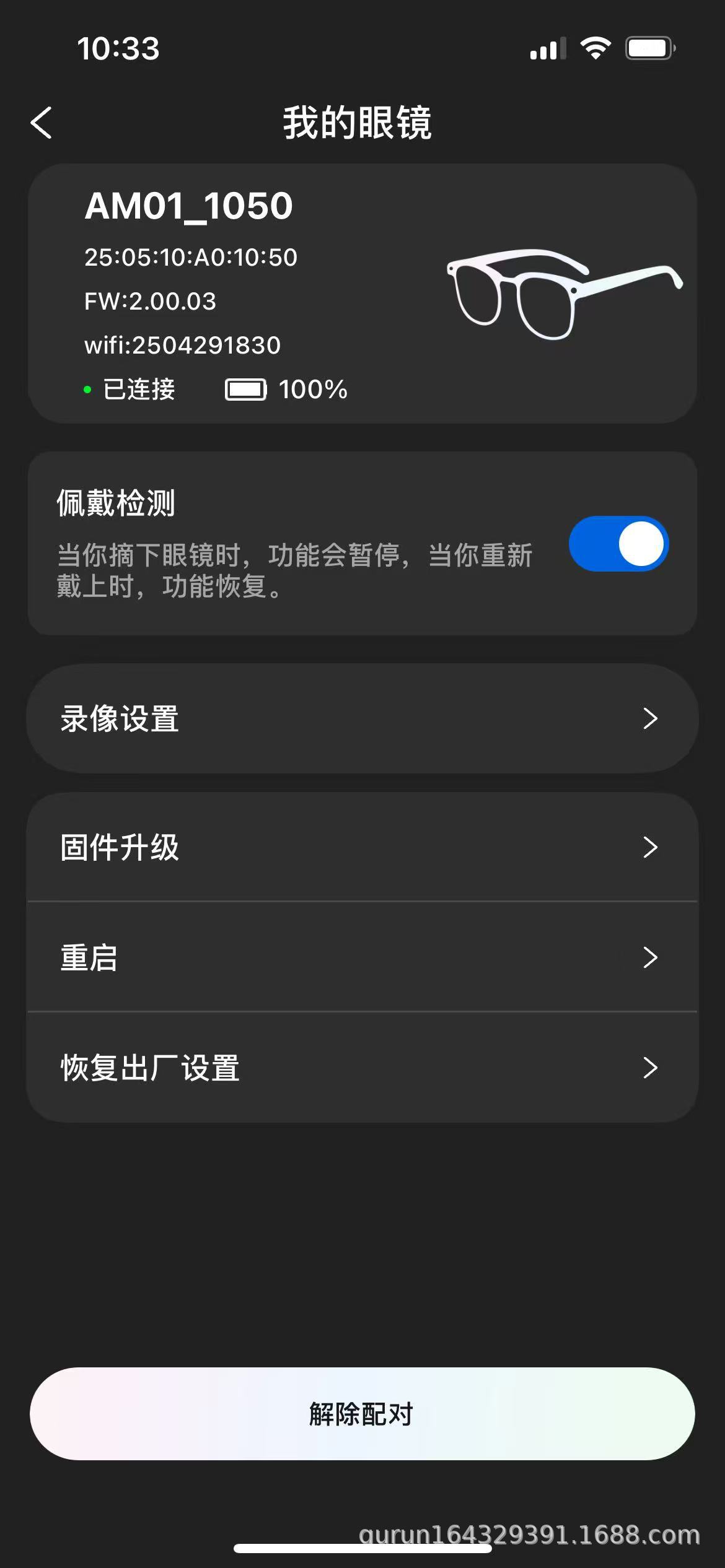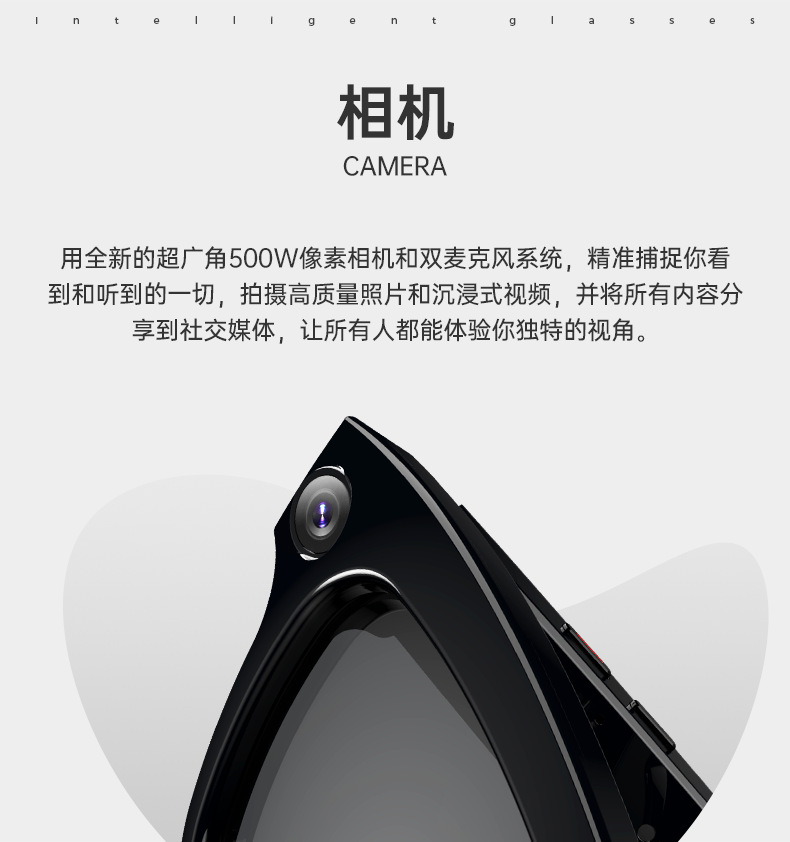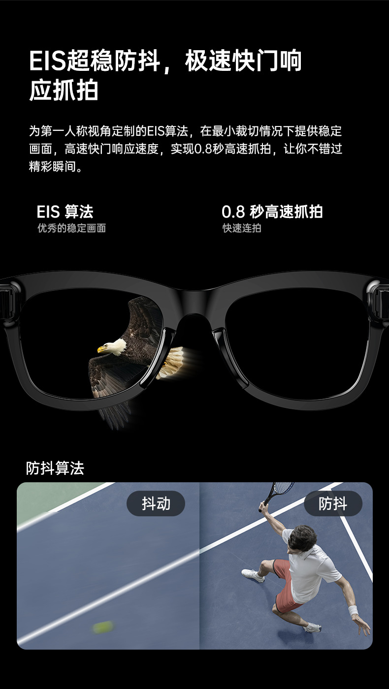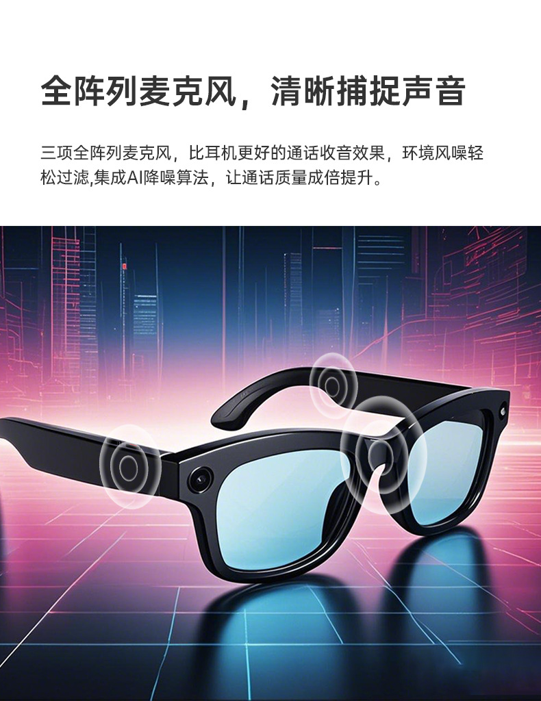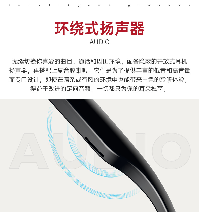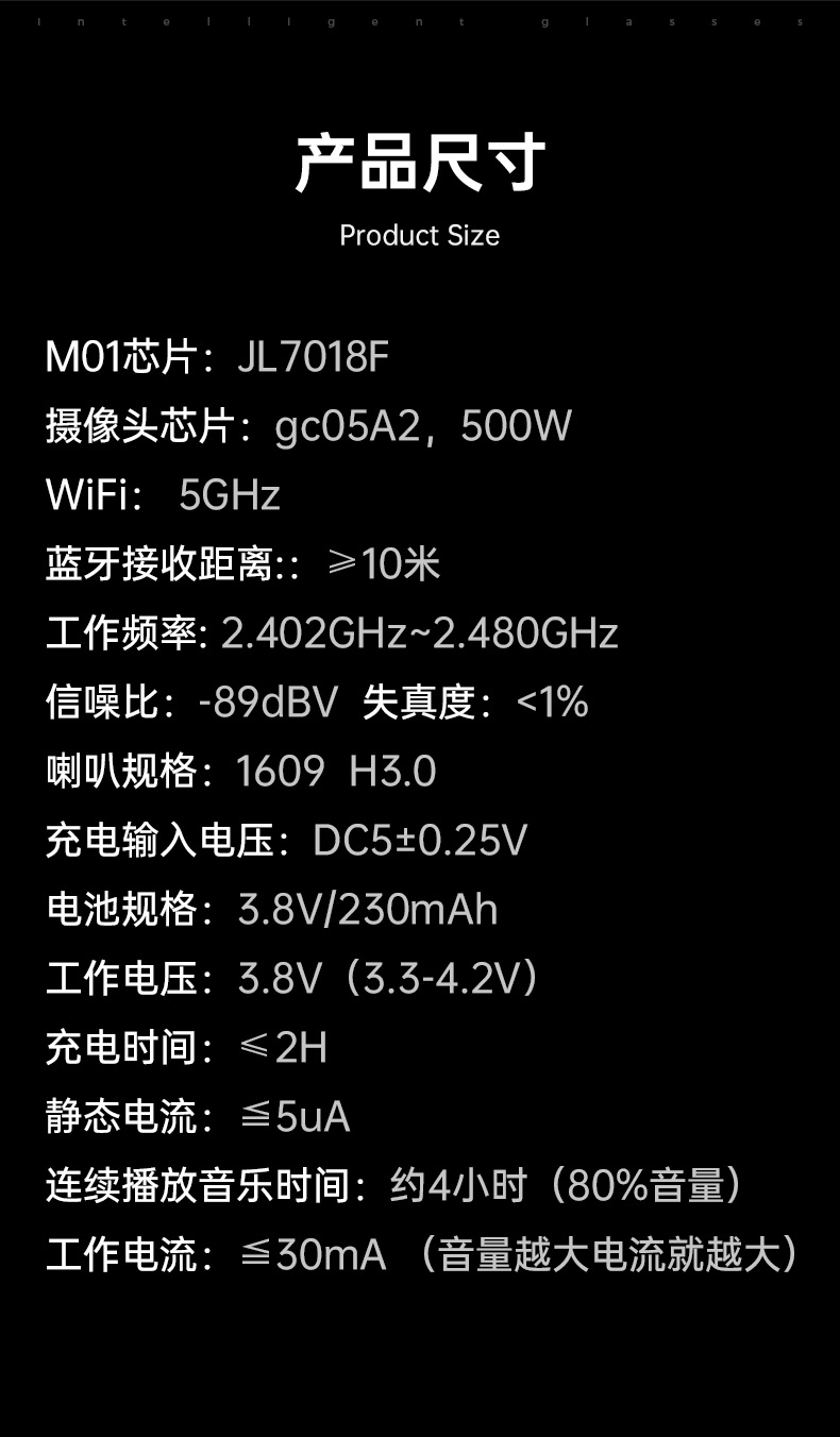 支持功能:语音唤醒,音乐播放,音乐控制,接打电话,拍摄,接入Chat GPT大模型,看图识物,实时翻译等,拍摄防抖,wifi传输,双麦降噪,单点触摸,佩戴检测等。