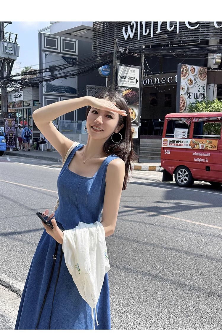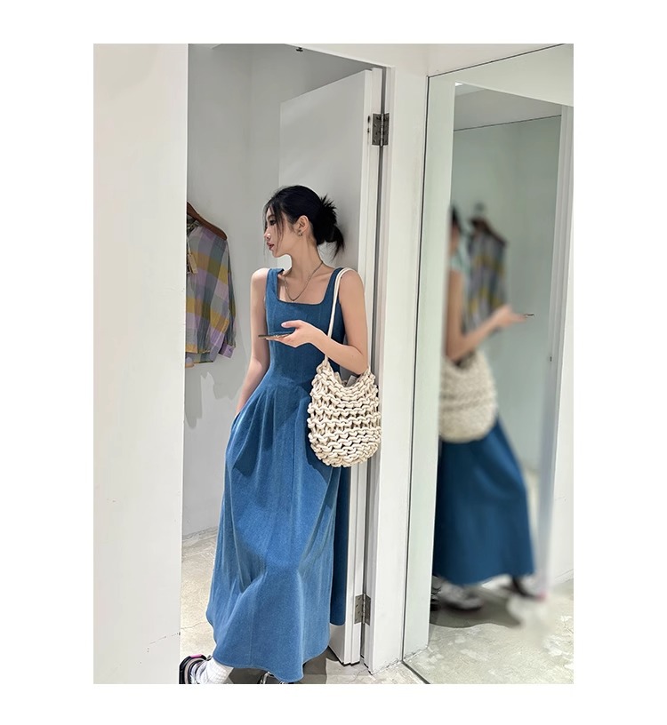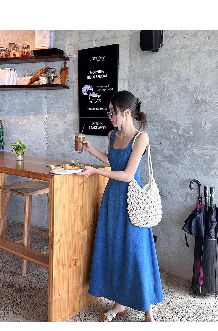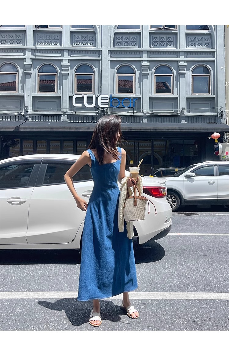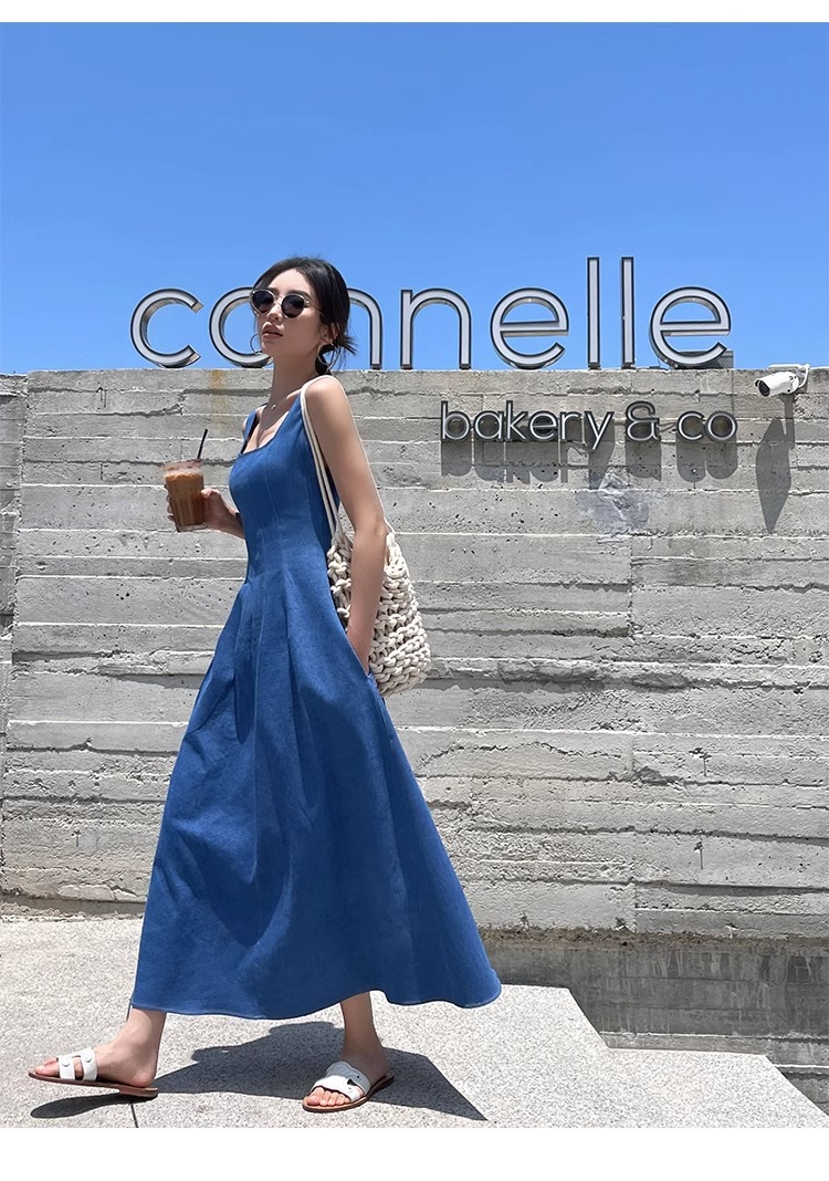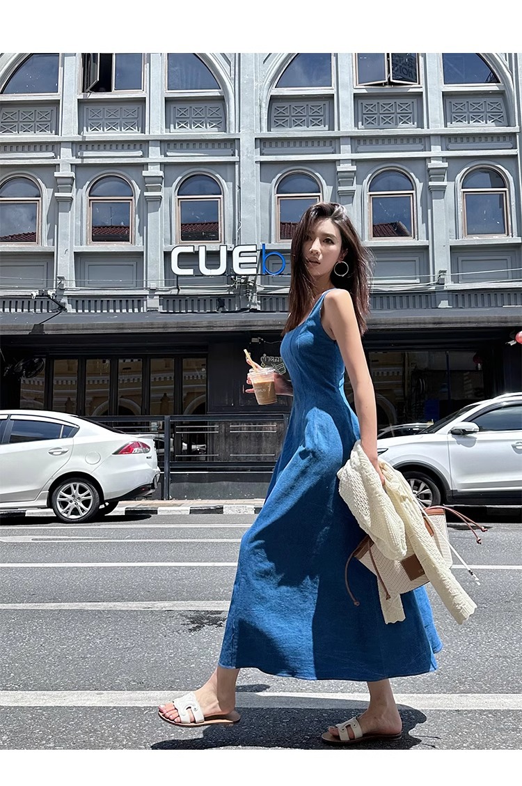 블루 데님 슬링 원피스 여름 여성 프랑스 스타일 우아한 허리 슬리밍 민소매 조끼 원피스 휴일 긴 원피스스토어 가기