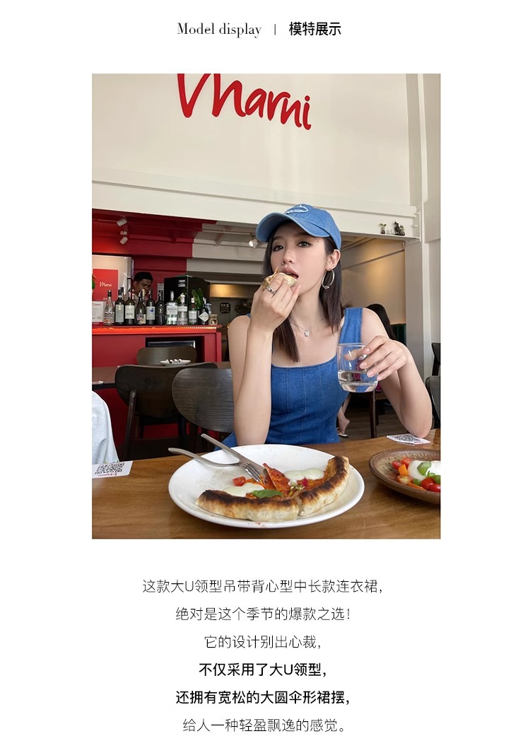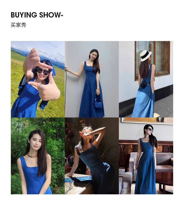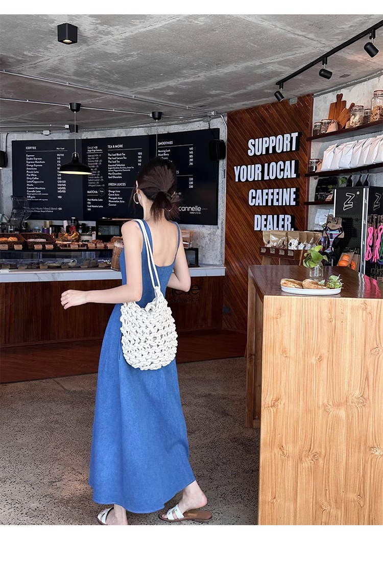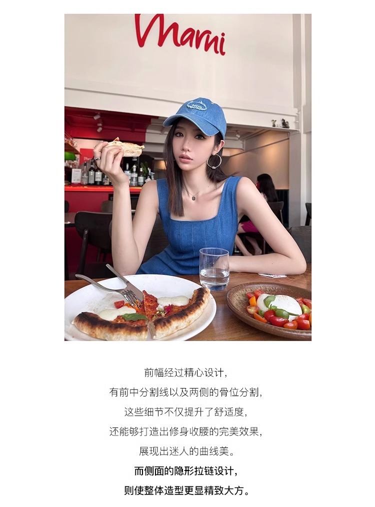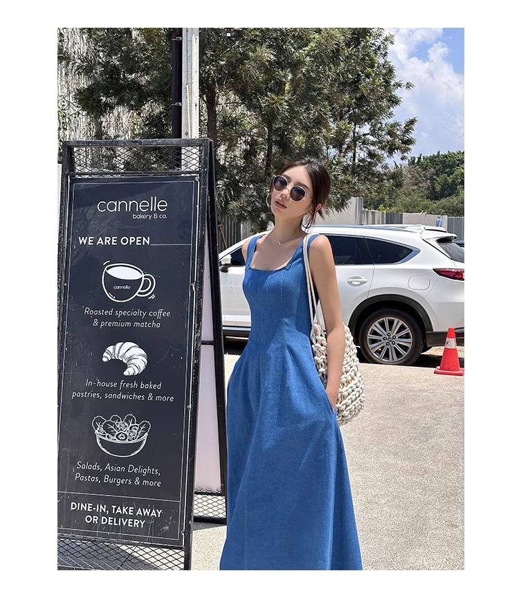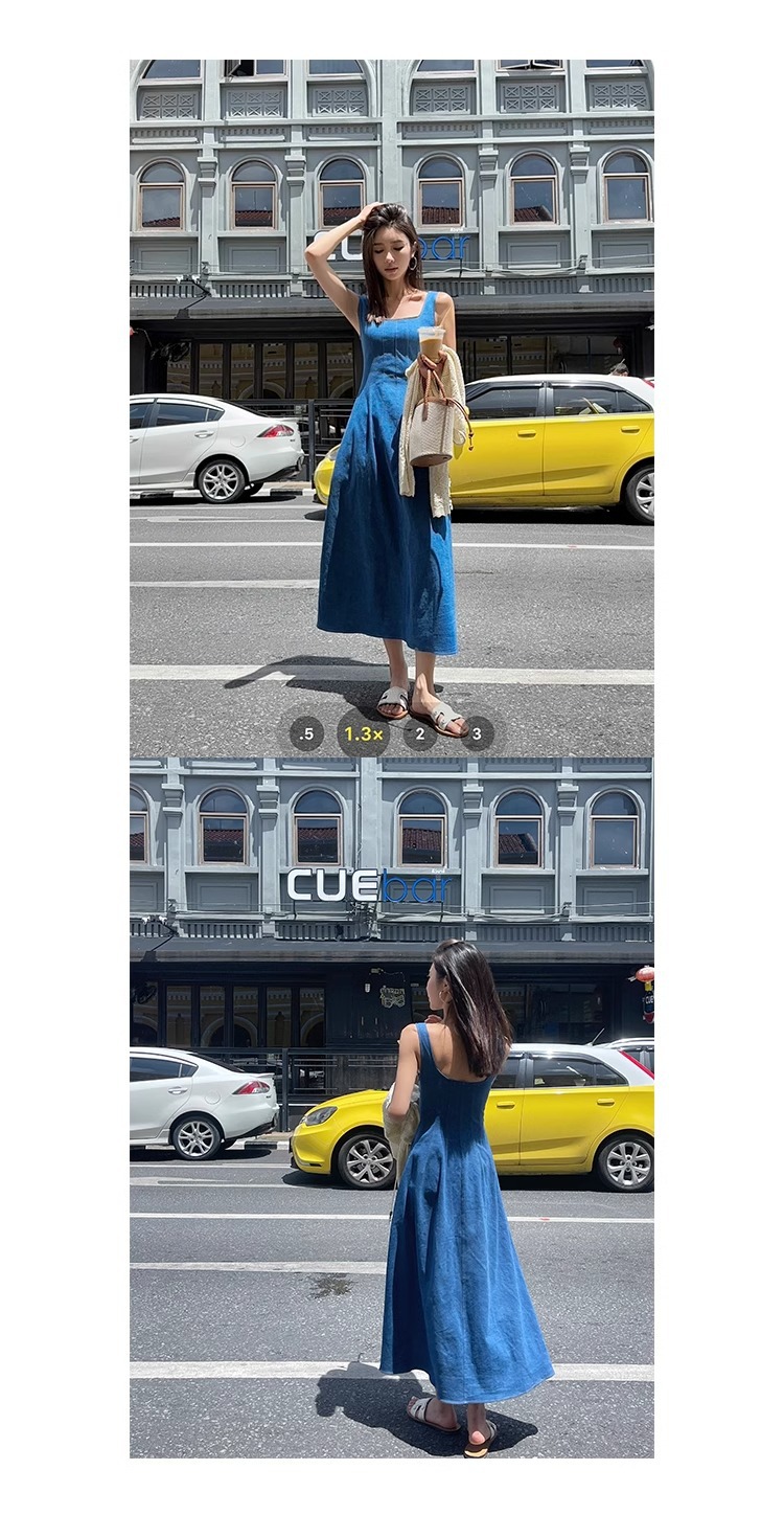 블루 데님 슬링 원피스 여름 여성 프랑스 스타일 우아한 허리 슬리밍 민소매 조끼 원피스 휴일 긴 원피스스토어 가기