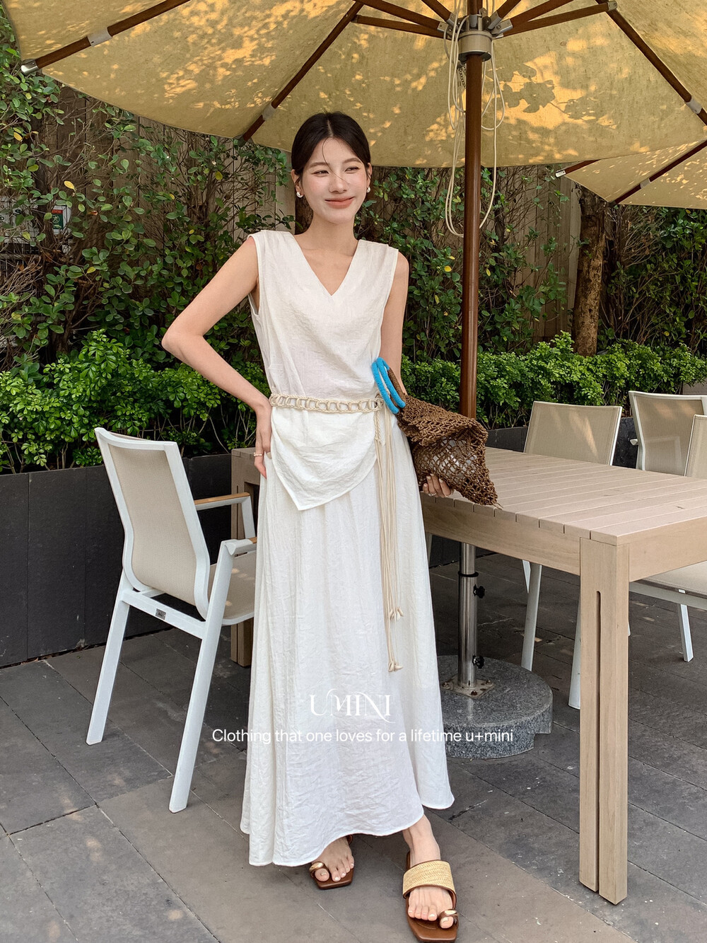 U 미니 13 라인 7092 새로운 프랑스 스타일 대마 V-넥 벨로 허리 로프 작은 셔츠 고무 벨트 허리 스커트 세트