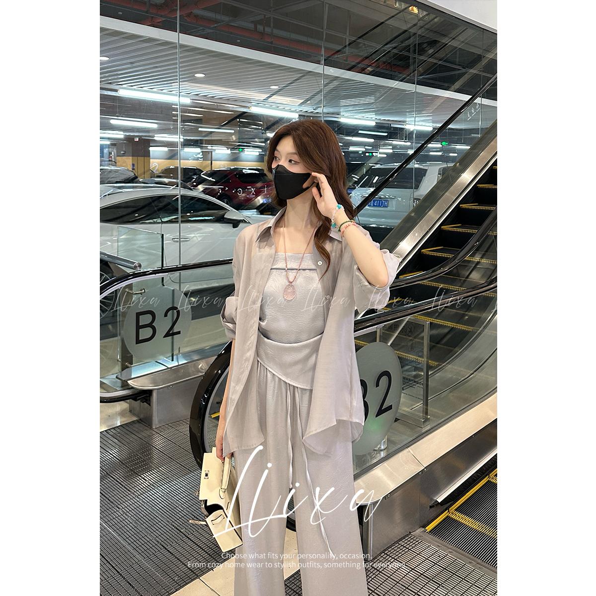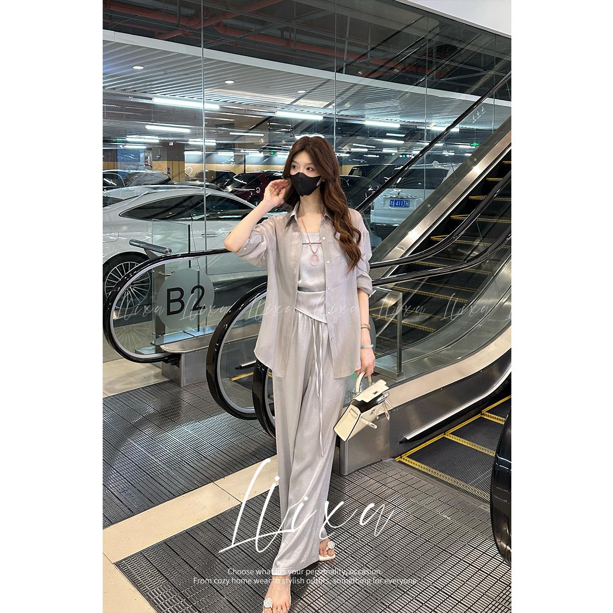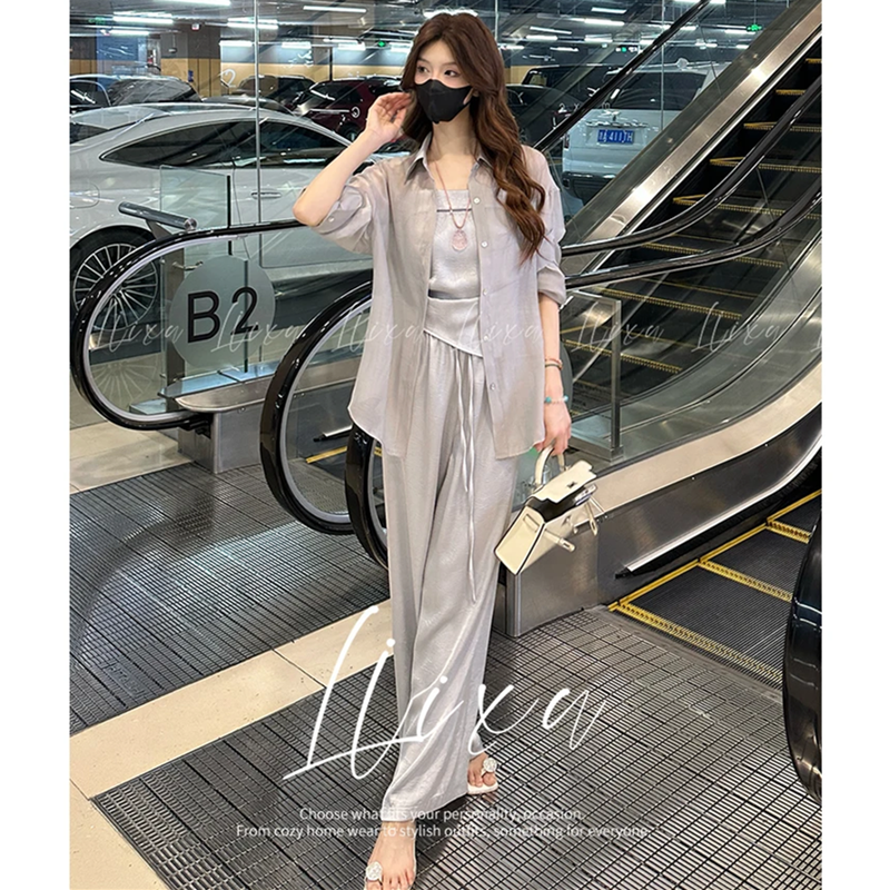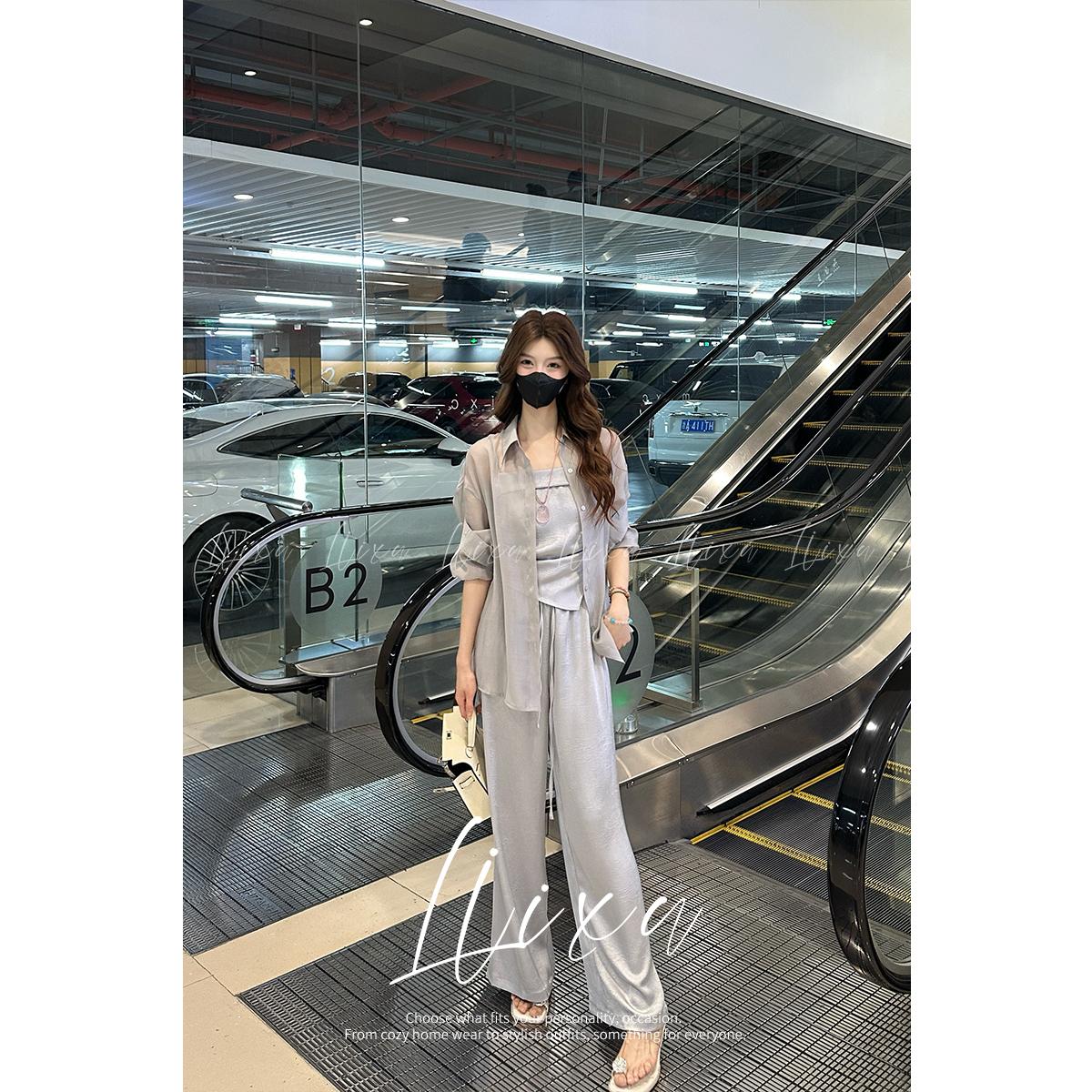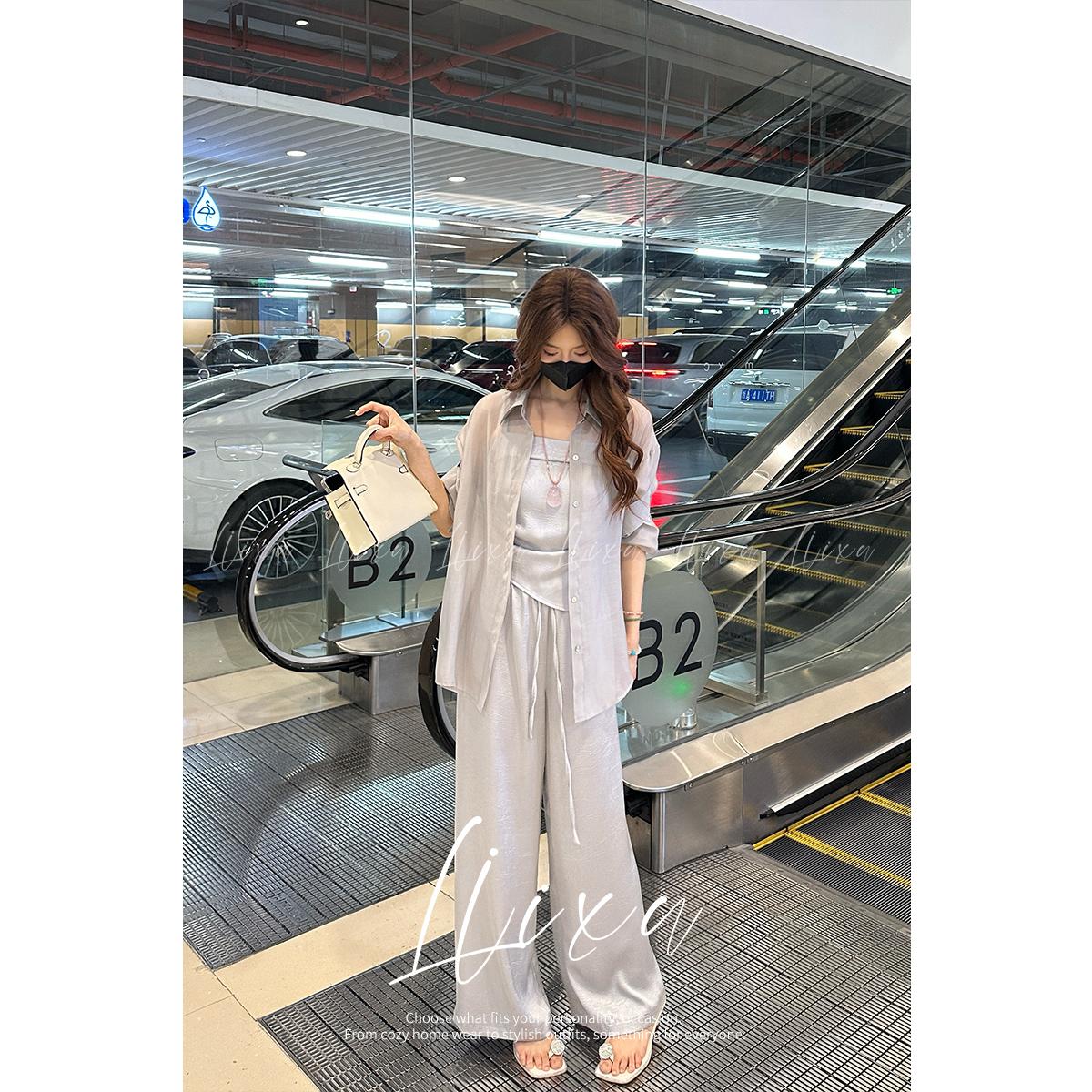 아이스 실크 패션 세트 여성 여름 새해 올해 인기있는 슬링 셔츠 와이드 레그 바지 작은 우아한 3 피스 세트스토어 가기