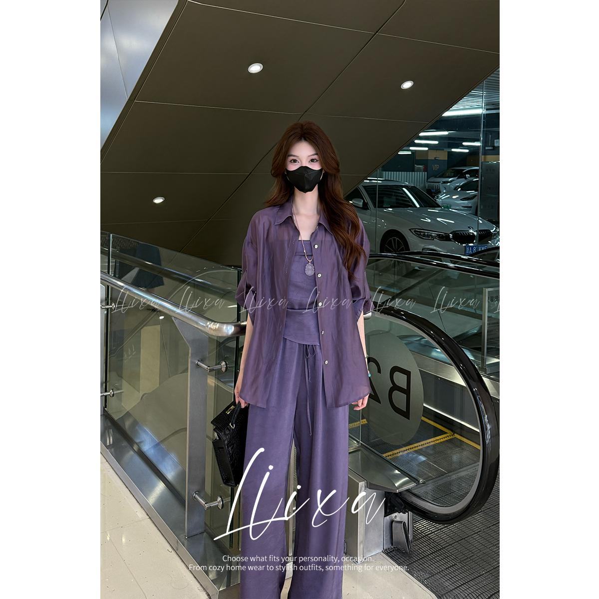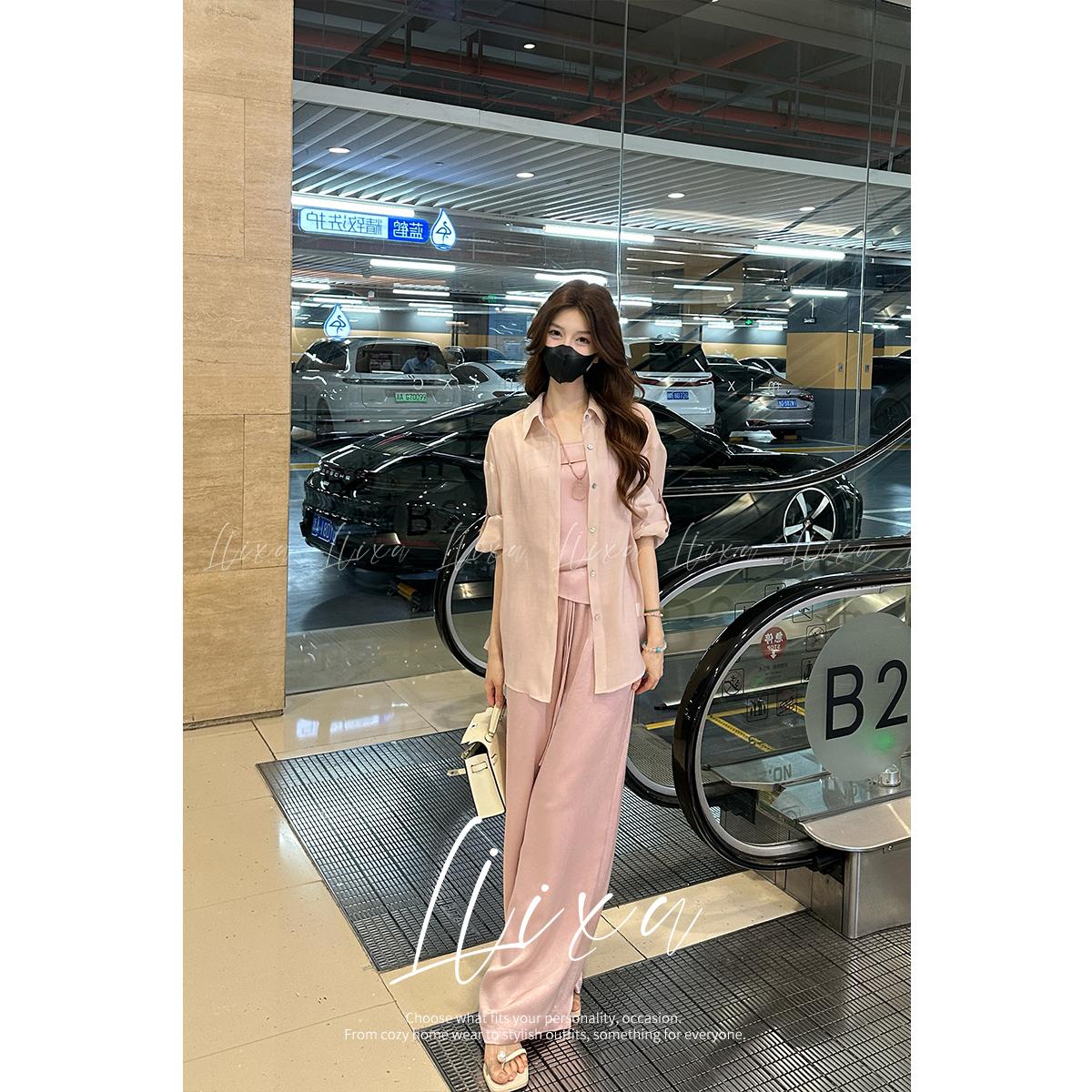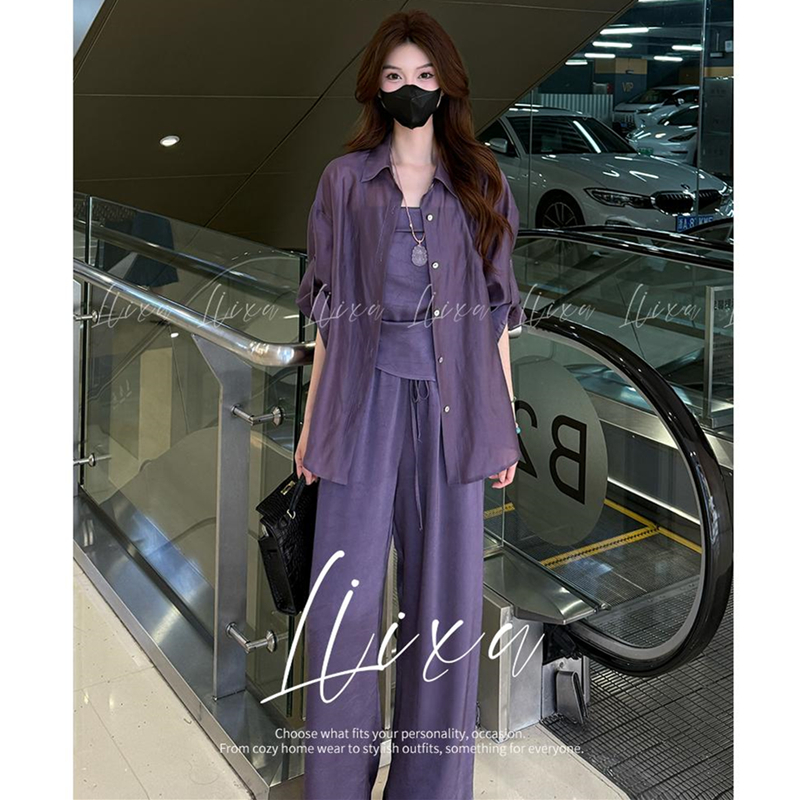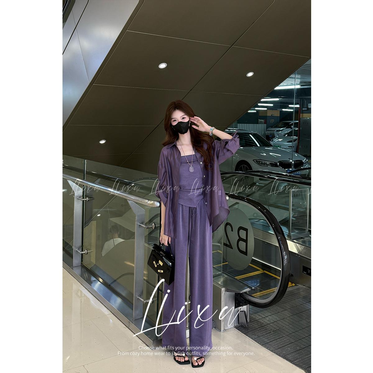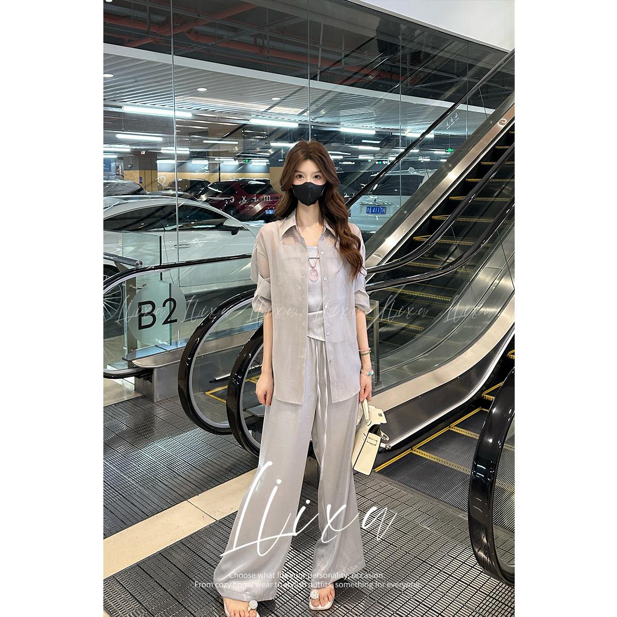 아이스 실크 패션 세트 여성 여름 새해 올해 인기있는 슬링 셔츠 와이드 레그 바지 작은 우아한 3 피스 세트스토어 가기