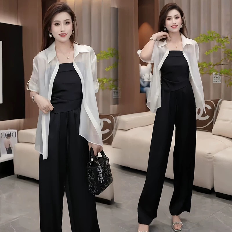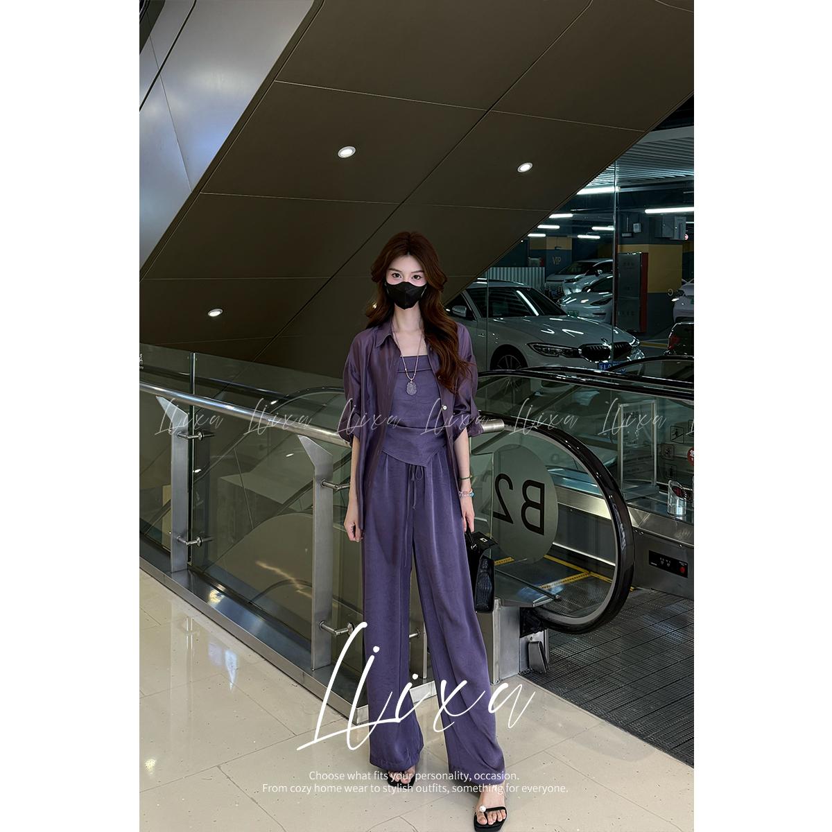 아이스 실크 패션 세트 여성 여름 새해 올해 인기있는 슬링 셔츠 와이드 레그 바지 작은 우아한 3 피스 세트