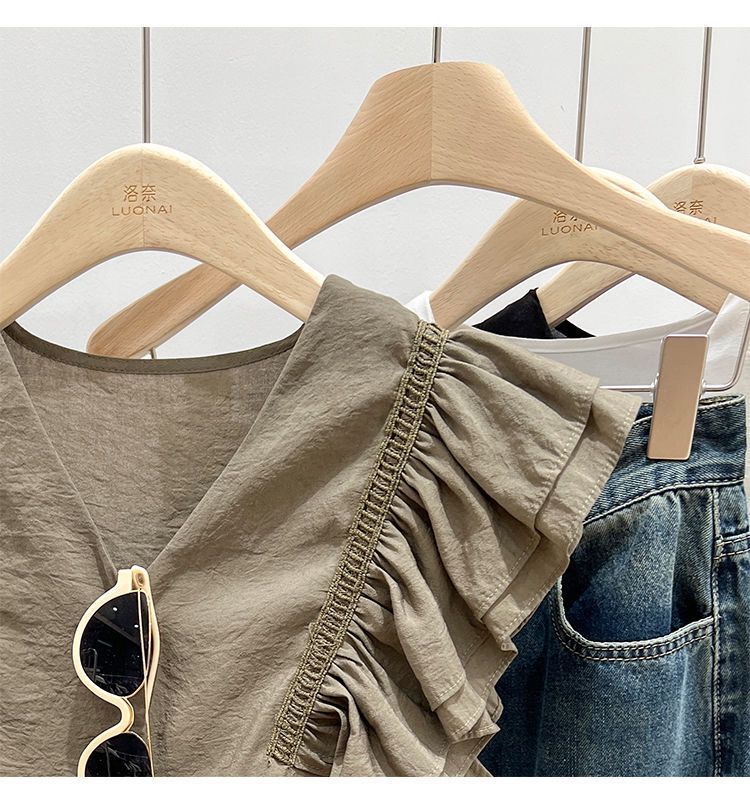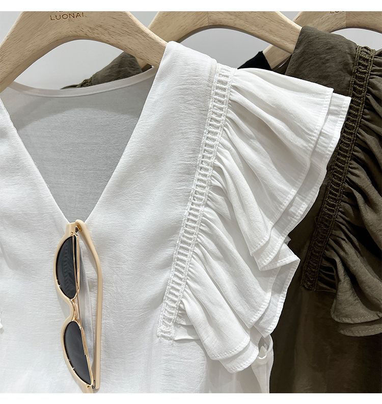 여름 신작 쉬폰 레이스 셔츠 쁘띠 플라잉 슬리브 프렌치 러플 v 넥 쇄골 민소매 탑 여성용스토어 가기