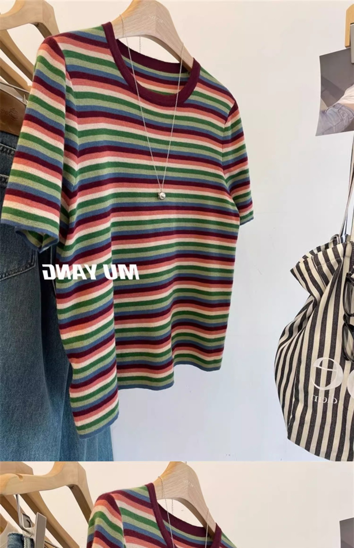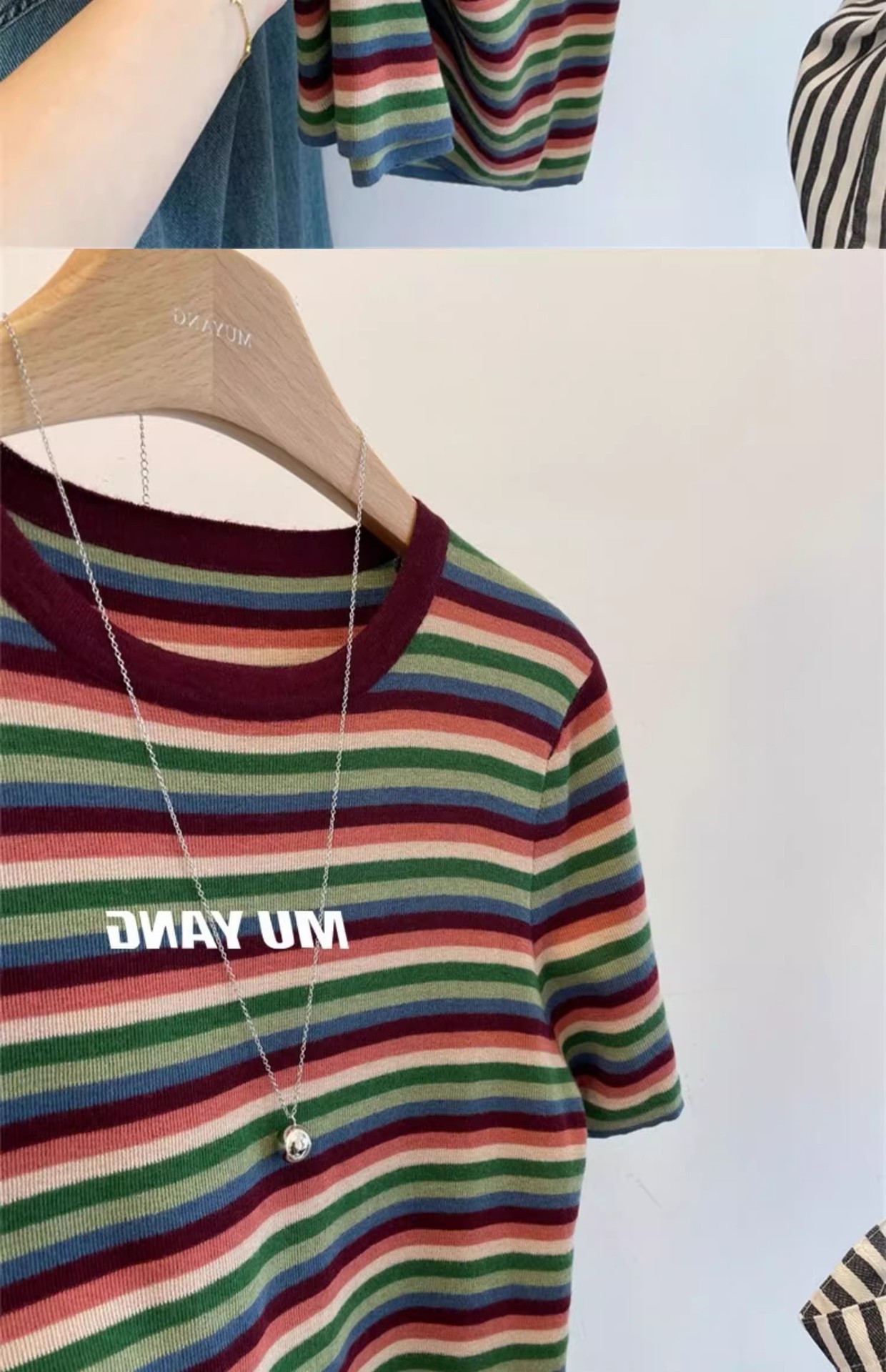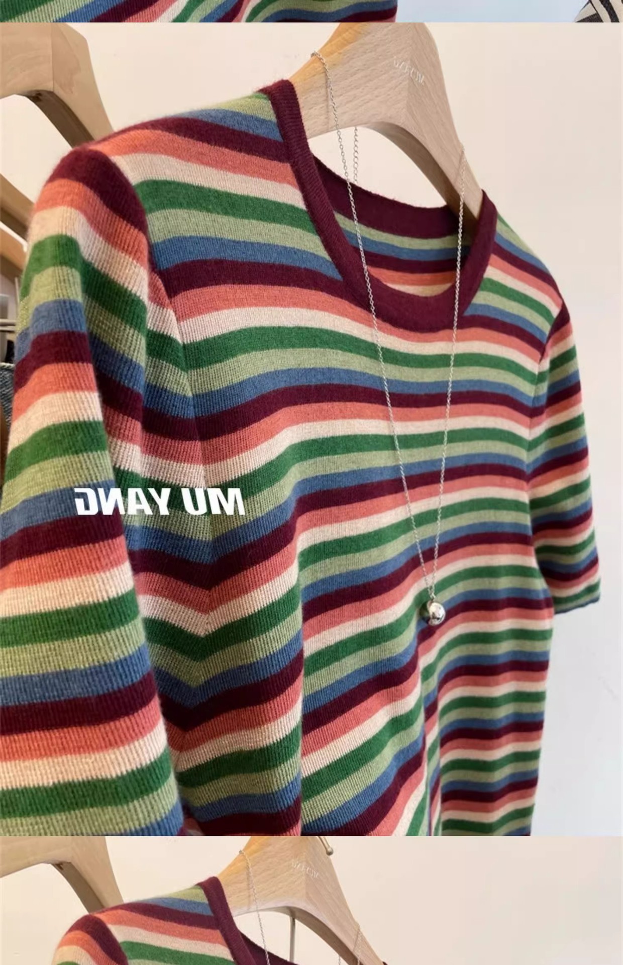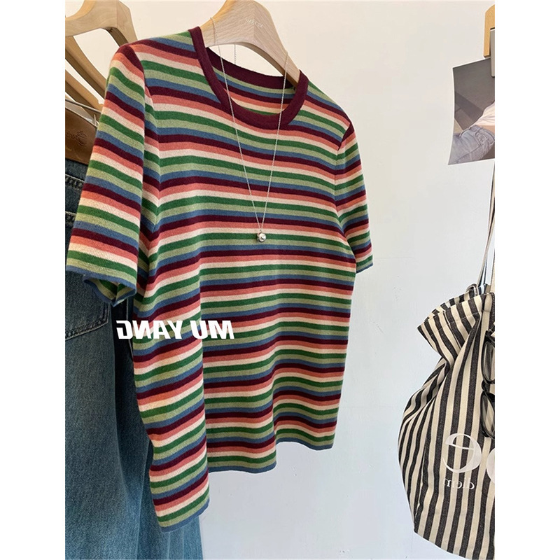 彩虹拼色条纹针织衫女短袖T恤亲肤薄毛衣春秋洋气减龄打底衫上衣