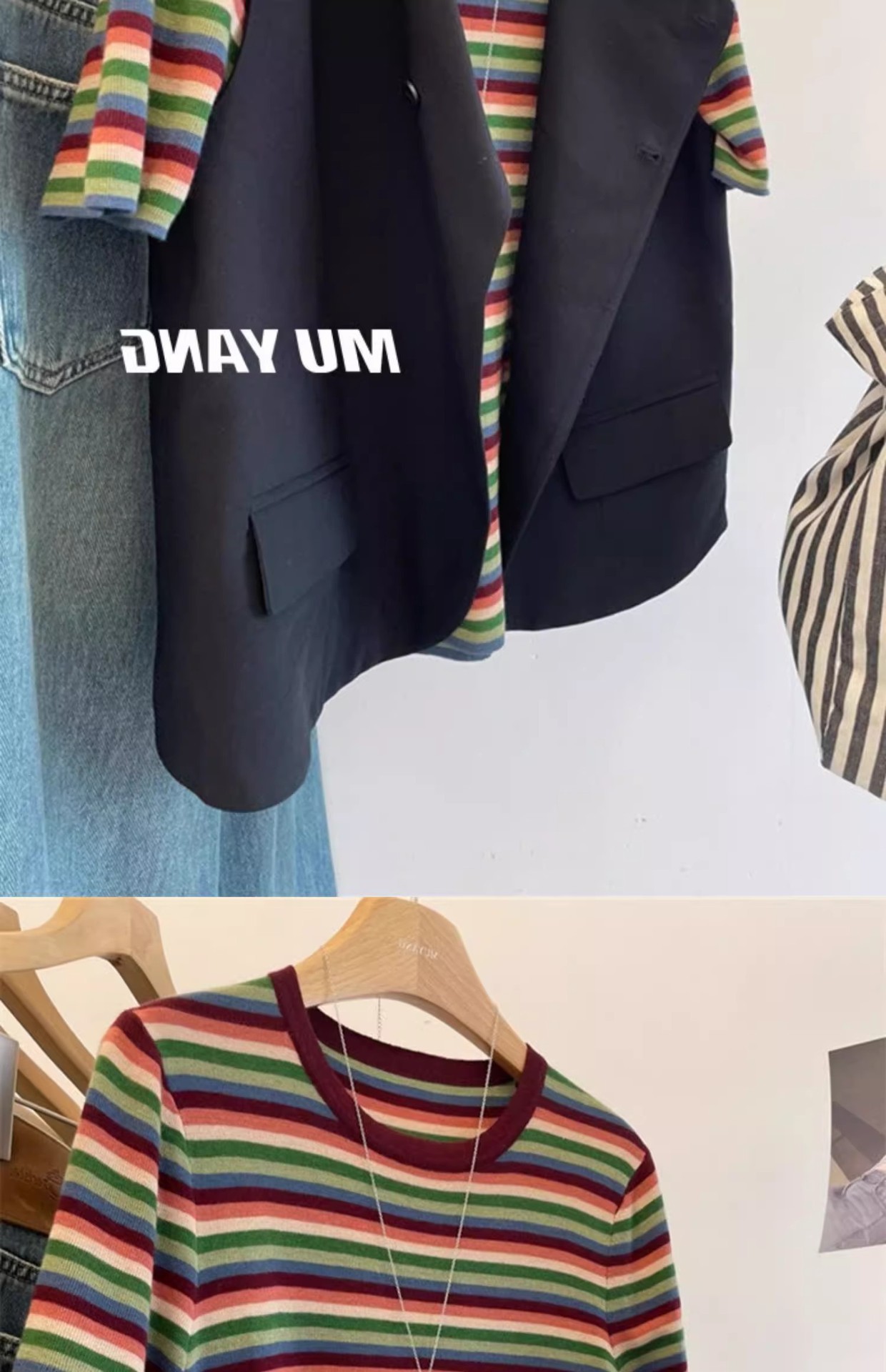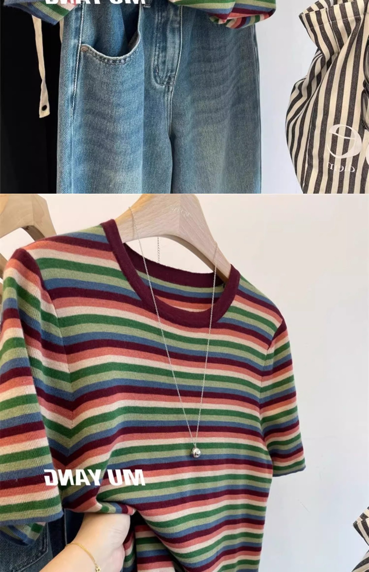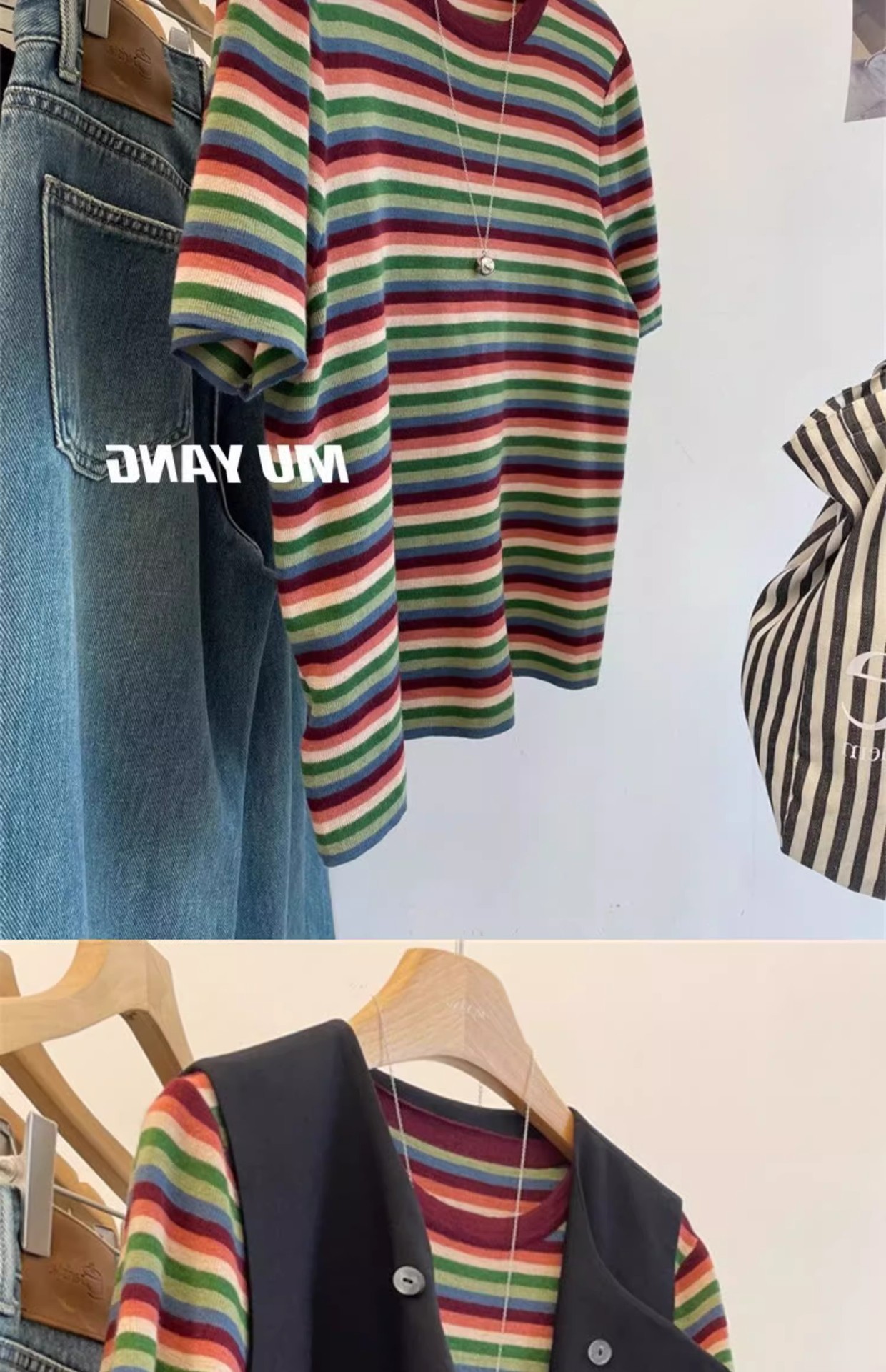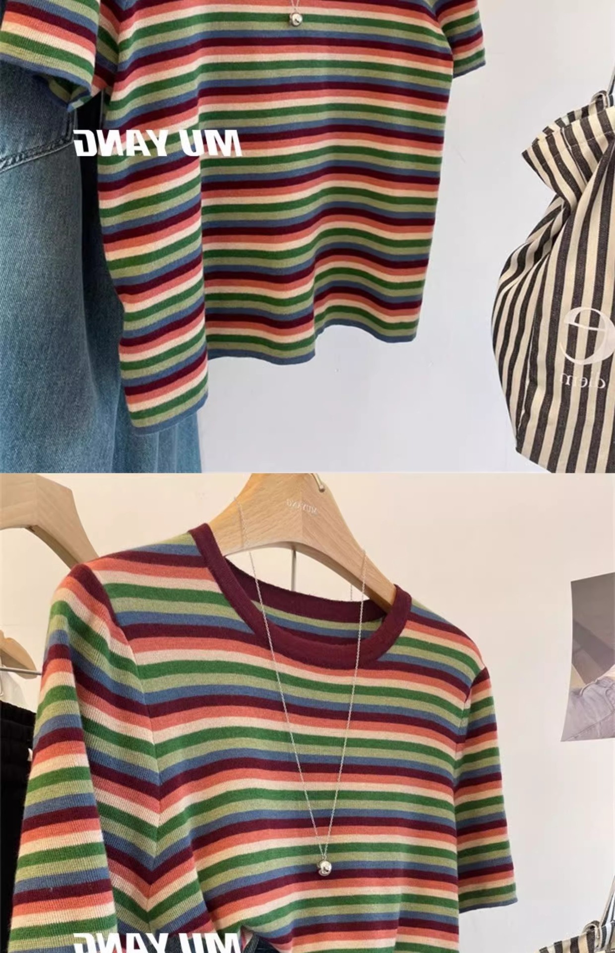 彩虹拼色条纹针织衫女短袖T恤亲肤薄毛衣春秋洋气减龄打底衫上衣