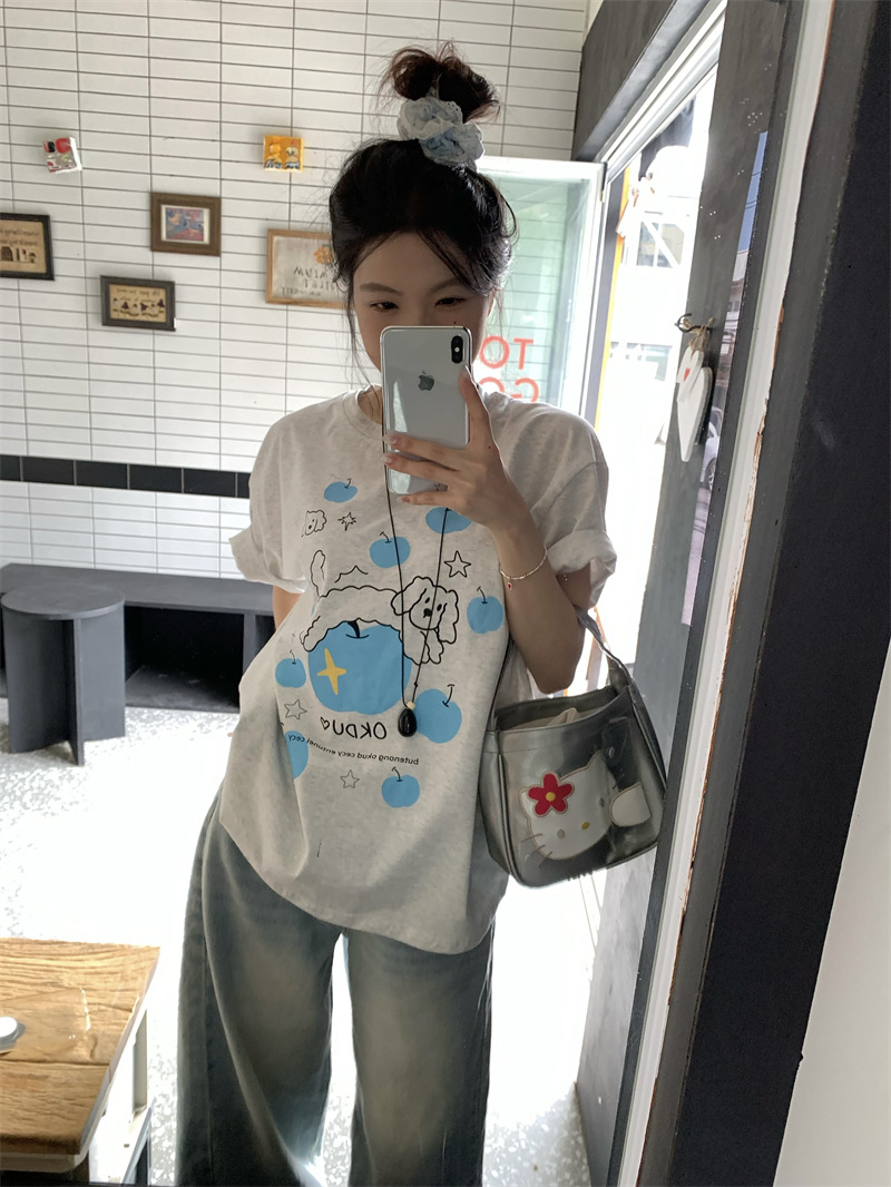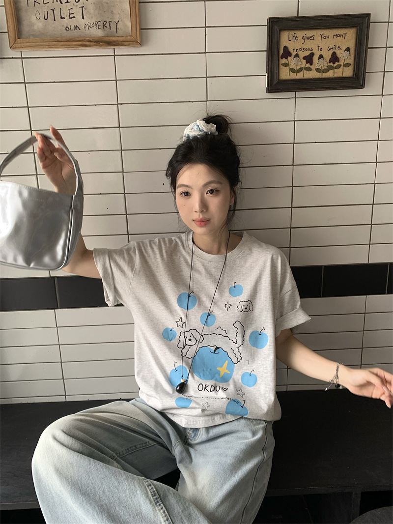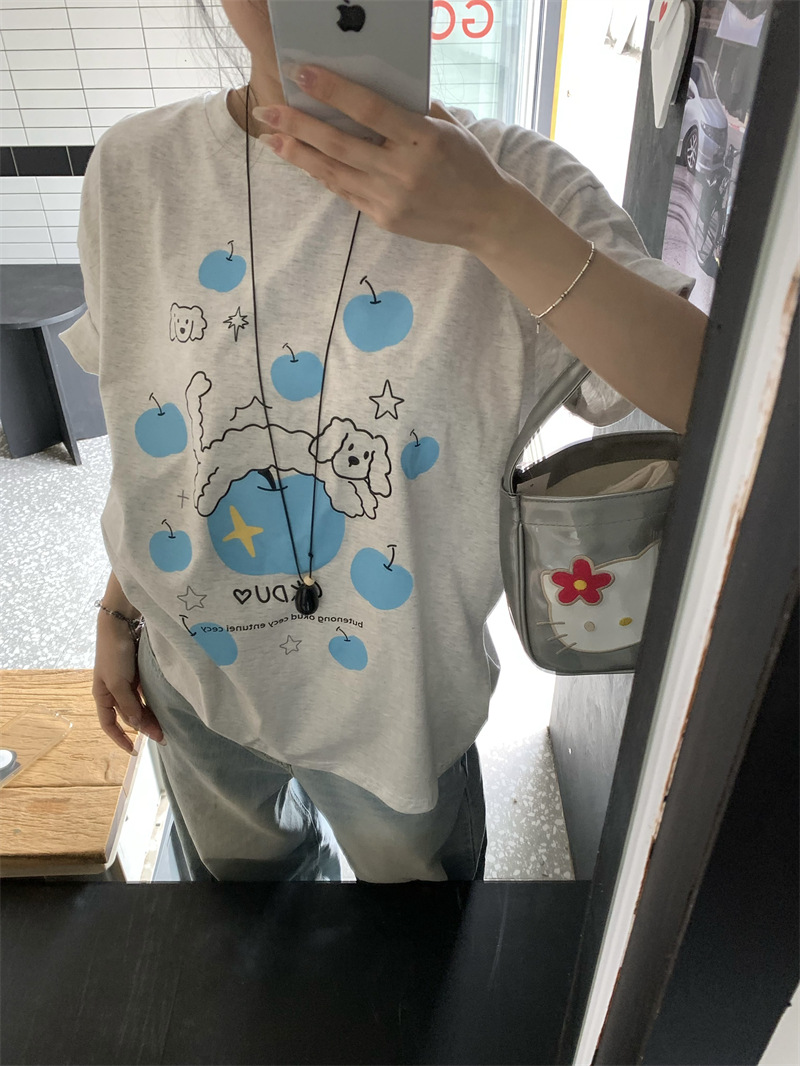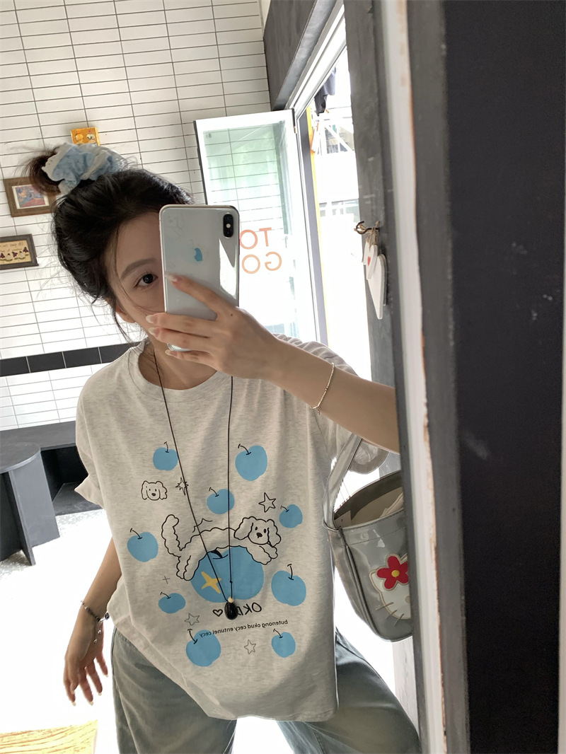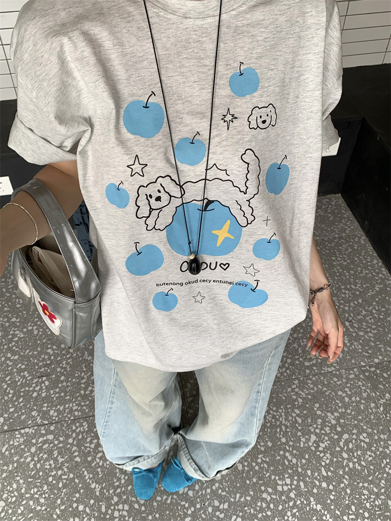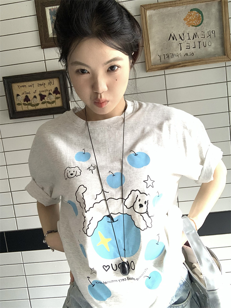 실제 상품 사진~2026년 여름 신상 한국 스타일 사과 강아지 프린트 반팔 티셔츠 여성용 루즈핏 레이지 스타일 상의