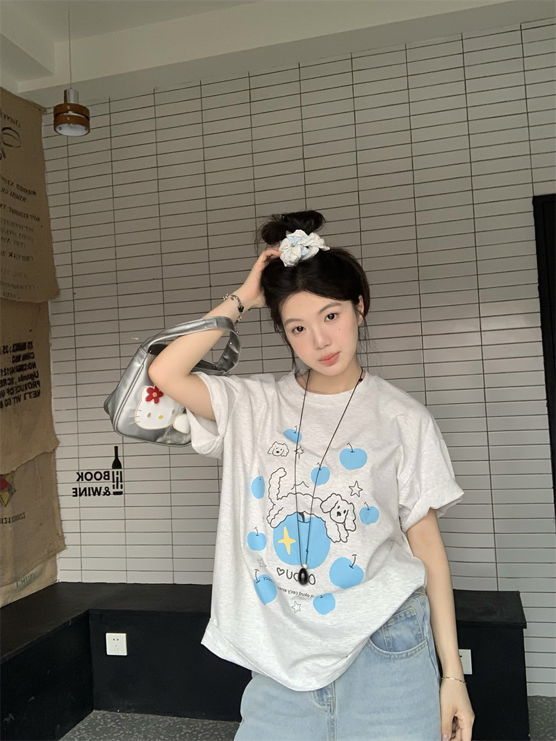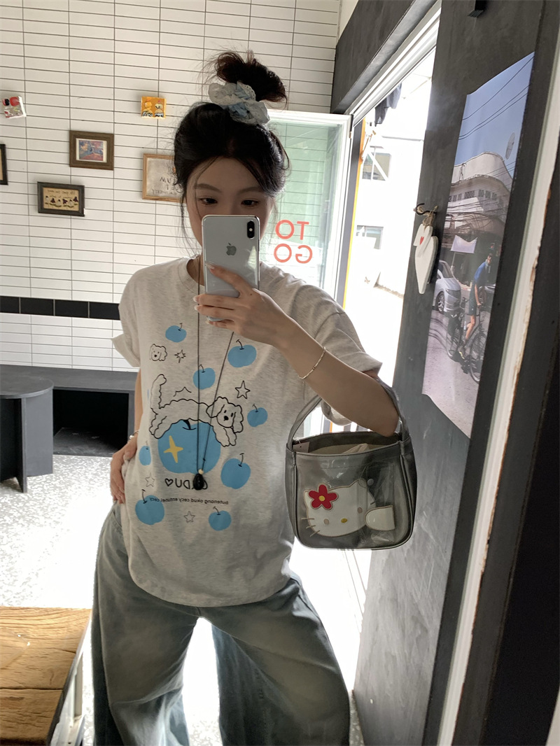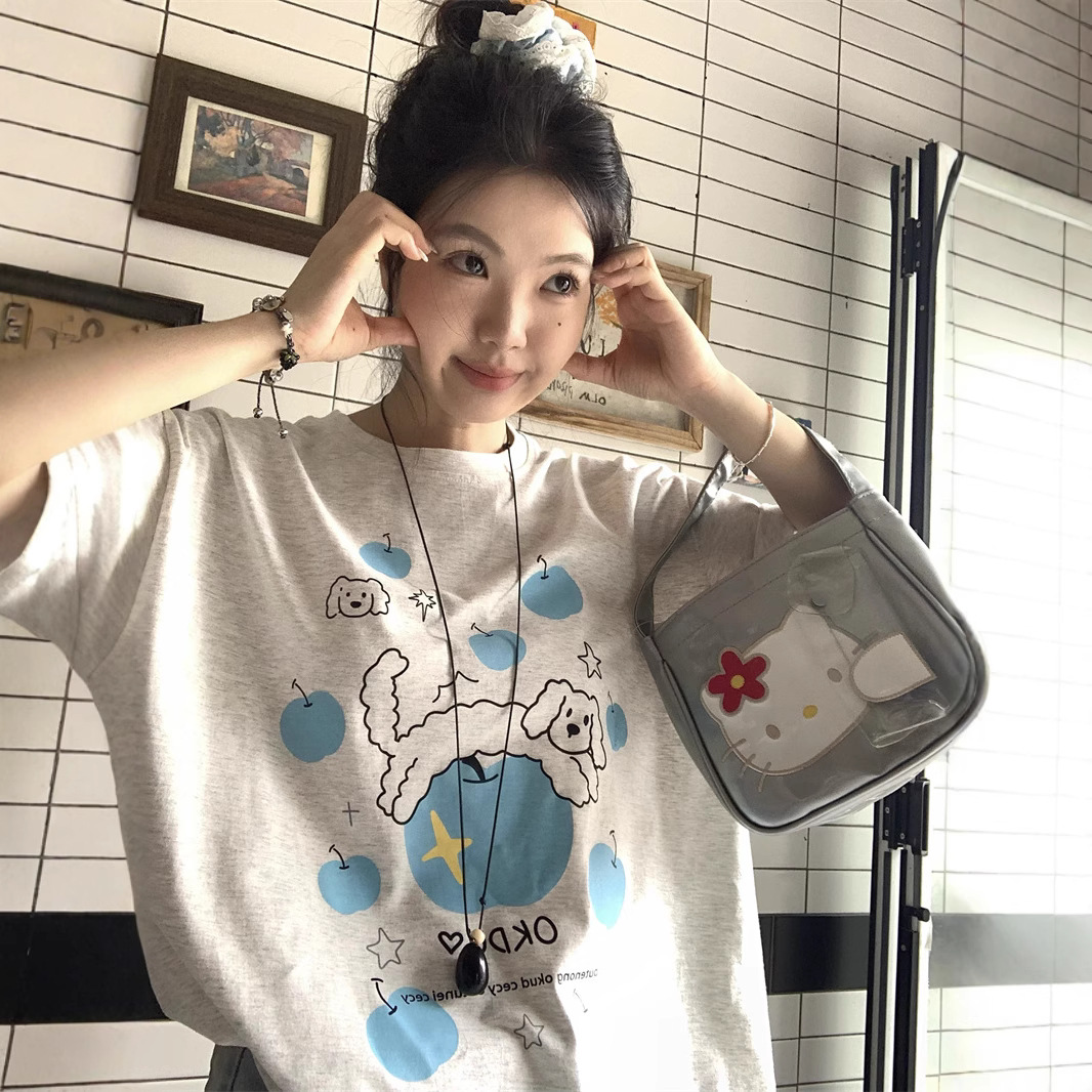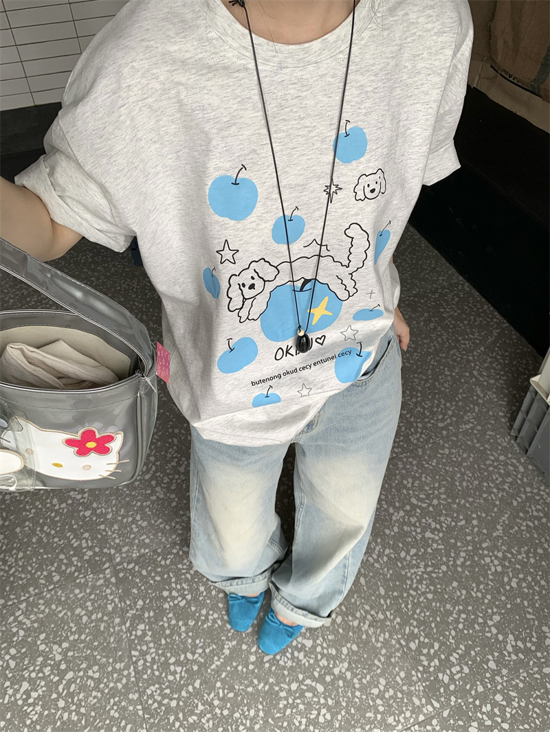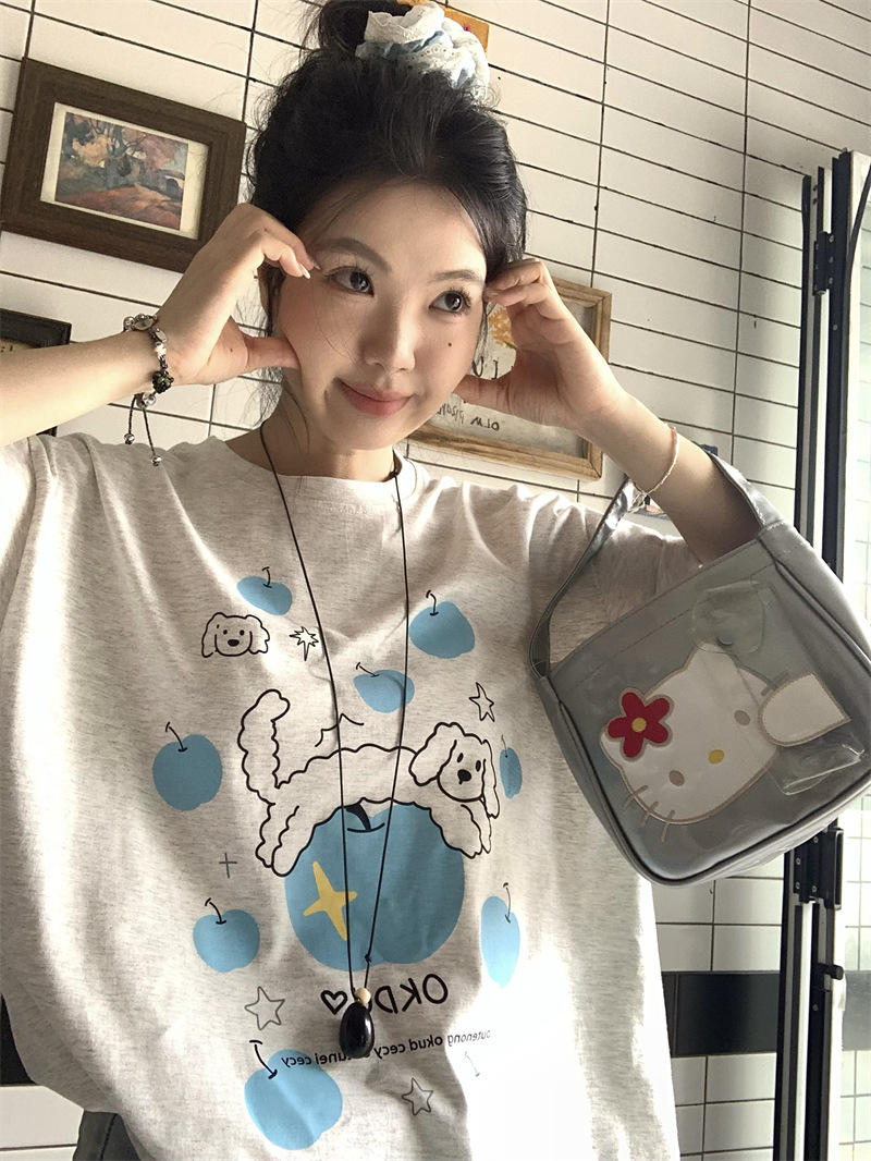 실제 상품 사진~2026년 여름 신상 한국 스타일 사과 강아지 프린트 반팔 티셔츠 여성용 루즈핏 레이지 스타일 상의