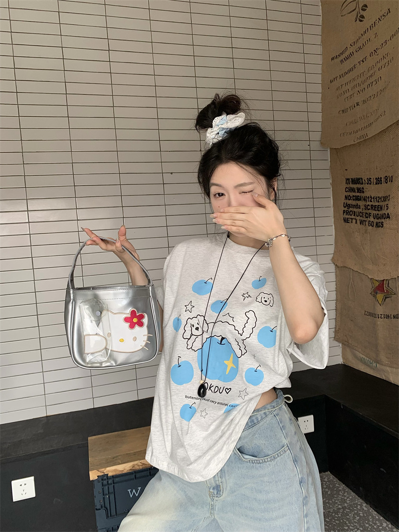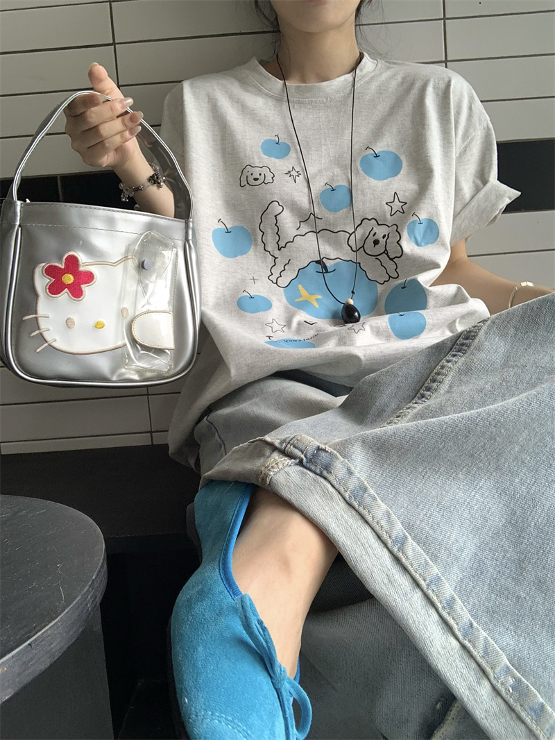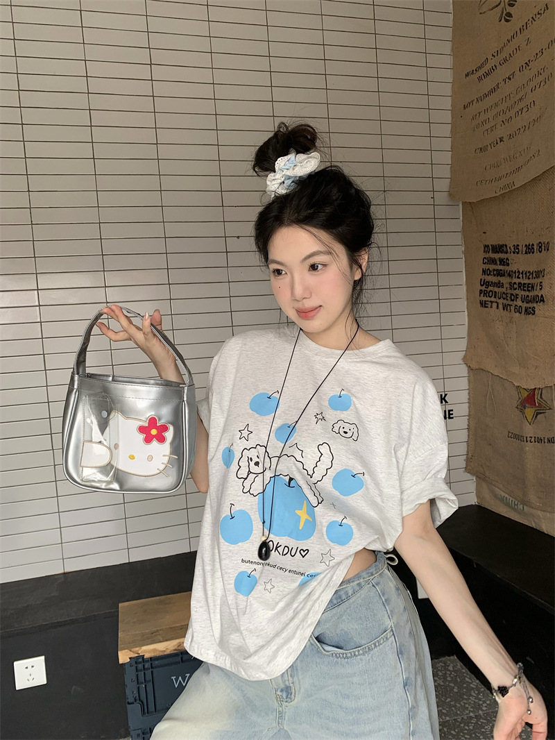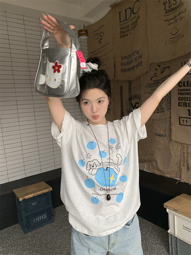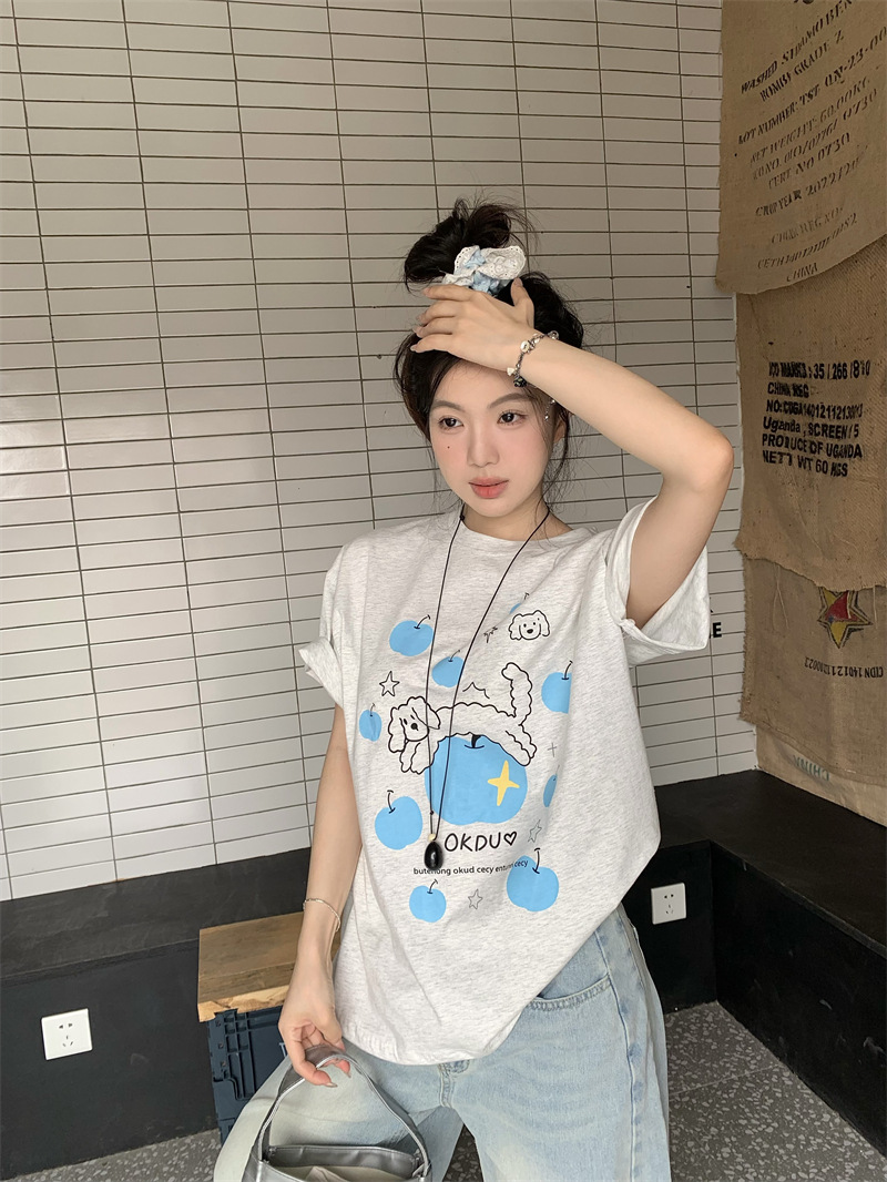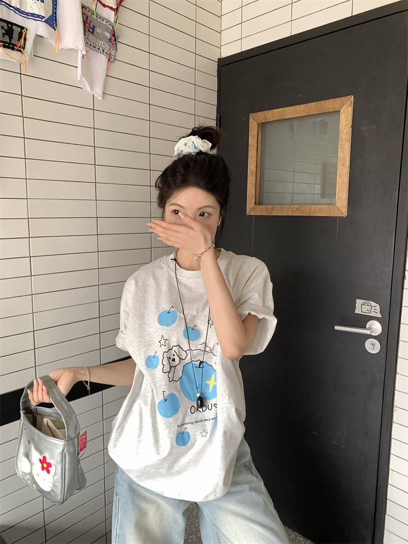 실제 상품 사진~2026년 여름 신상 한국 스타일 사과 강아지 프린트 반팔 티셔츠 여성용 루즈핏 레이지 스타일 상의