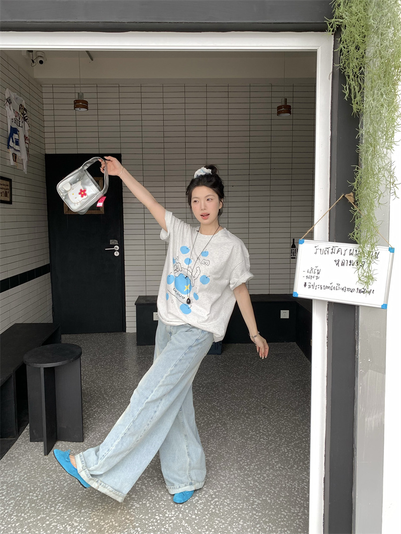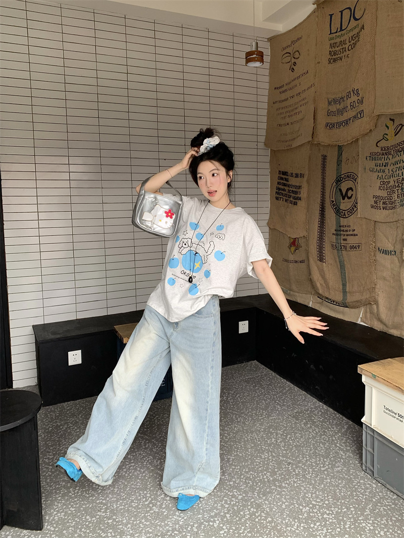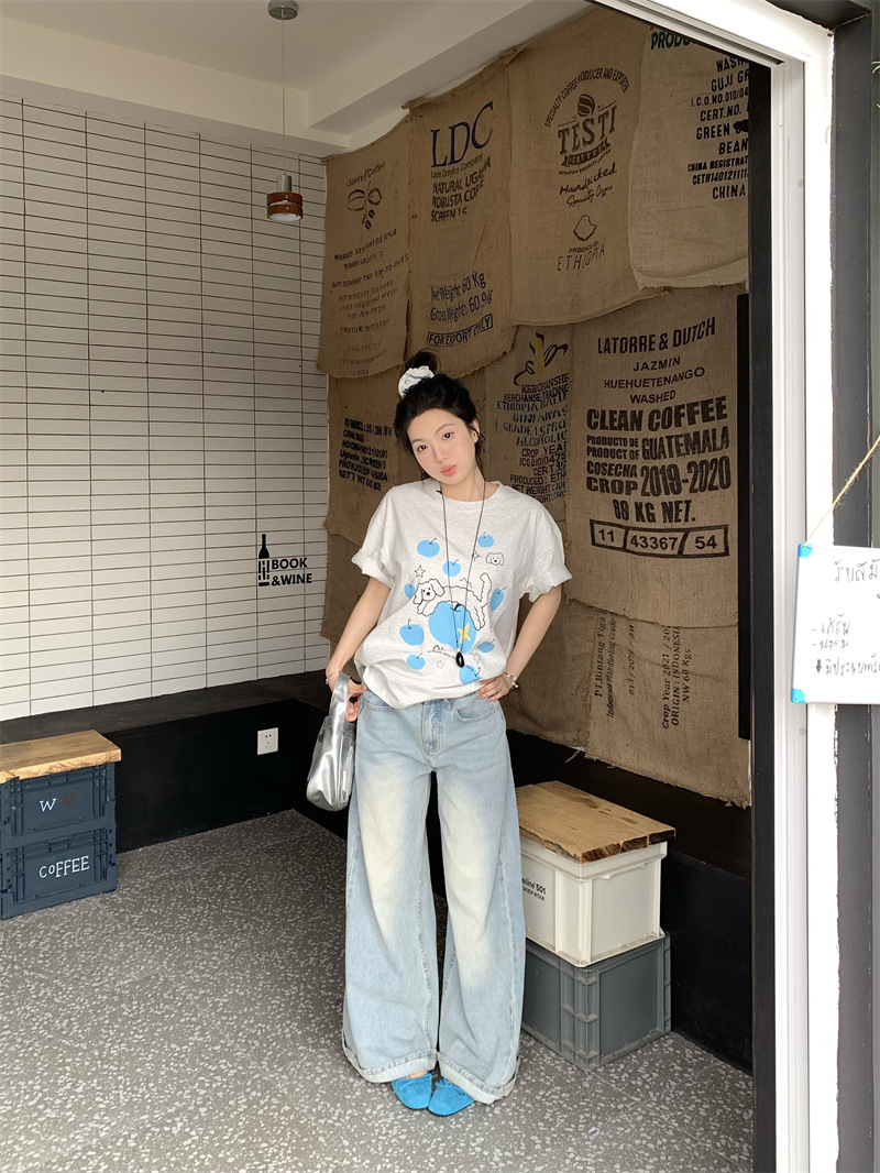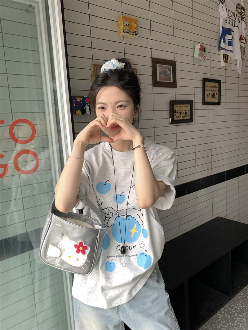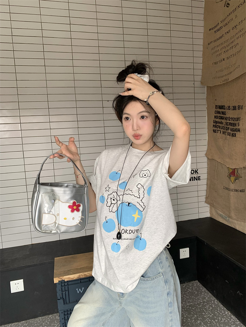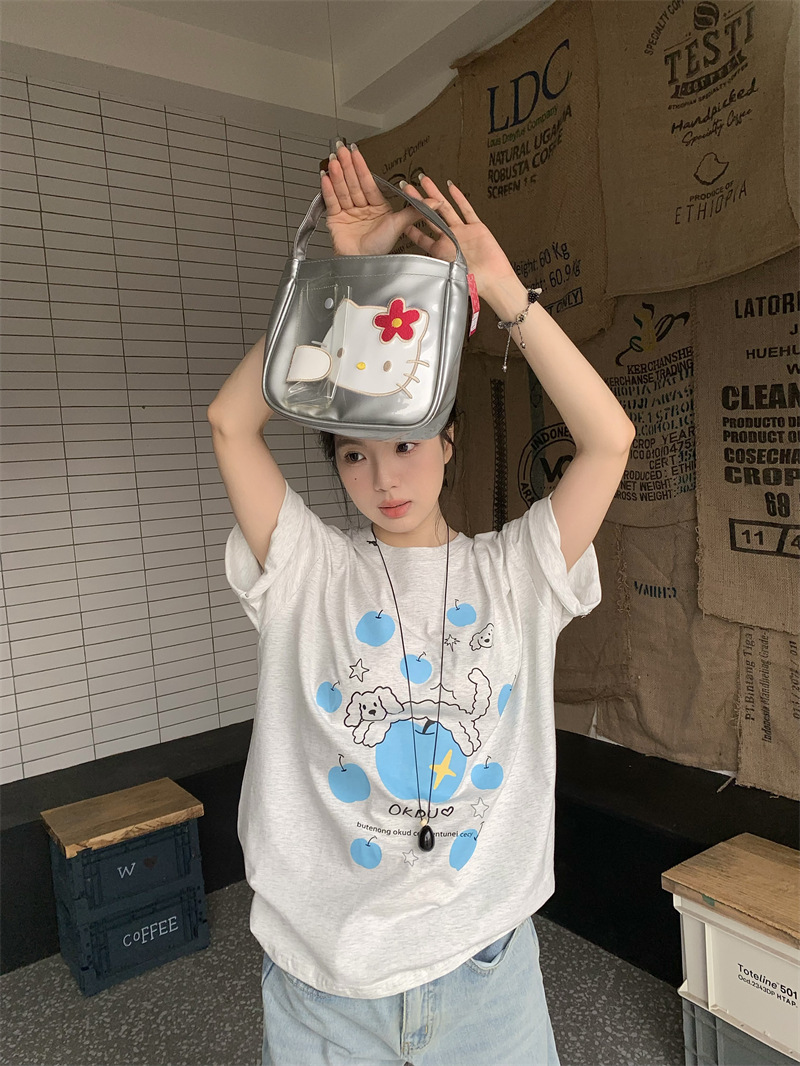 실제 상품 사진~2026년 여름 신상 한국 스타일 사과 강아지 프린트 반팔 티셔츠 여성용 루즈핏 레이지 스타일 상의