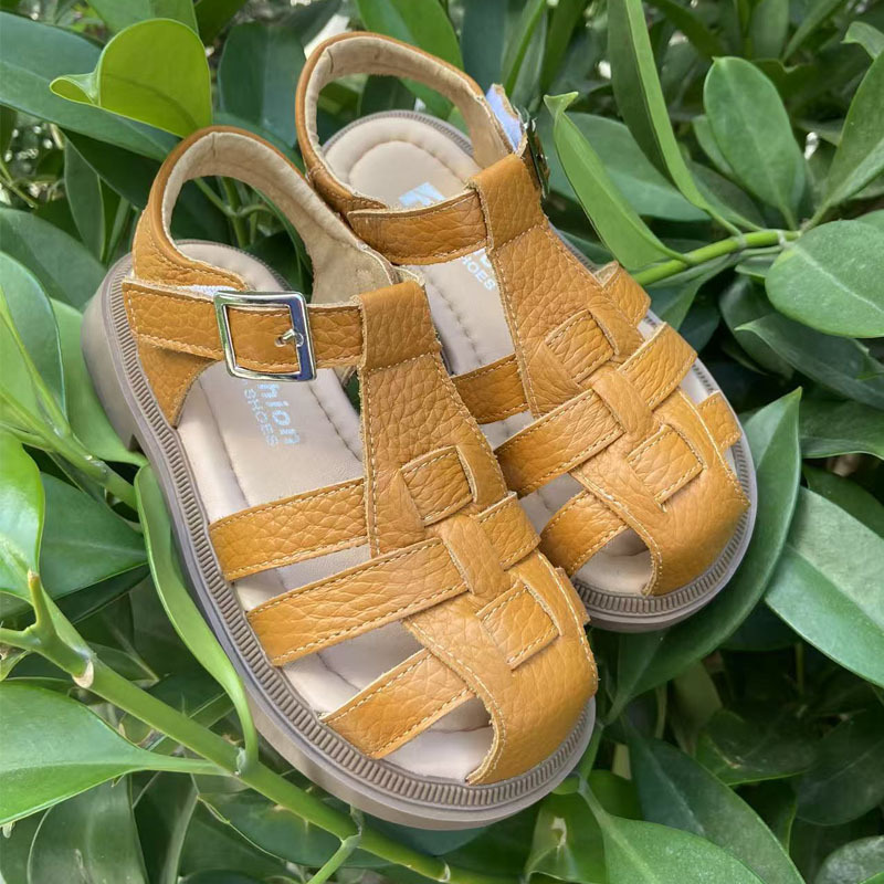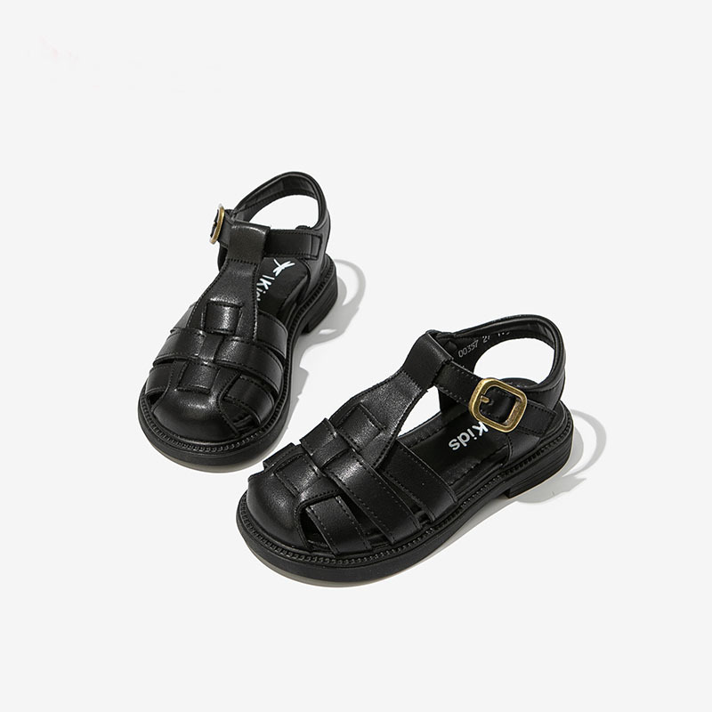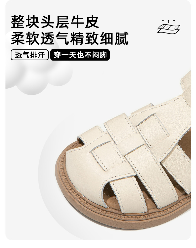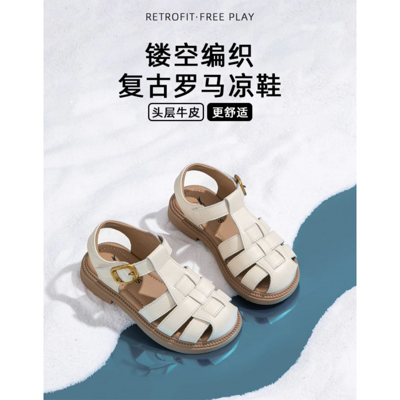 소녀의 첫 번째 레이어 소 가죽 샌들 2025 여름 새로운 소녀 신발 어린이 발가락으로 포장 된 로마 신발 여름 짠