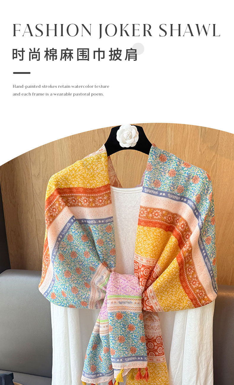 2025 봄과 여름 새로운 무지개 민족 스타일 면화와 리넨 실크 스카프 여성 어머니 우아한 통근 에어컨 룸 목도리 패션스토어 가기