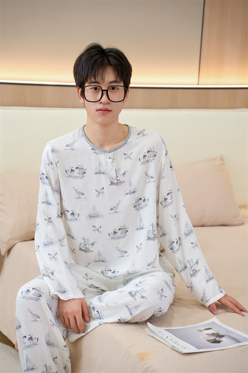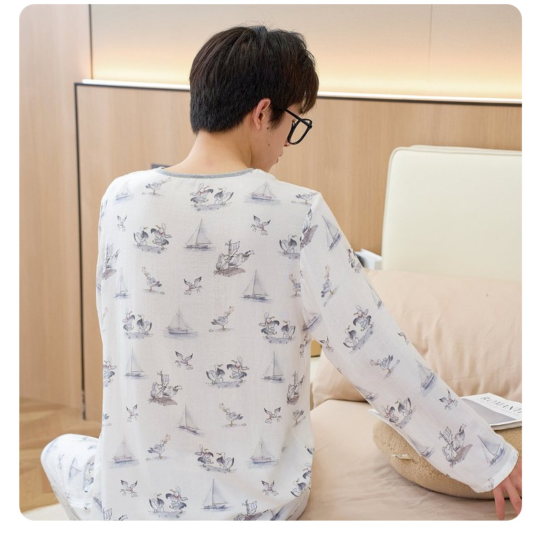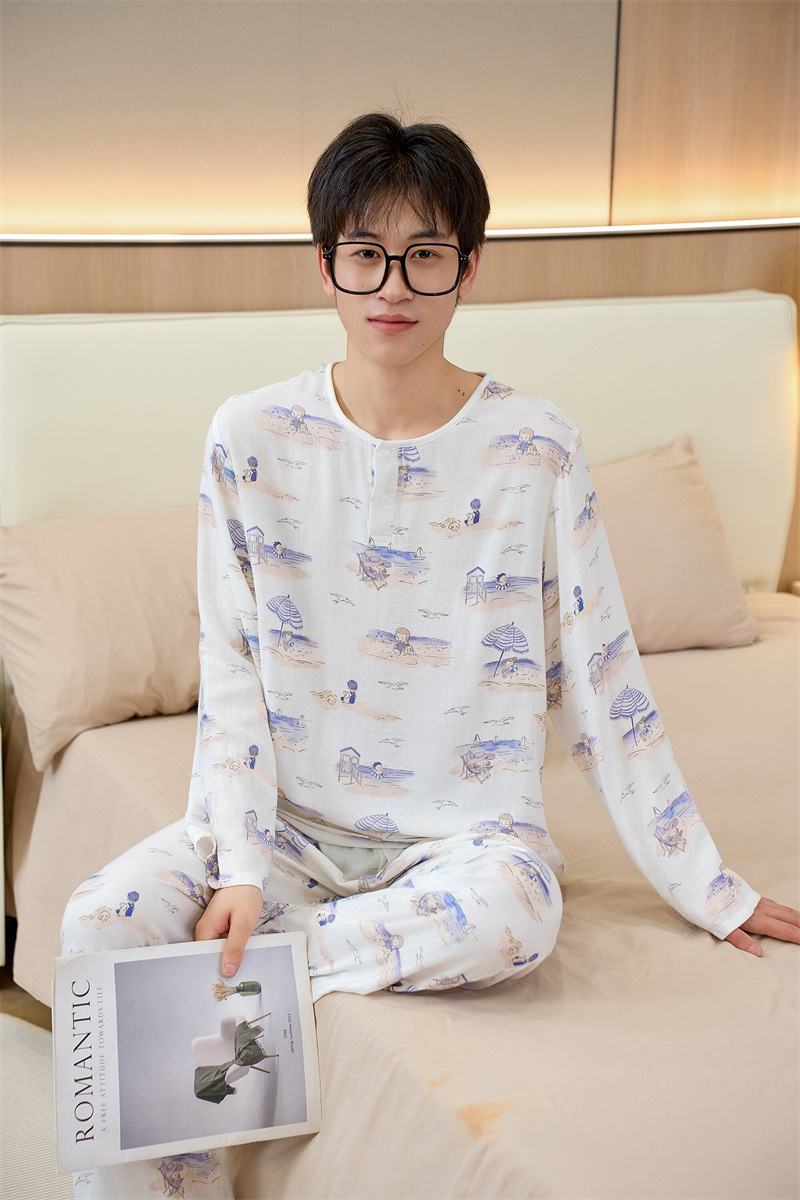 남성용 대나무 면 통기성 및 흡습성 봄 여름 홈웨어 세트 긴 소매 바지 홈 캐주얼 잠옷