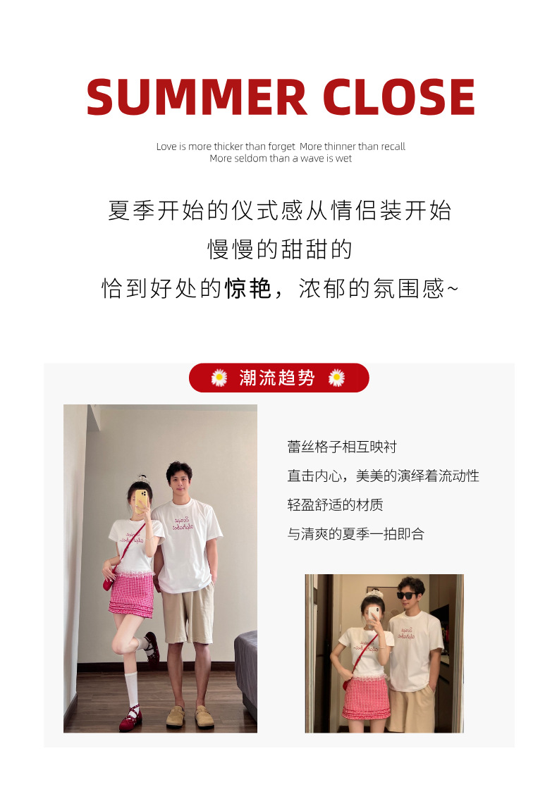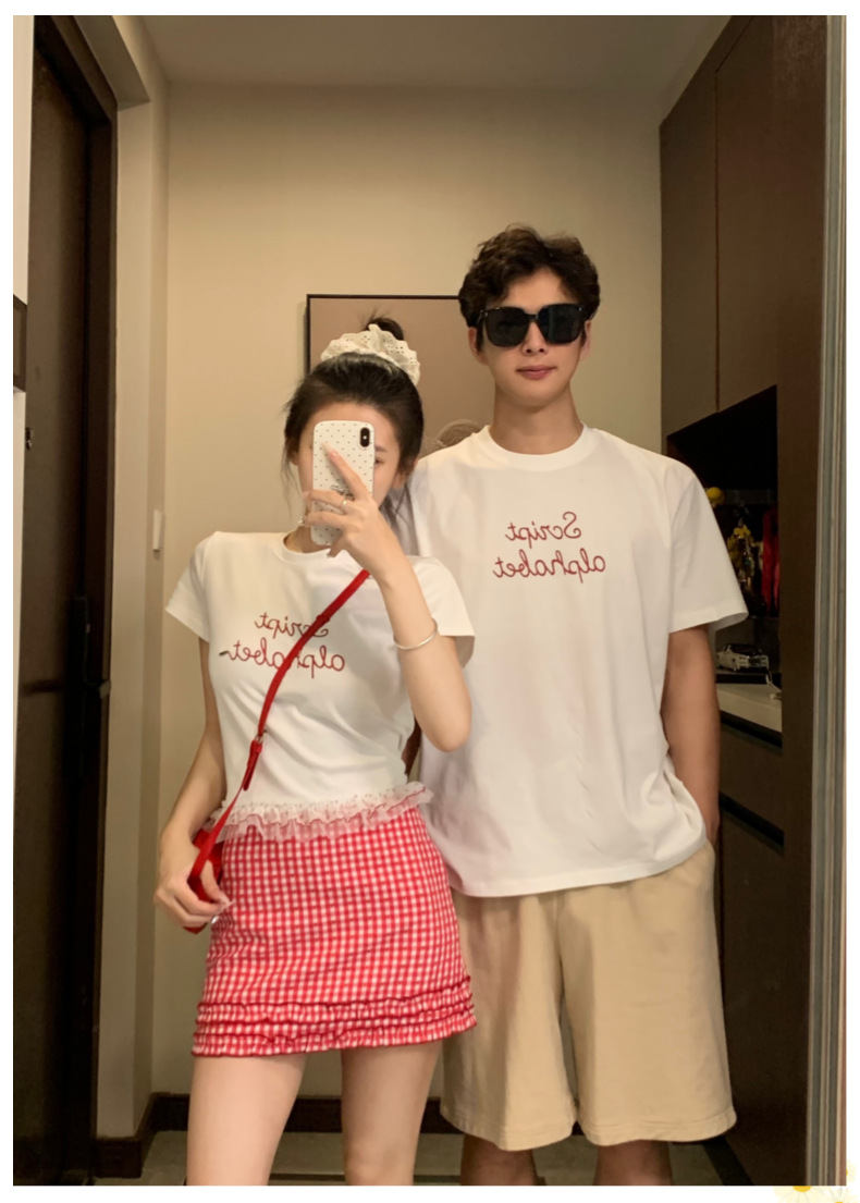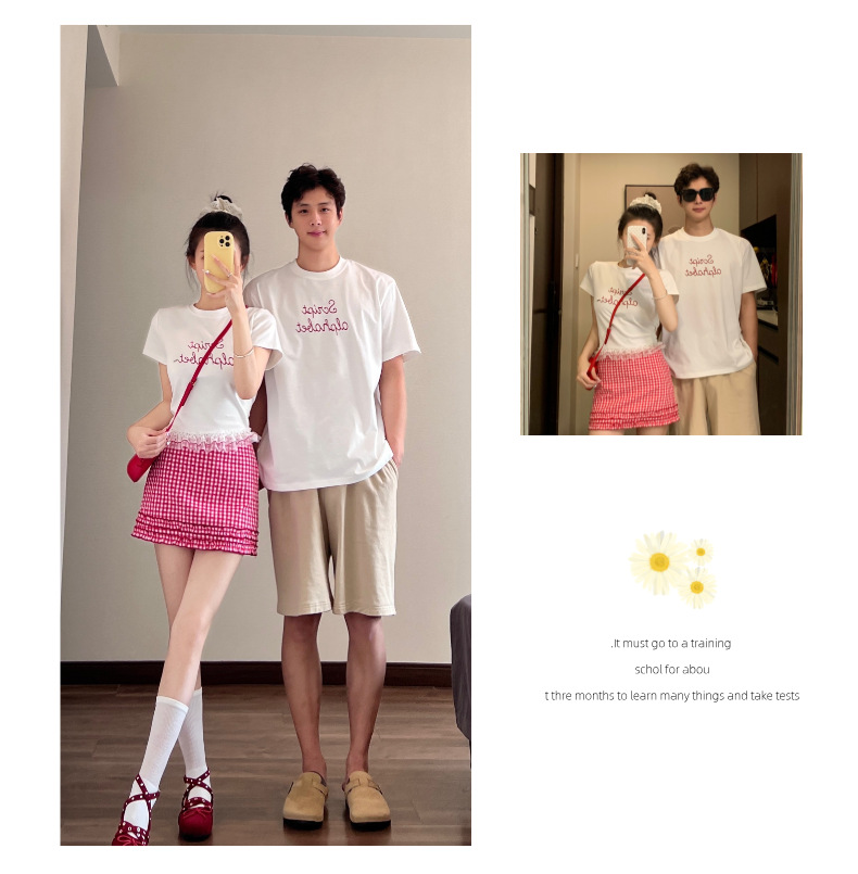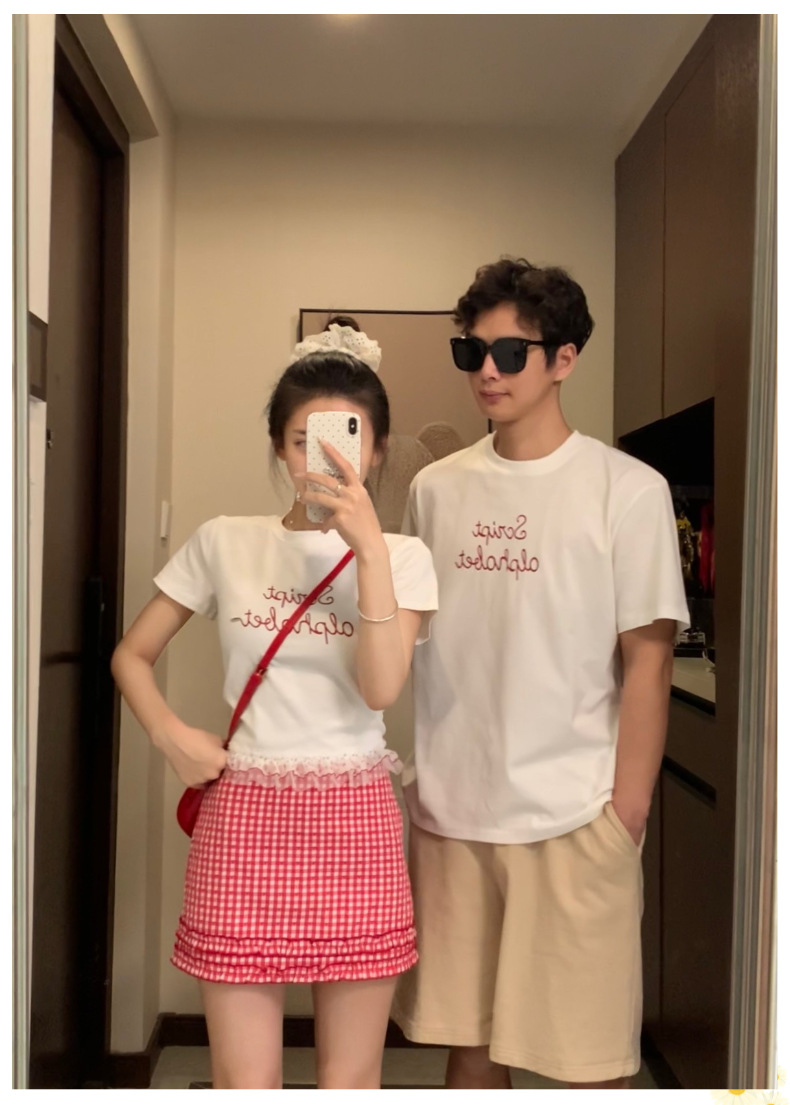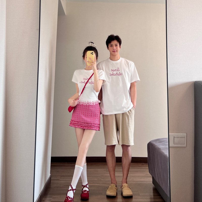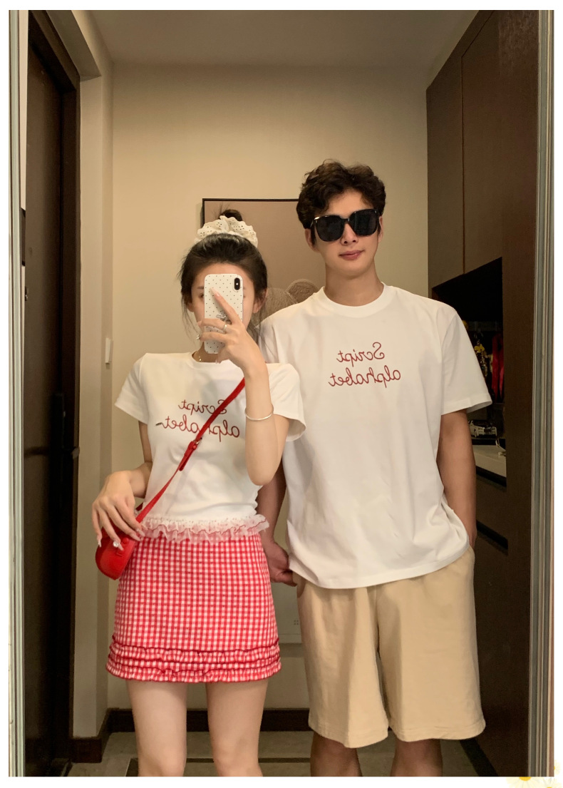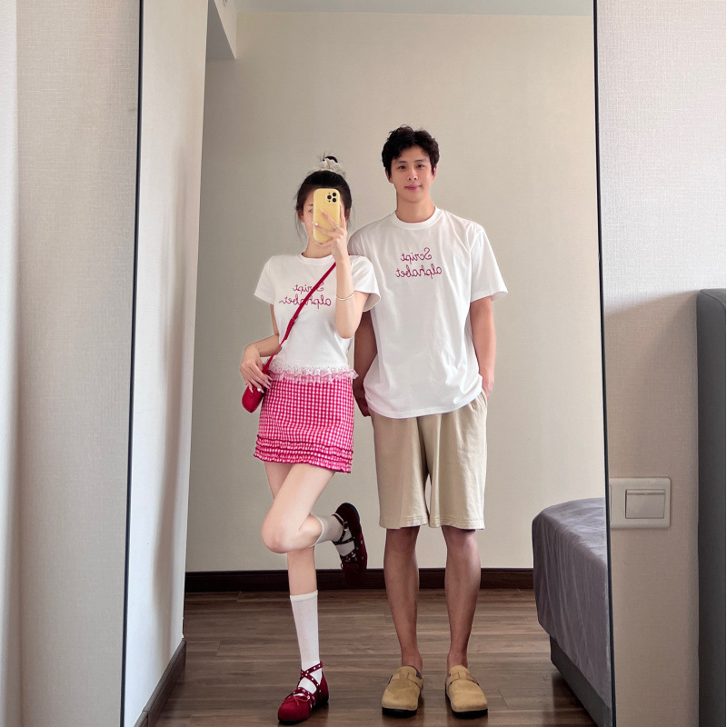 2025 커플 여름 디자인 센스 레이스 바느질 편지 인쇄 반팔 티셔츠 세트