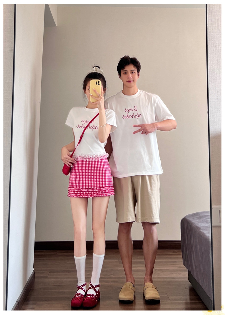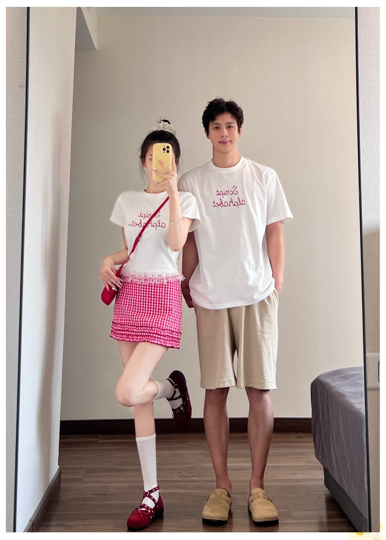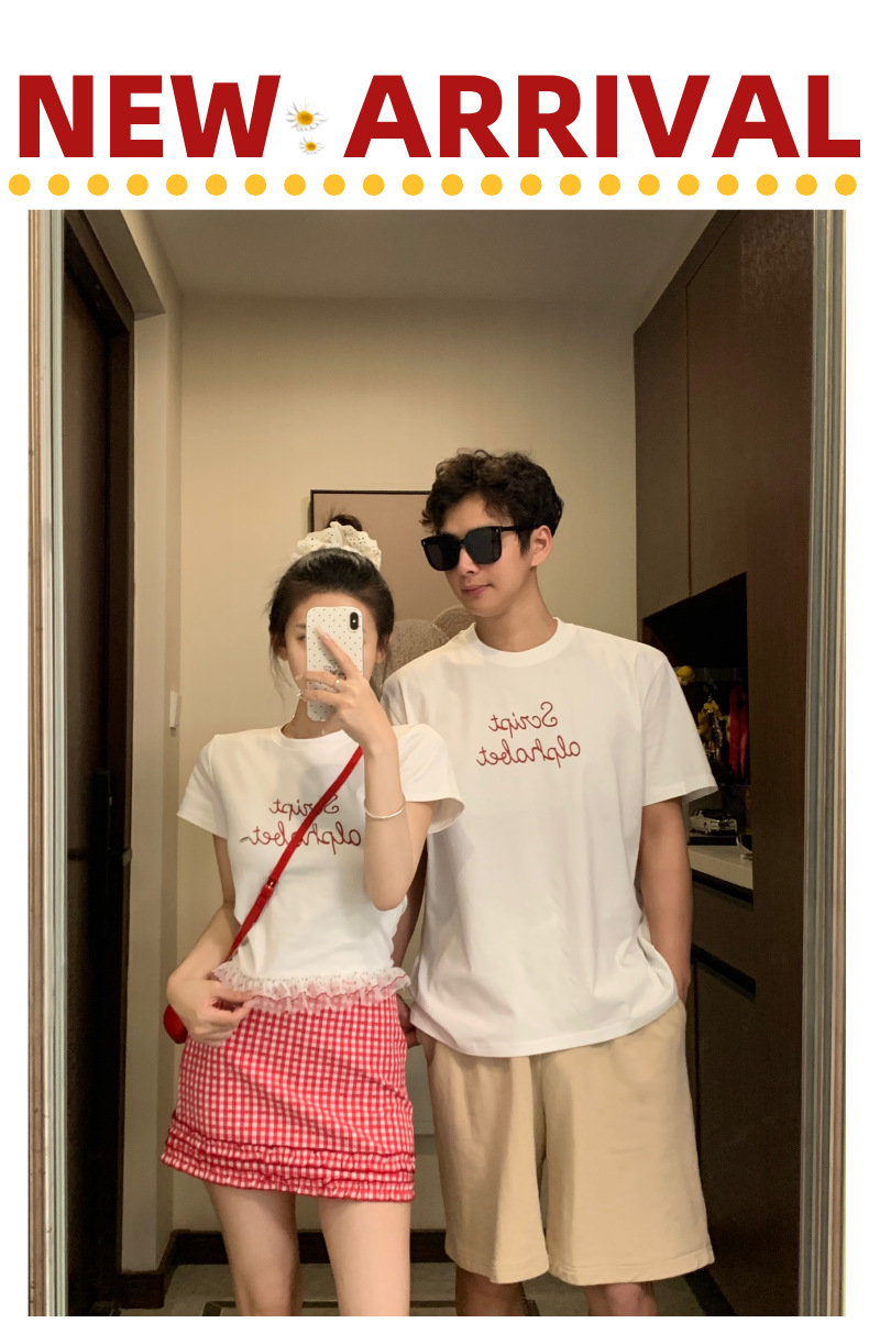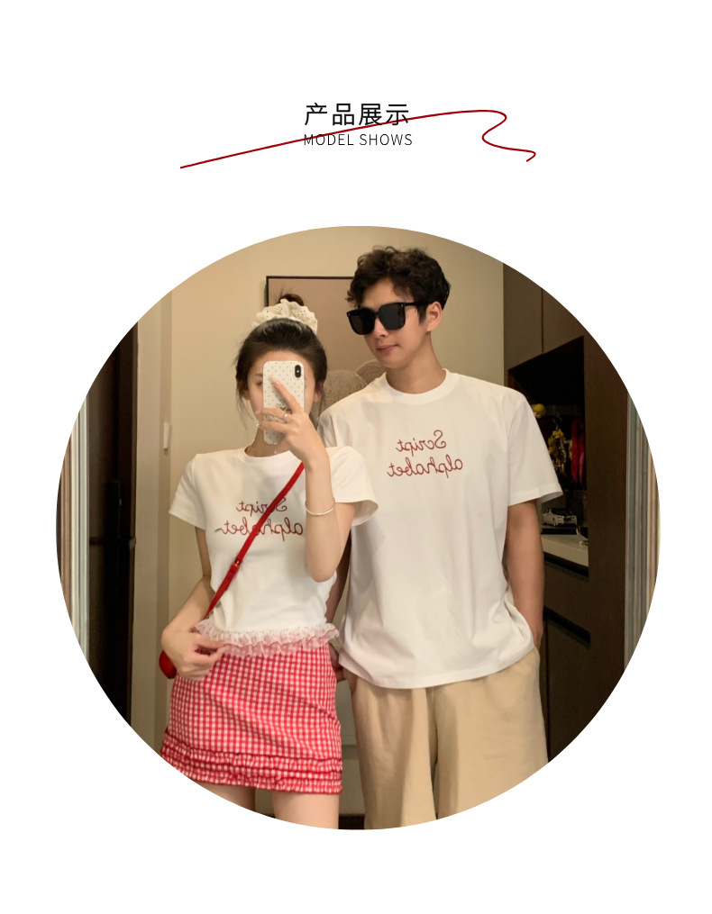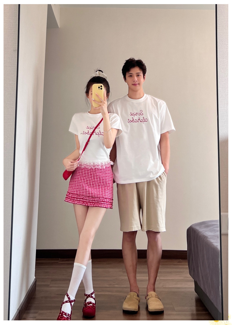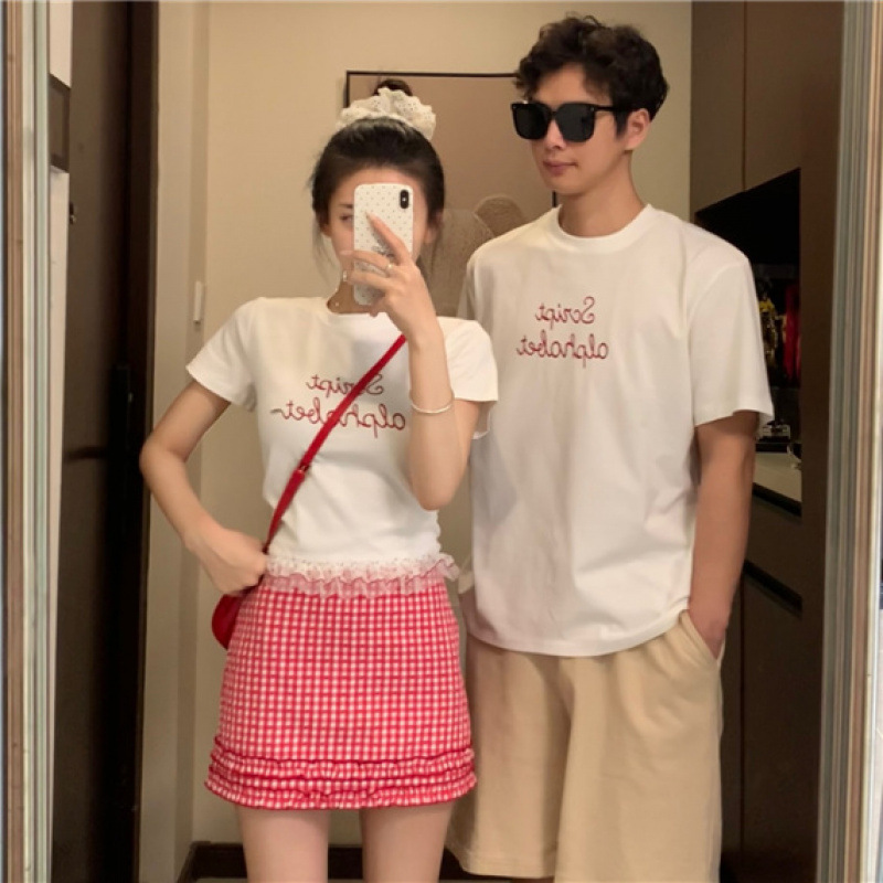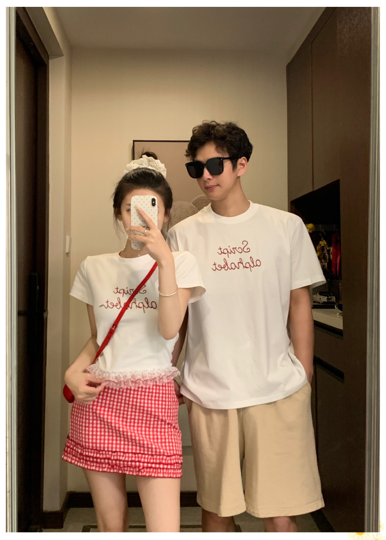 2025 커플 여름 디자인 센스 레이스 바느질 편지 인쇄 반팔 티셔츠 세트