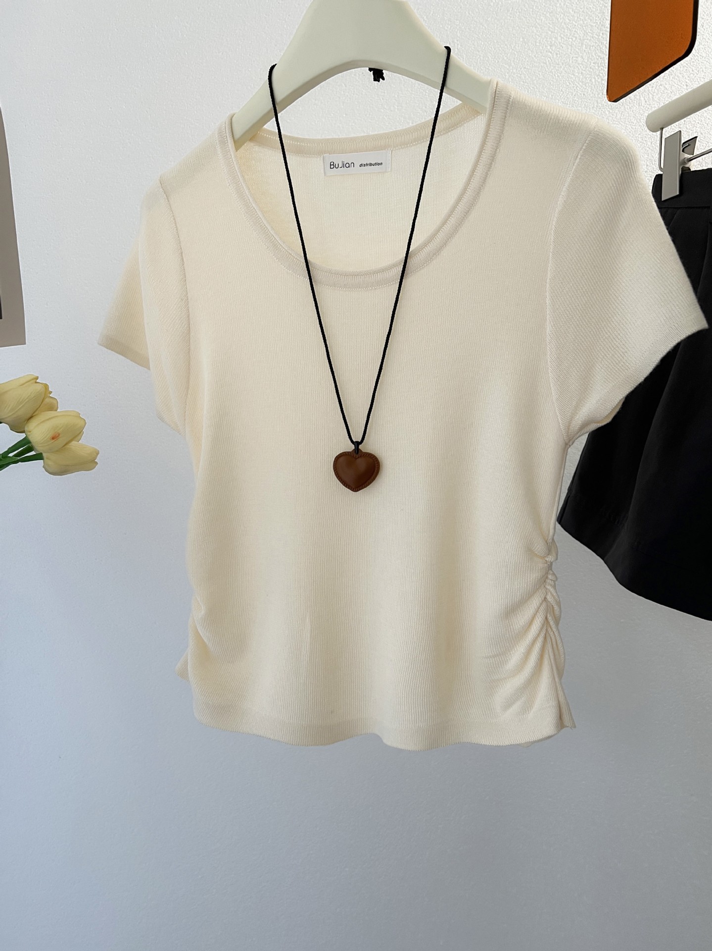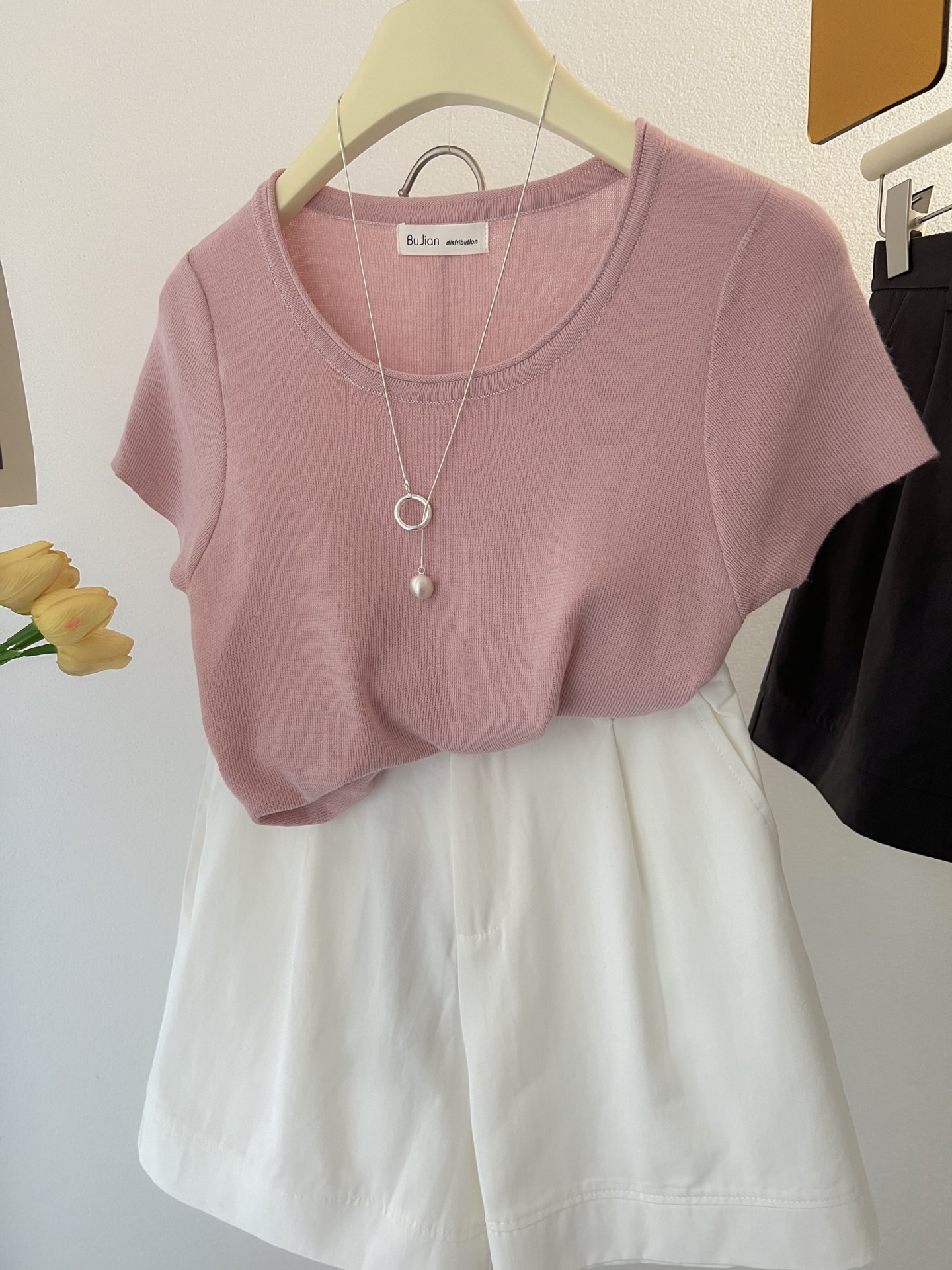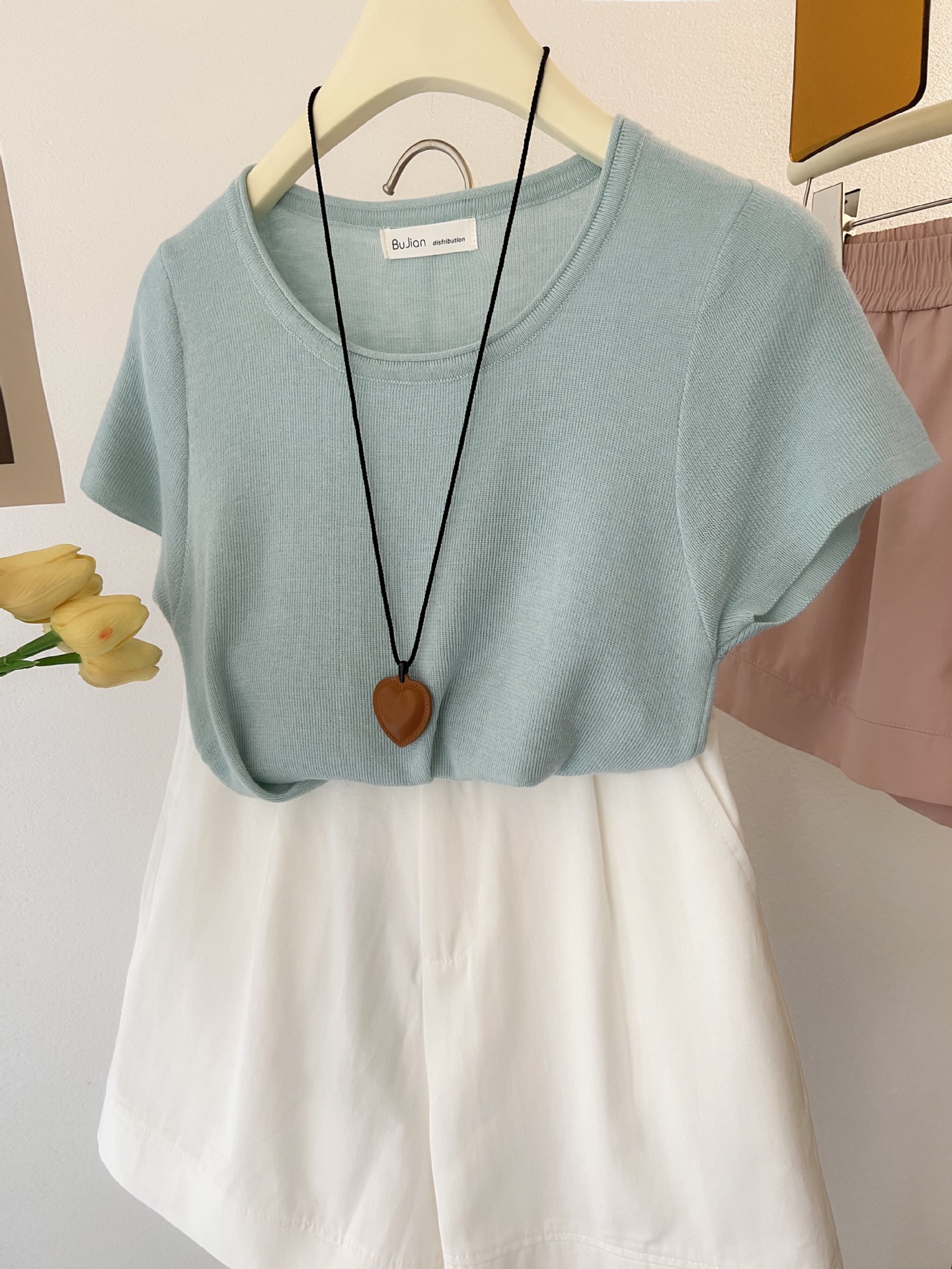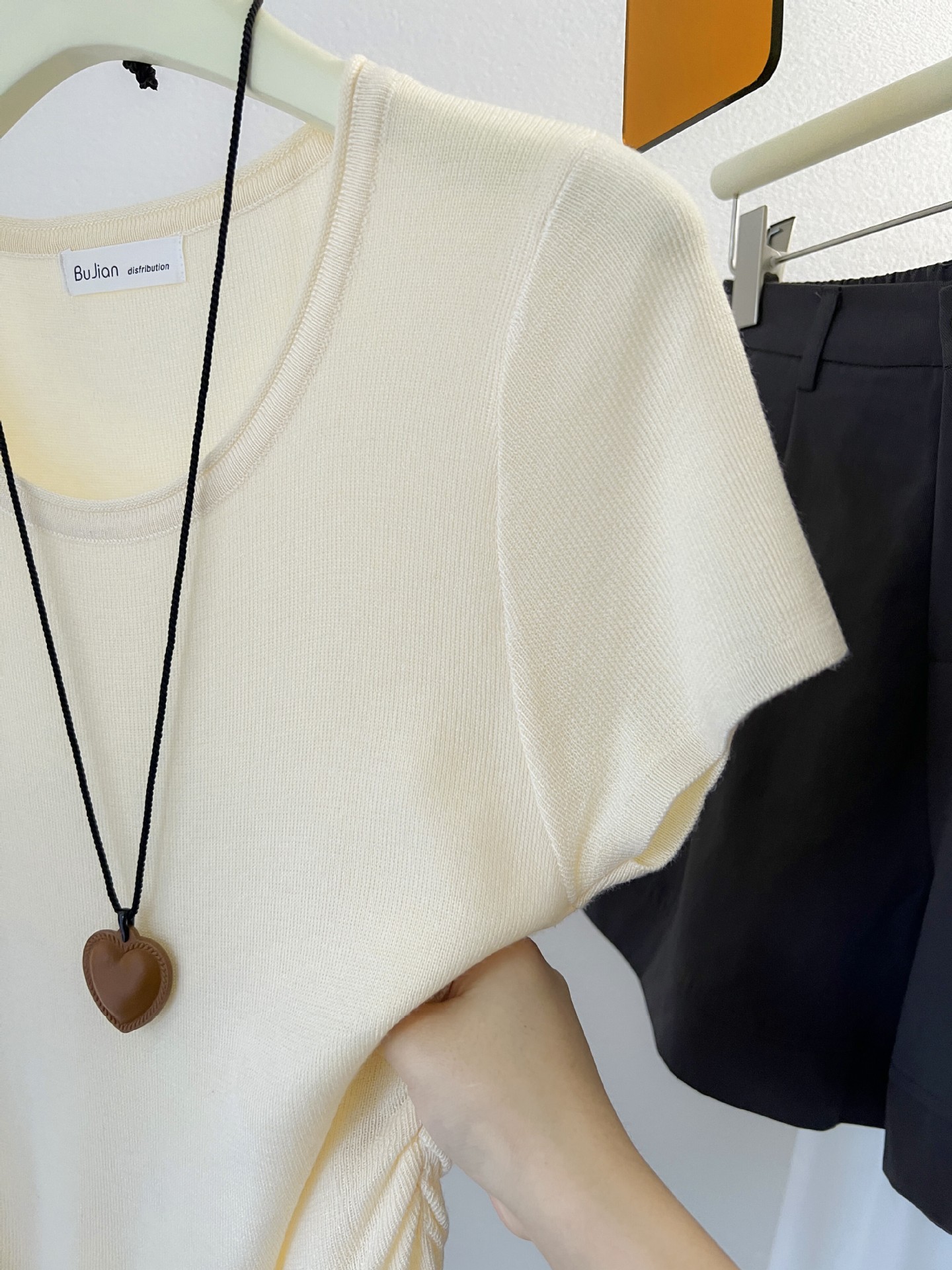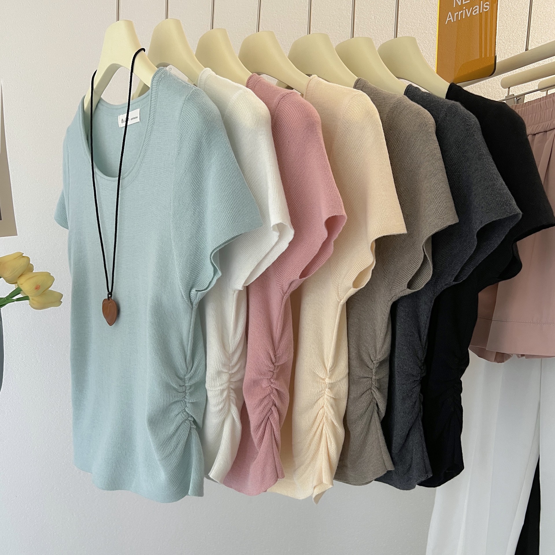 프랑스 스타일 아이스 실크 플라잉 슬리브 반팔 어깨 티셔츠 작은 슬림 핏 타이트 허리 짧은 니트 탑 얇은 여성 여름스토어 가기