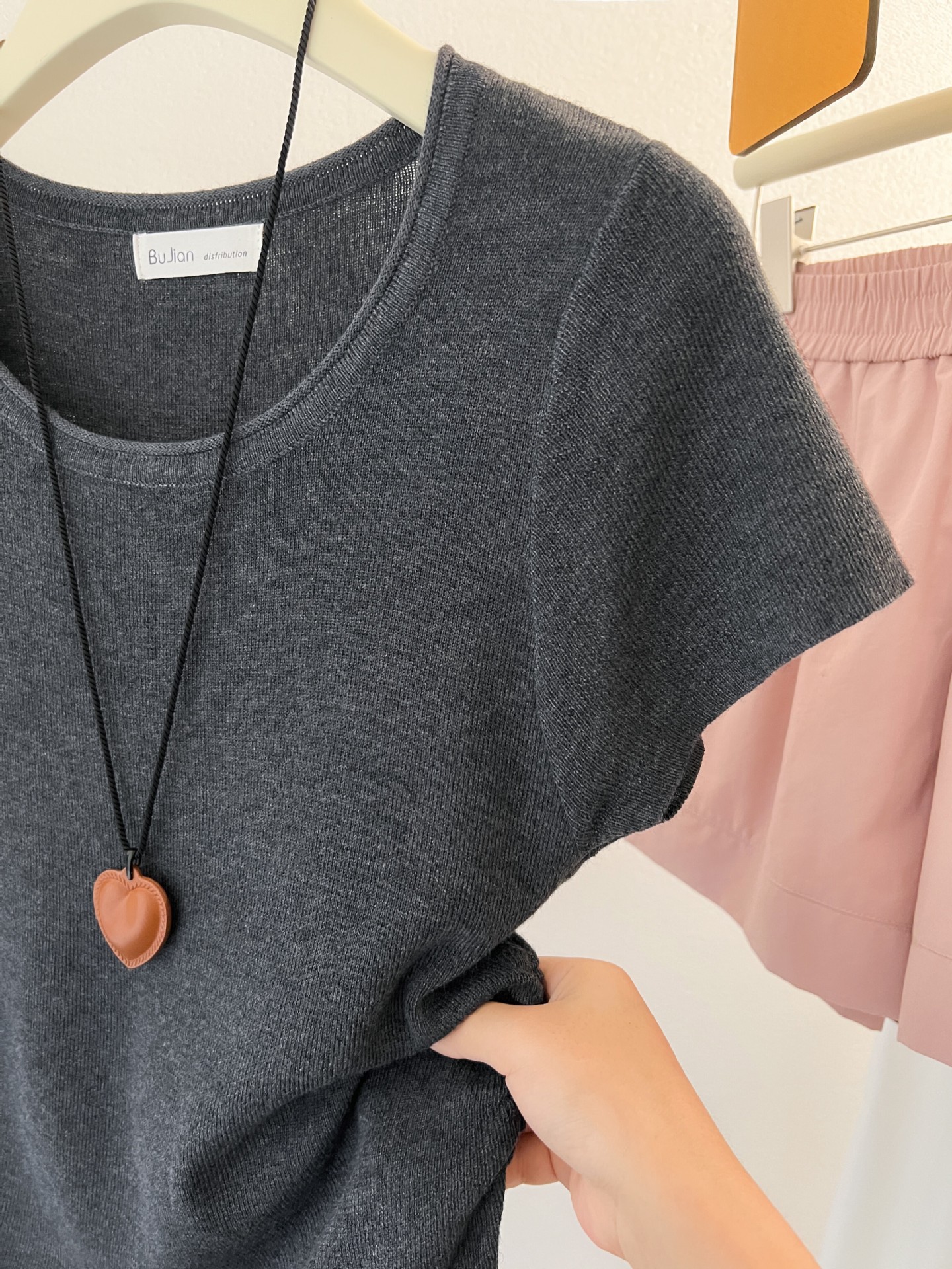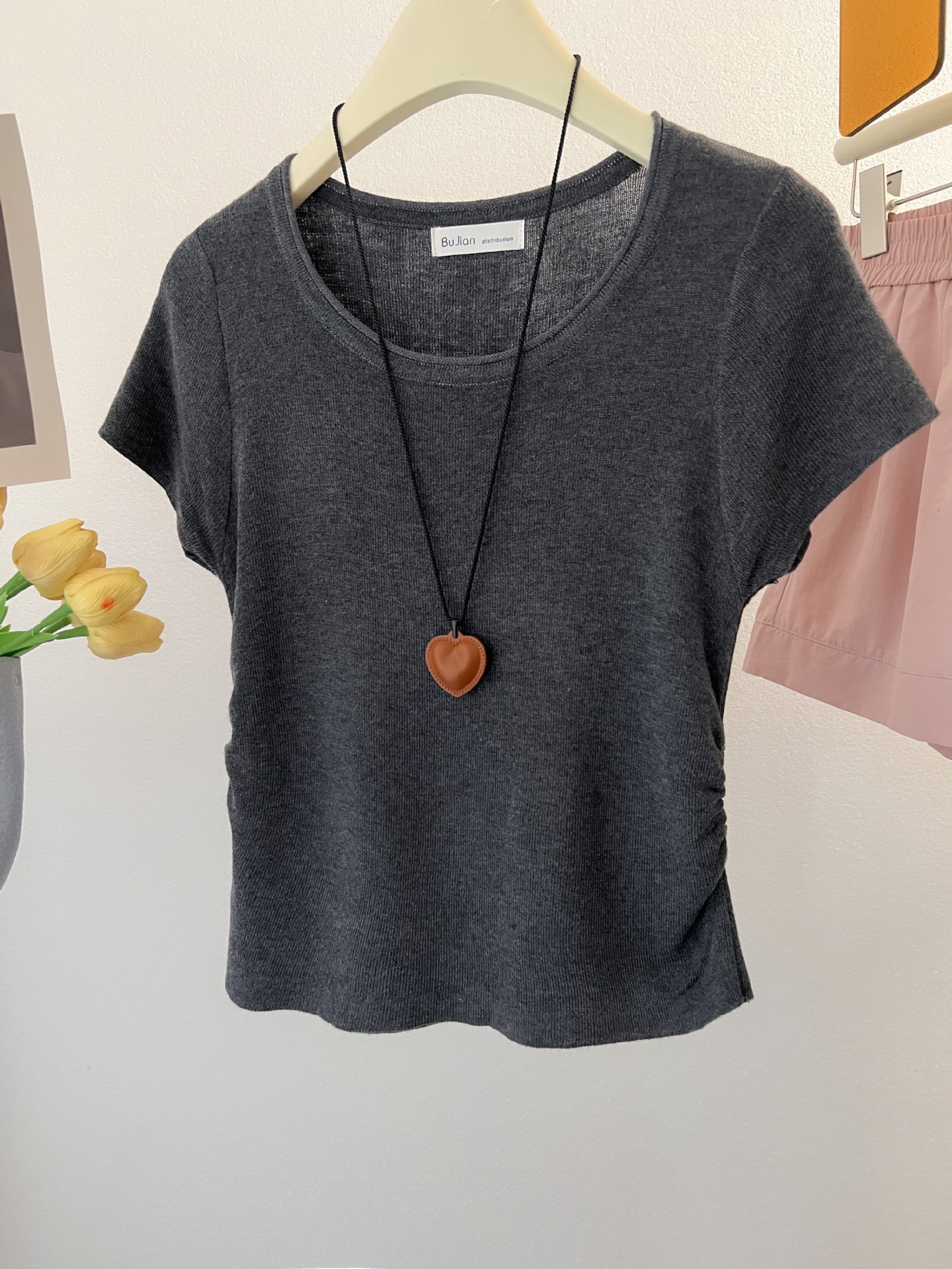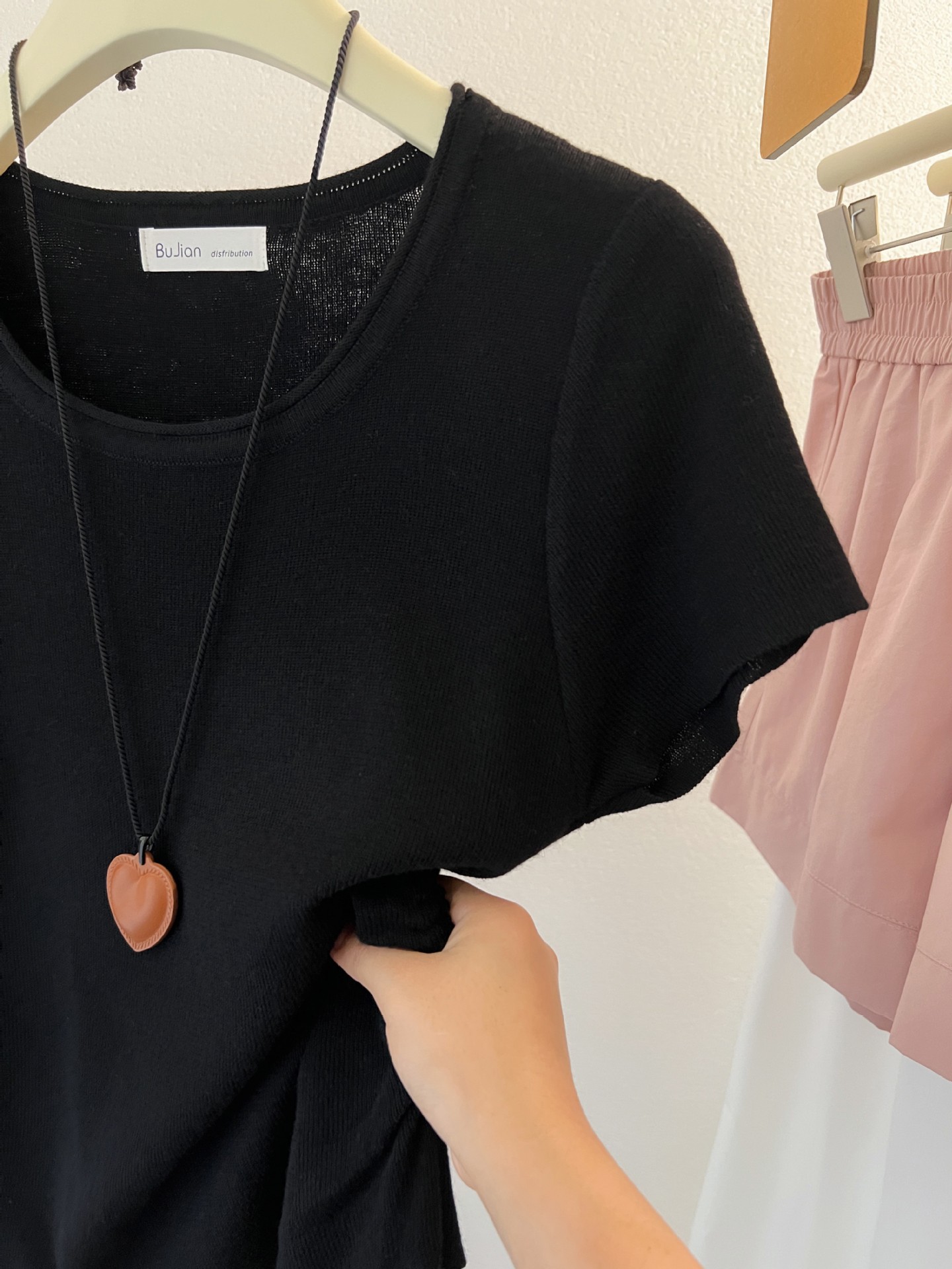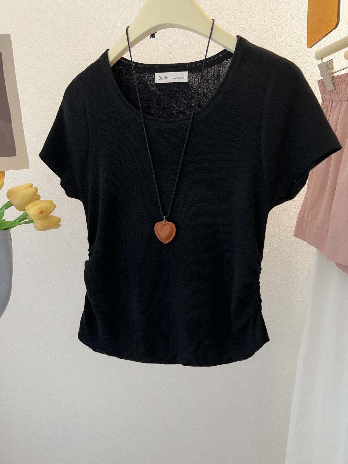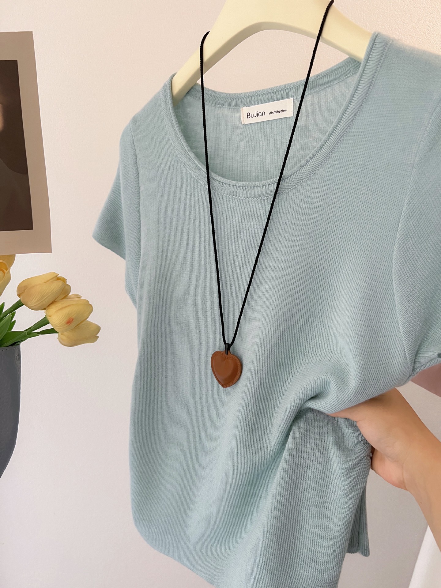 프랑스 스타일 아이스 실크 플라잉 슬리브 반팔 어깨 티셔츠 작은 슬림 핏 타이트 허리 짧은 니트 탑 얇은 여성 여름스토어 가기