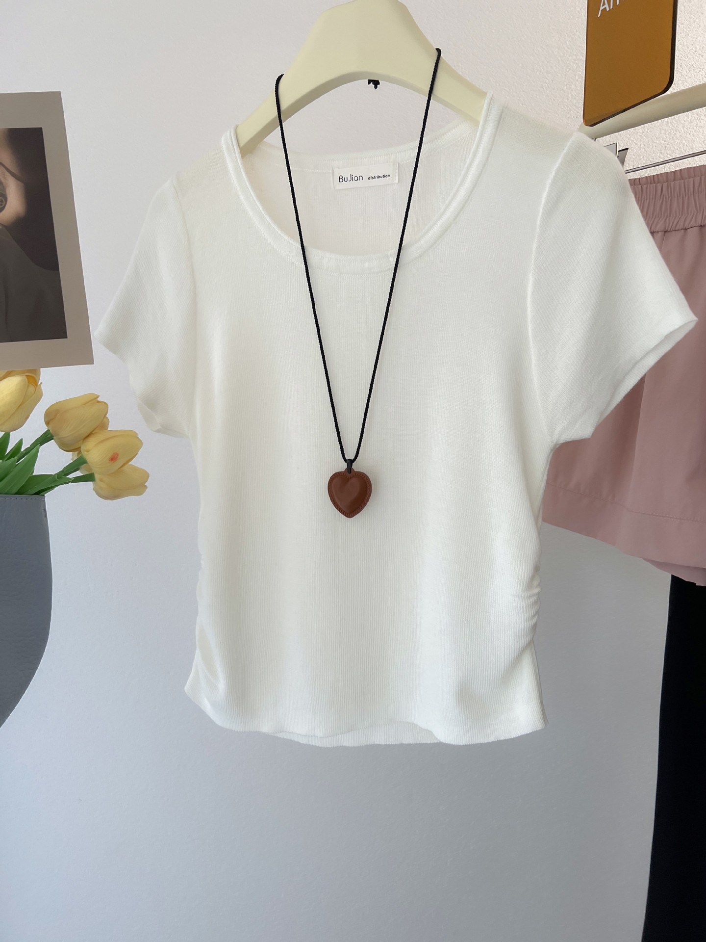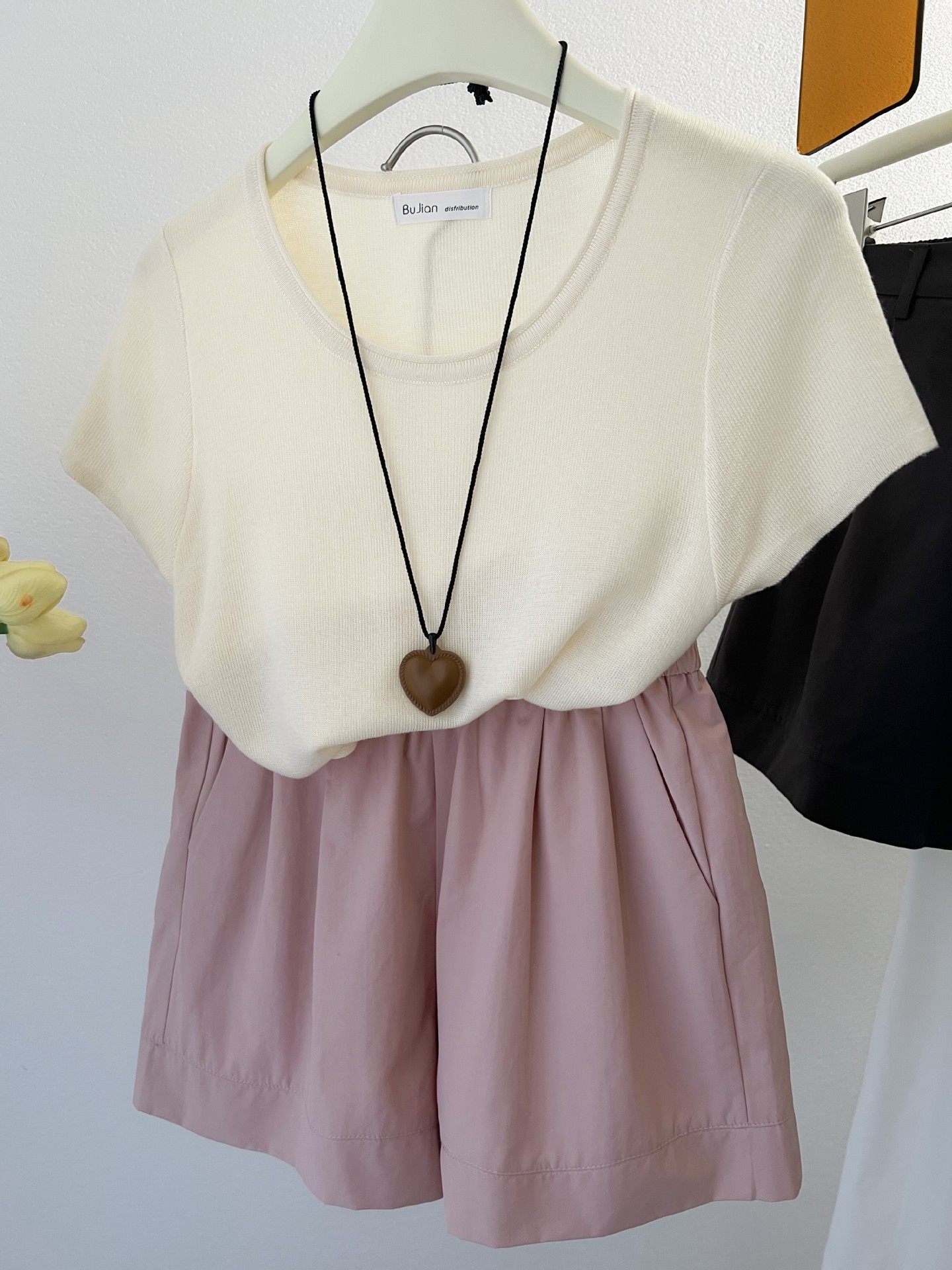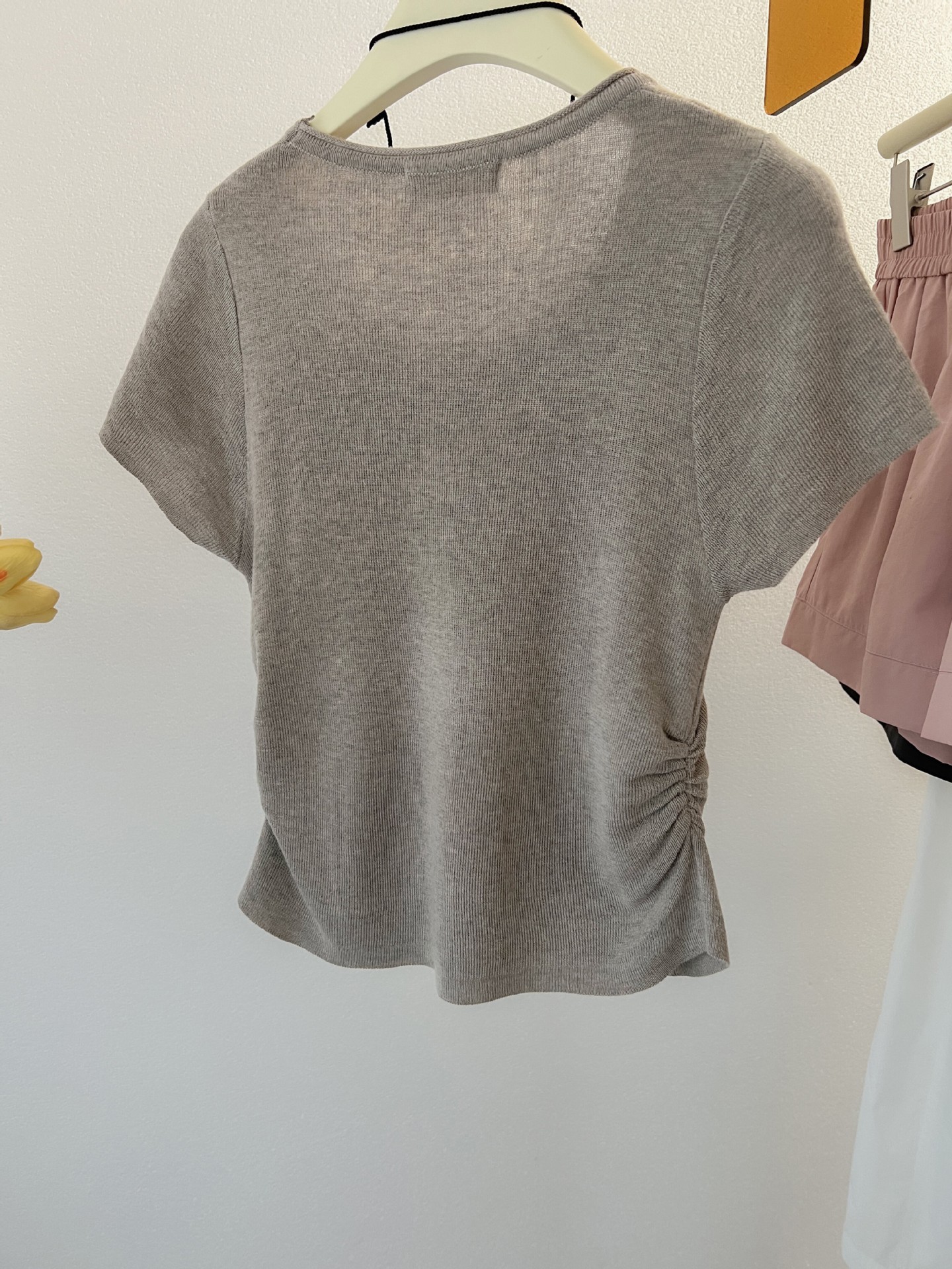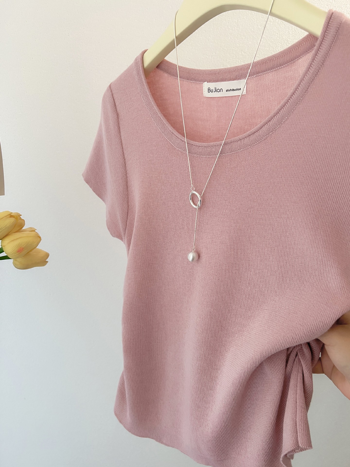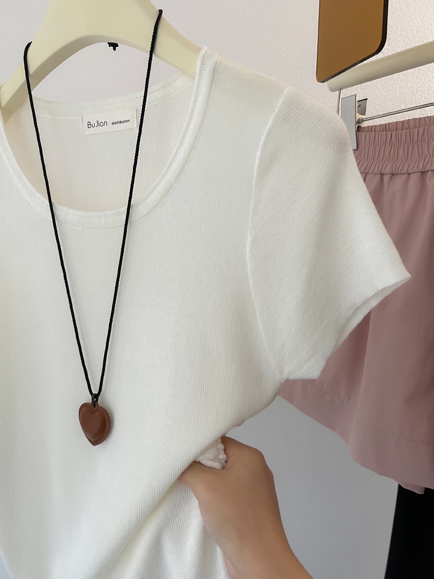 프랑스 스타일 아이스 실크 플라잉 슬리브 반팔 어깨 티셔츠 작은 슬림 핏 타이트 허리 짧은 니트 탑 얇은 여성 여름스토어 가기