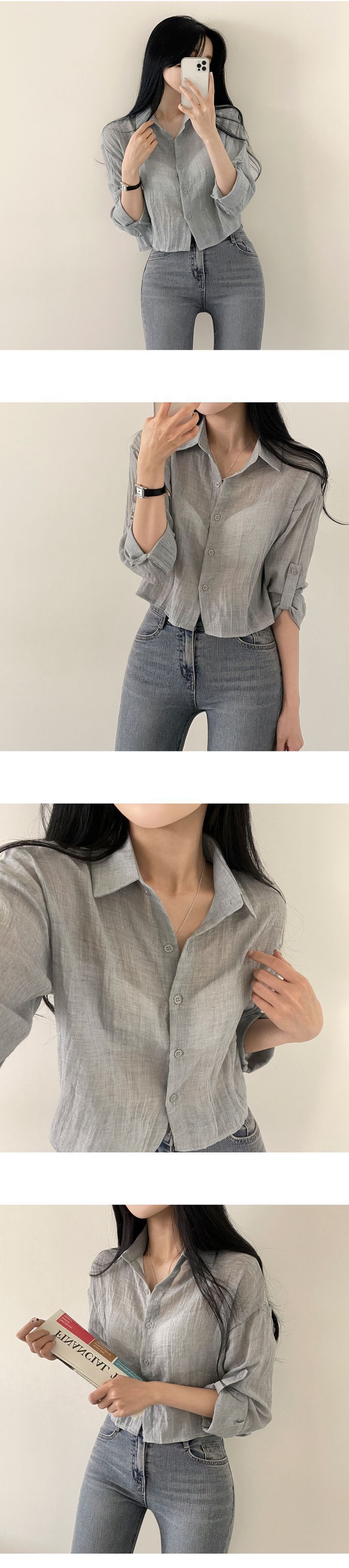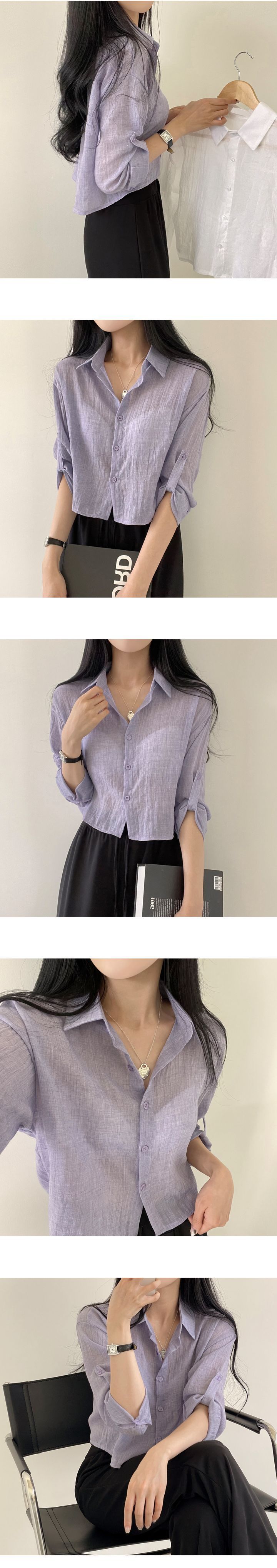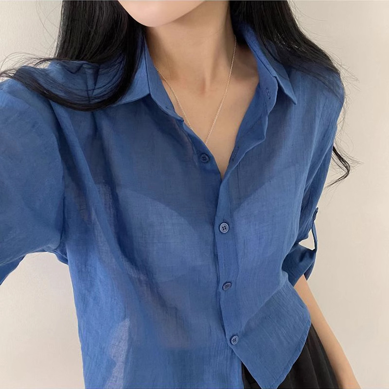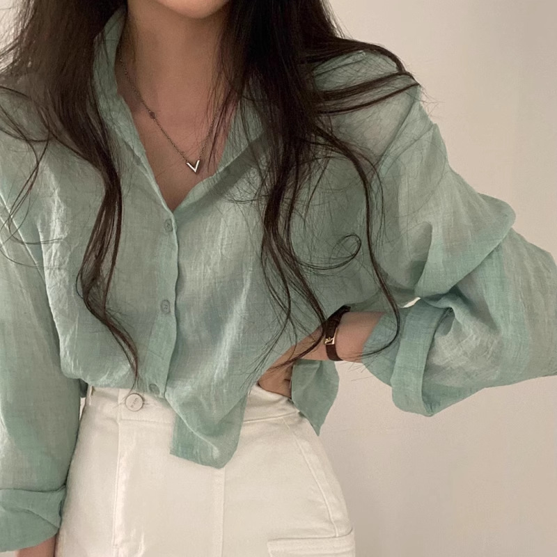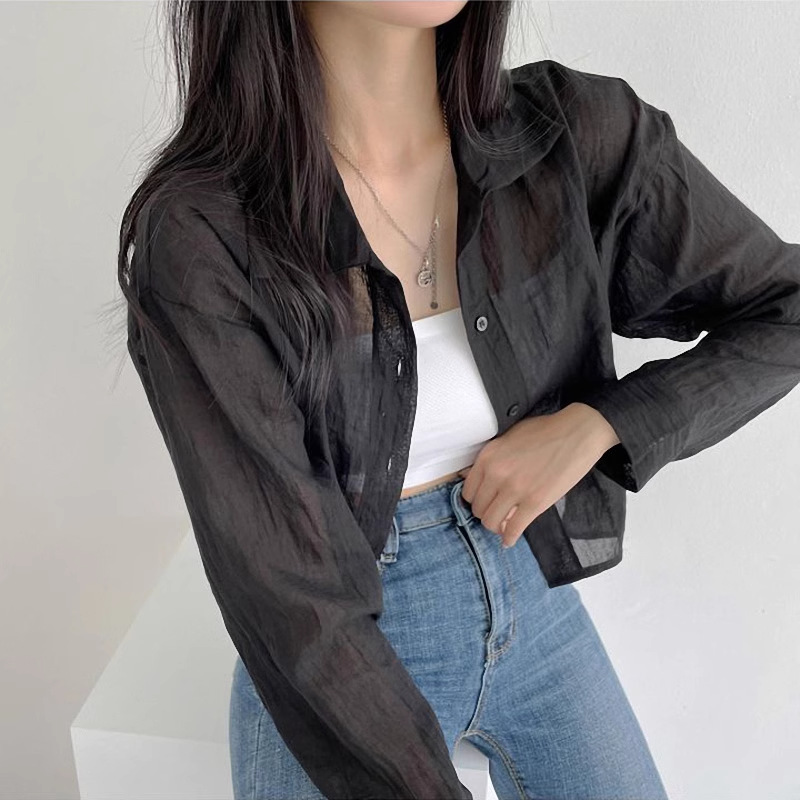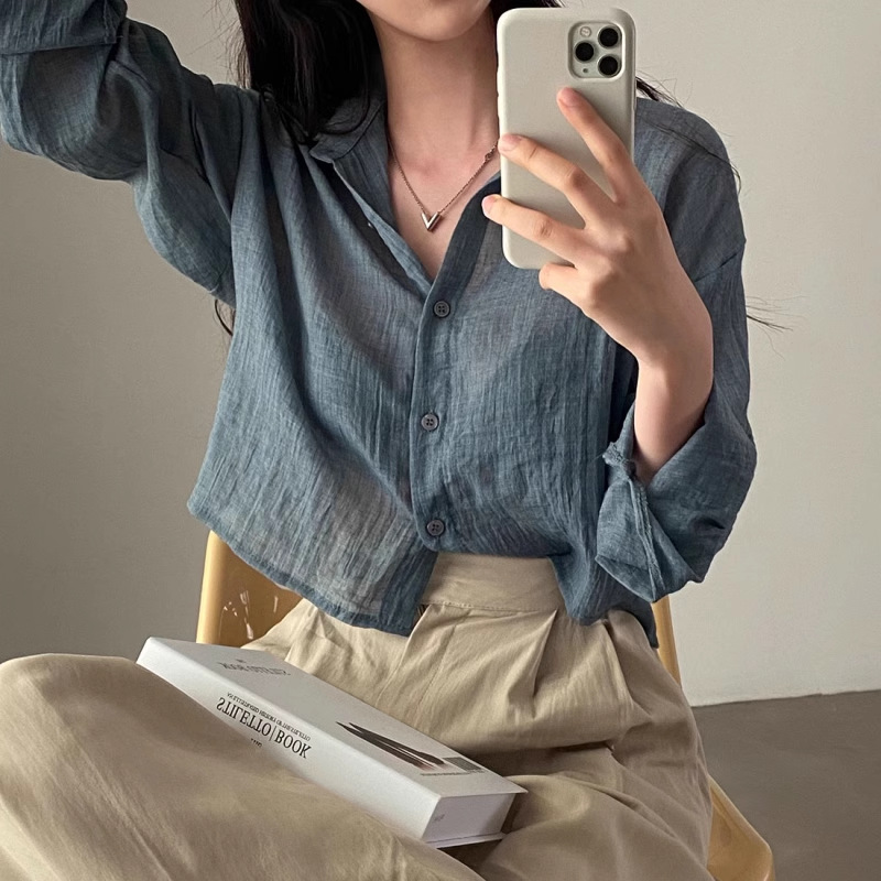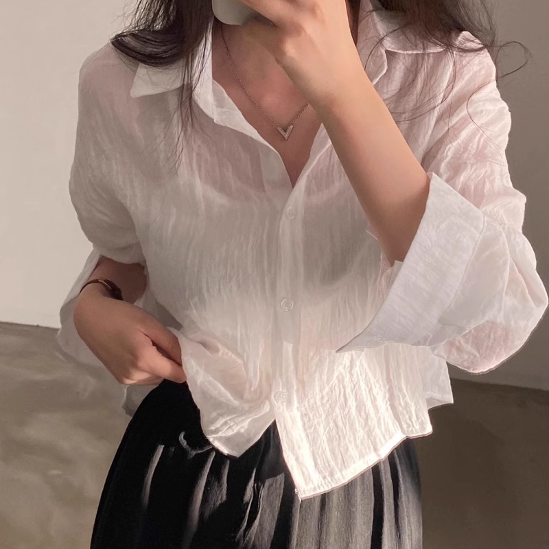 한국 세련된 나이를 줄이는 여성 싱글 브레스트 옷깃 주름 긴 소매 셔츠 느슨한 짧은 선 스크린 셔츠스토어 가기