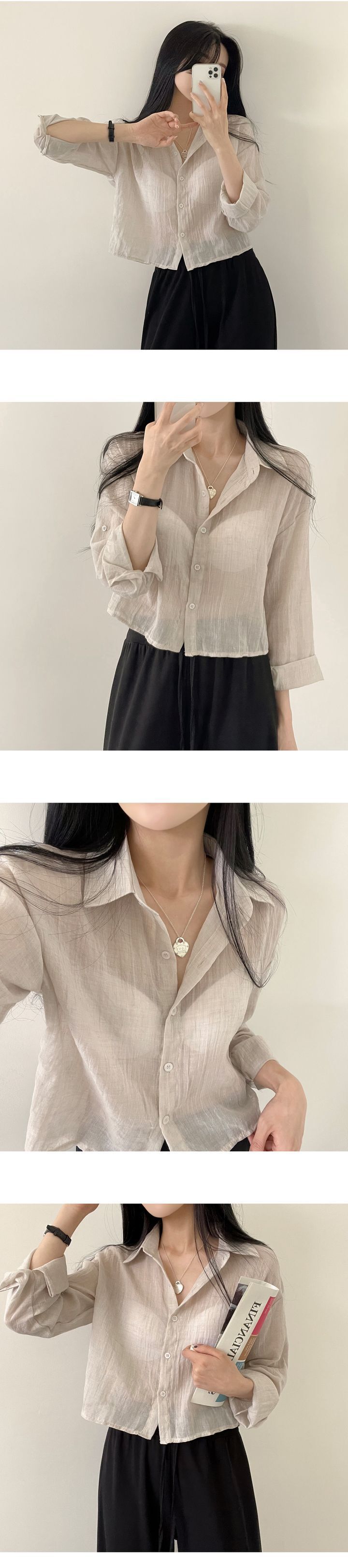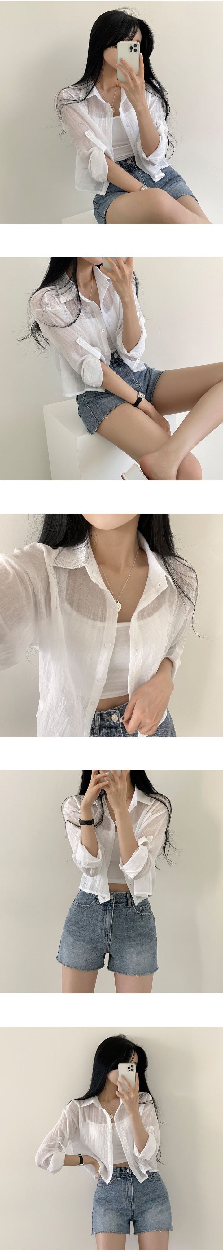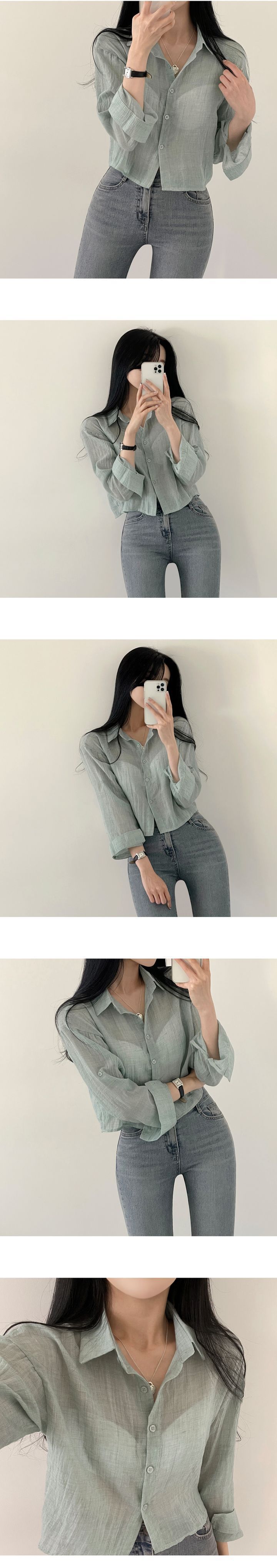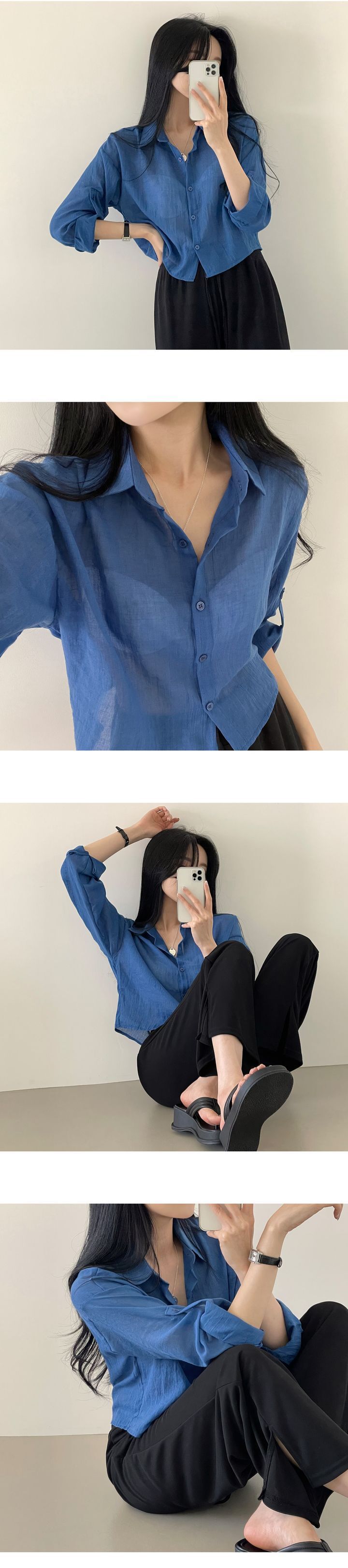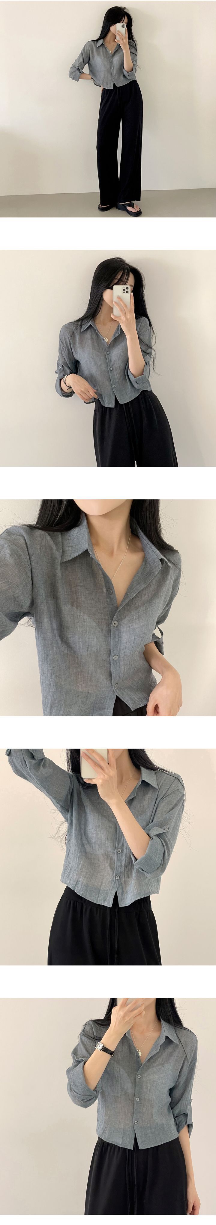 한국 세련된 나이를 줄이는 여성 싱글 브레스트 옷깃 주름 긴 소매 셔츠 느슨한 짧은 선 스크린 셔츠스토어 가기