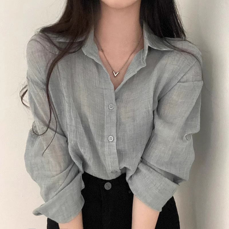 한국 세련된 나이를 줄이는 여성 싱글 브레스트 옷깃 주름 긴 소매 셔츠 느슨한 짧은 선 스크린 셔츠