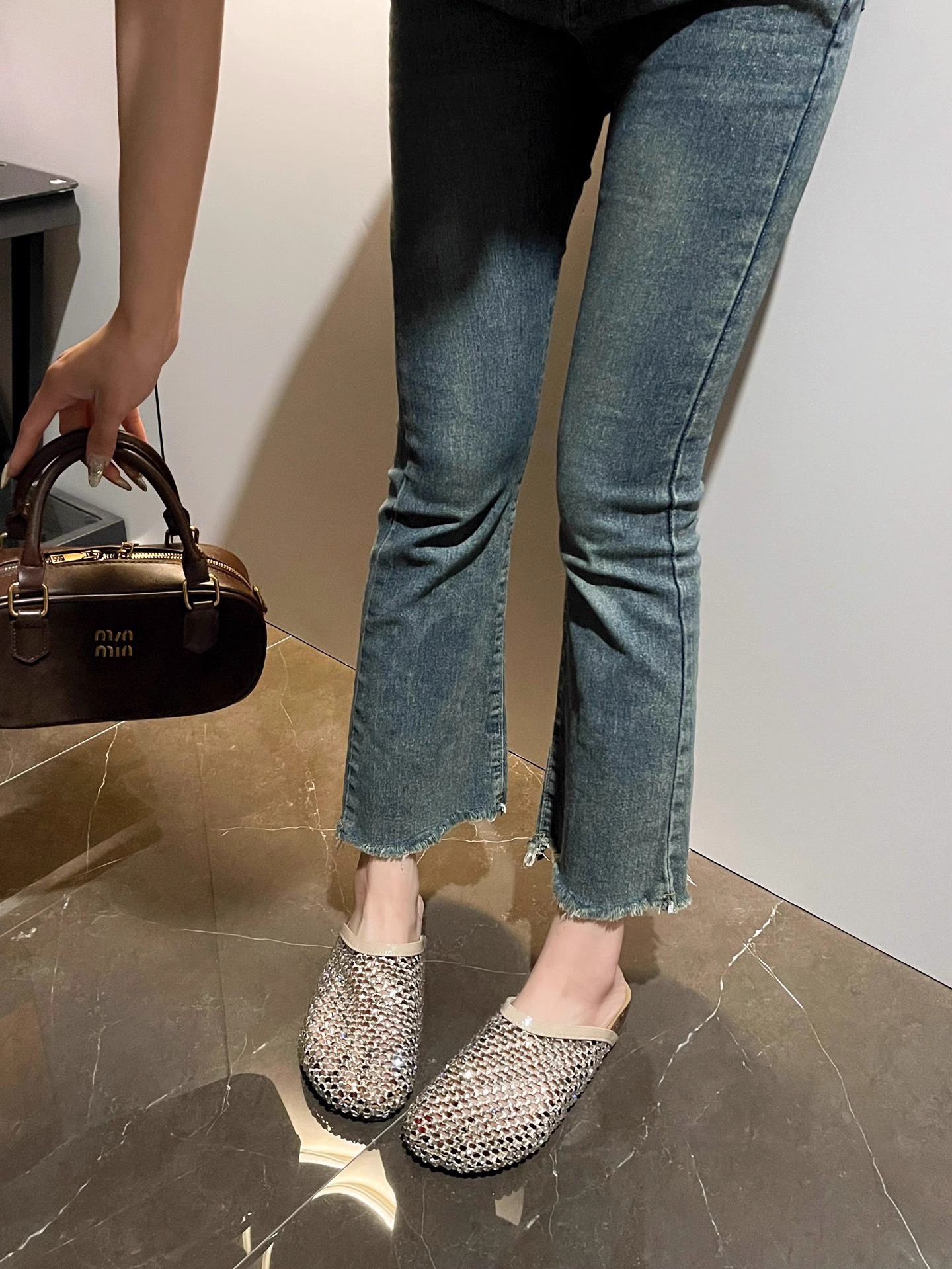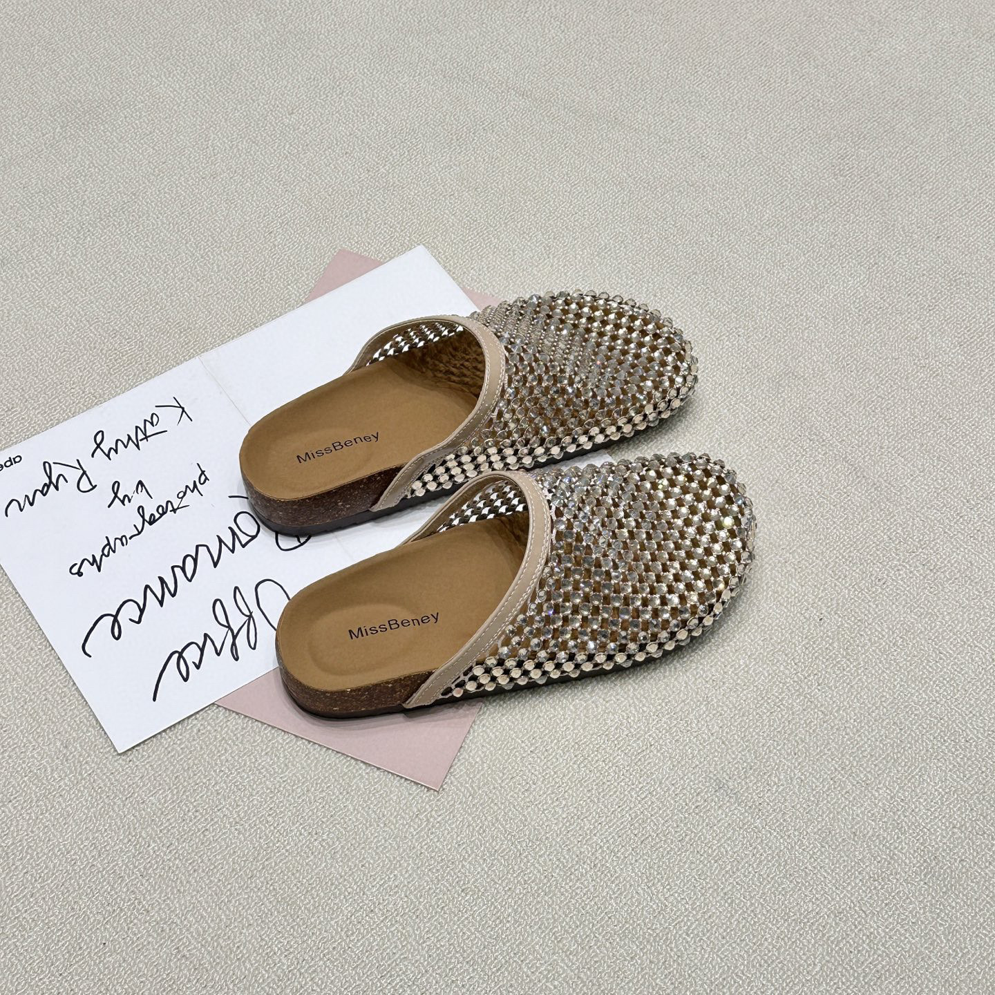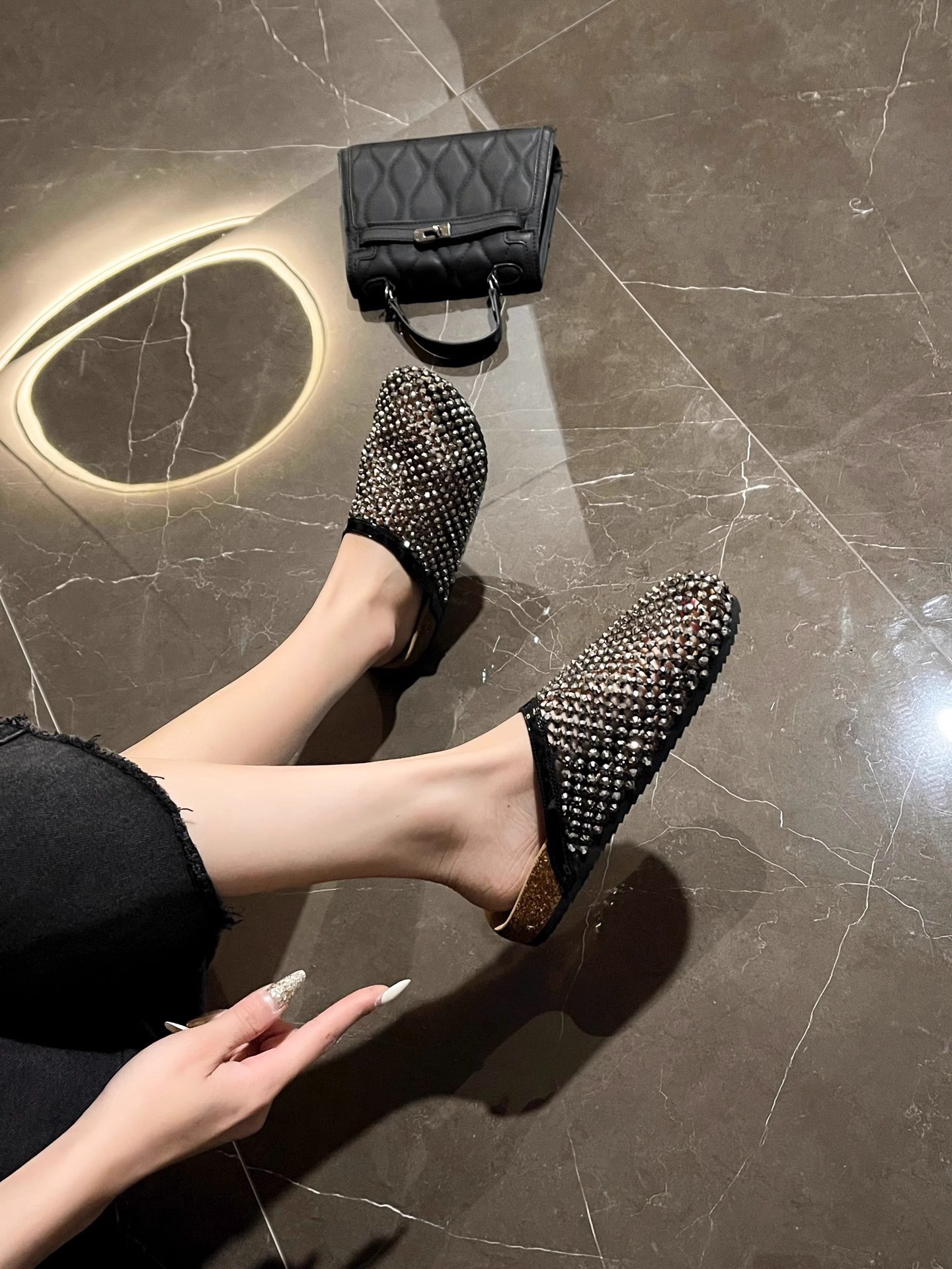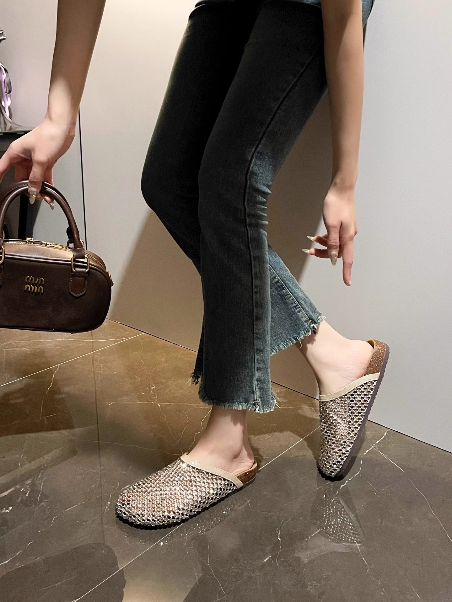 여성용 두꺼운 밑창 신발 틈새 정품 가죽 홀리데이 스타일 모조 다이아몬드 반 견인 여성의 2025 유럽 역 메쉬 짠 바오터우 견인스토어 가기