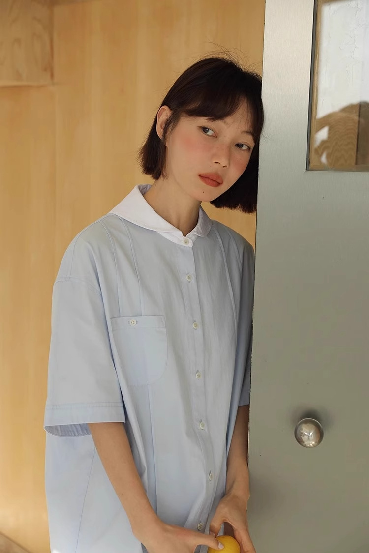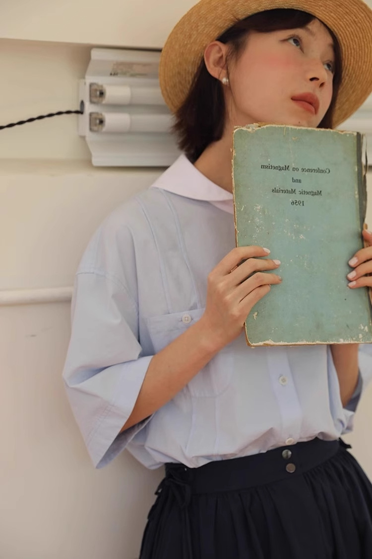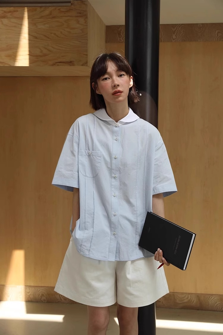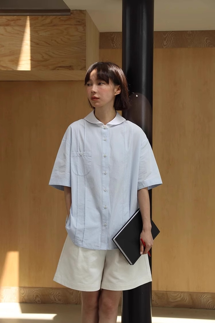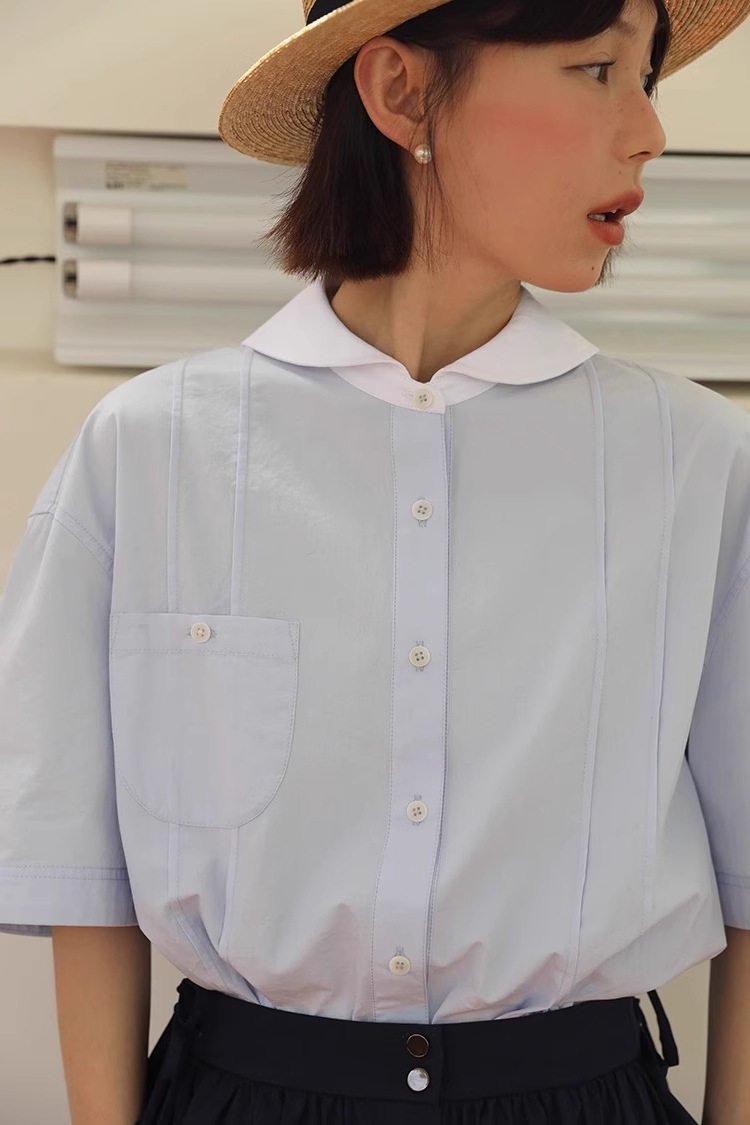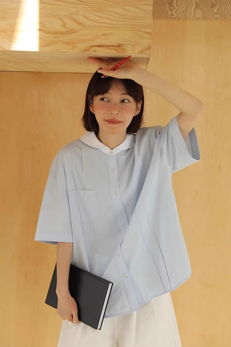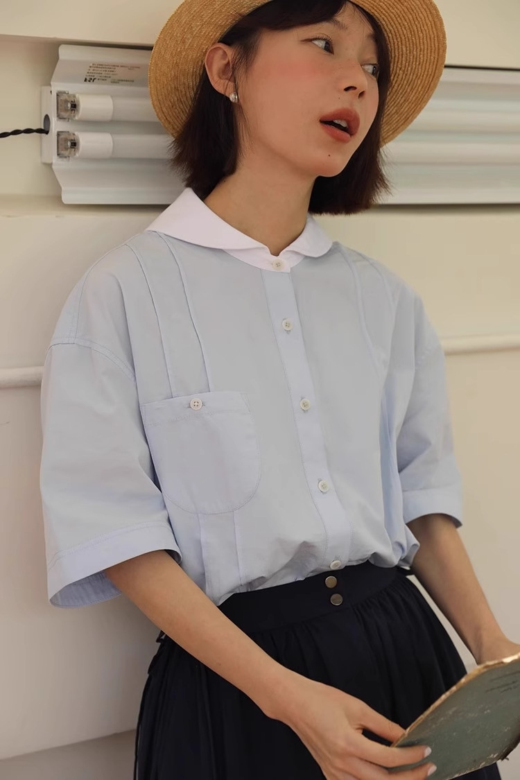도파민 블루 주름 셔츠 여성의 여름 슬림 셔츠 일본 대학 스타일 독특한 연령 감소 인형 칼라 탑스토어 가기