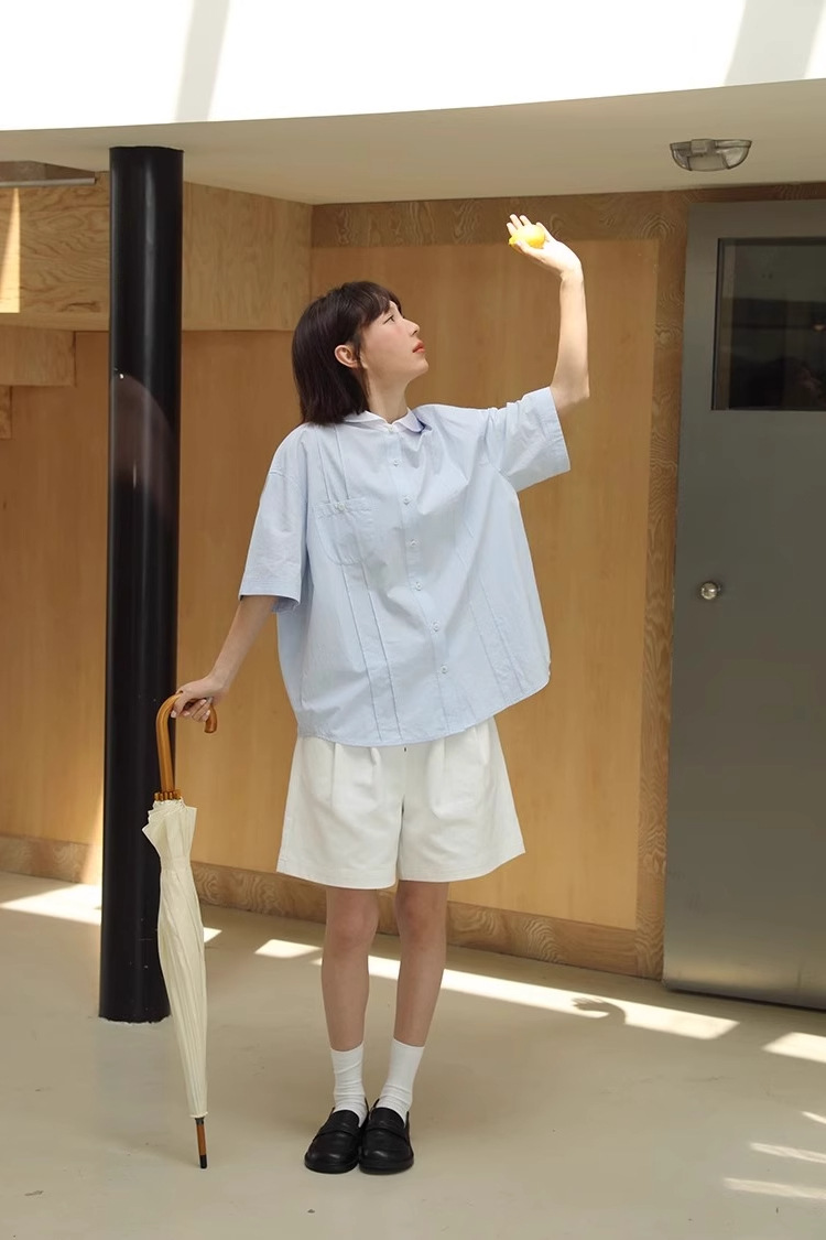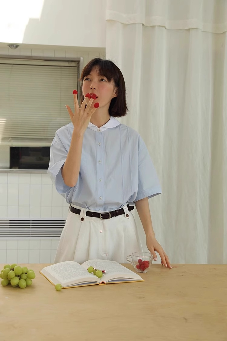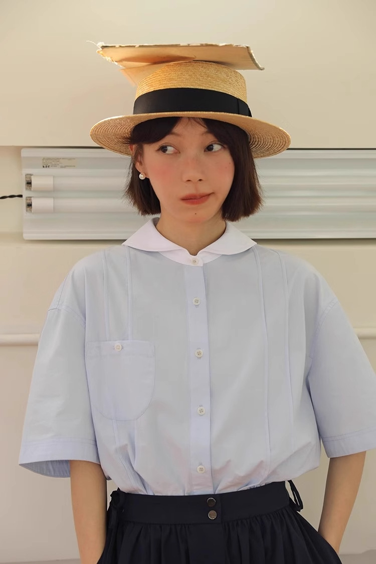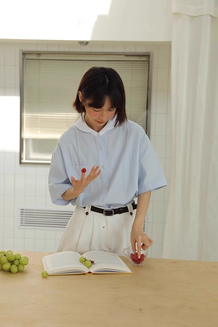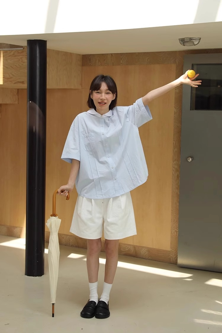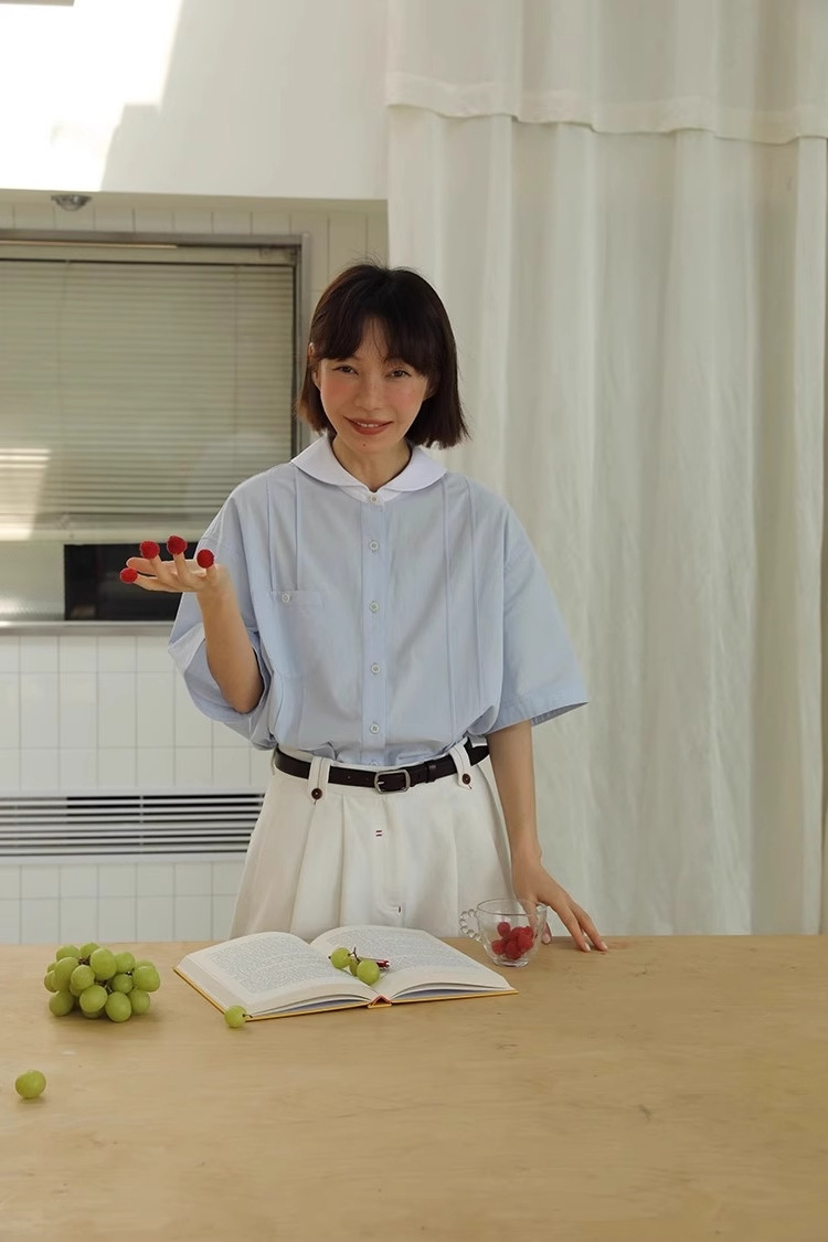 도파민 블루 주름 셔츠 여성의 여름 슬림 셔츠 일본 대학 스타일 독특한 연령 감소 인형 칼라 탑스토어 가기