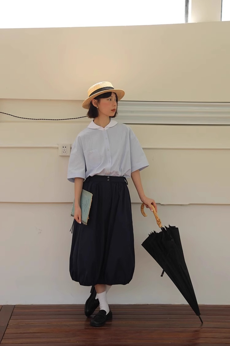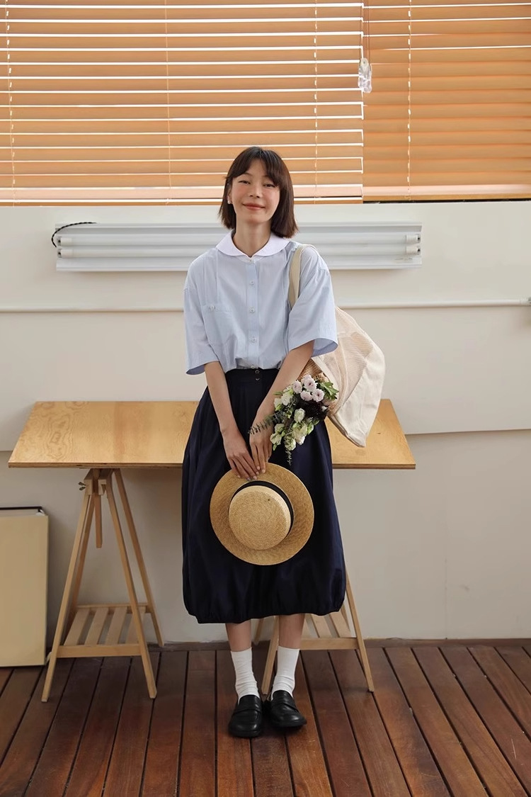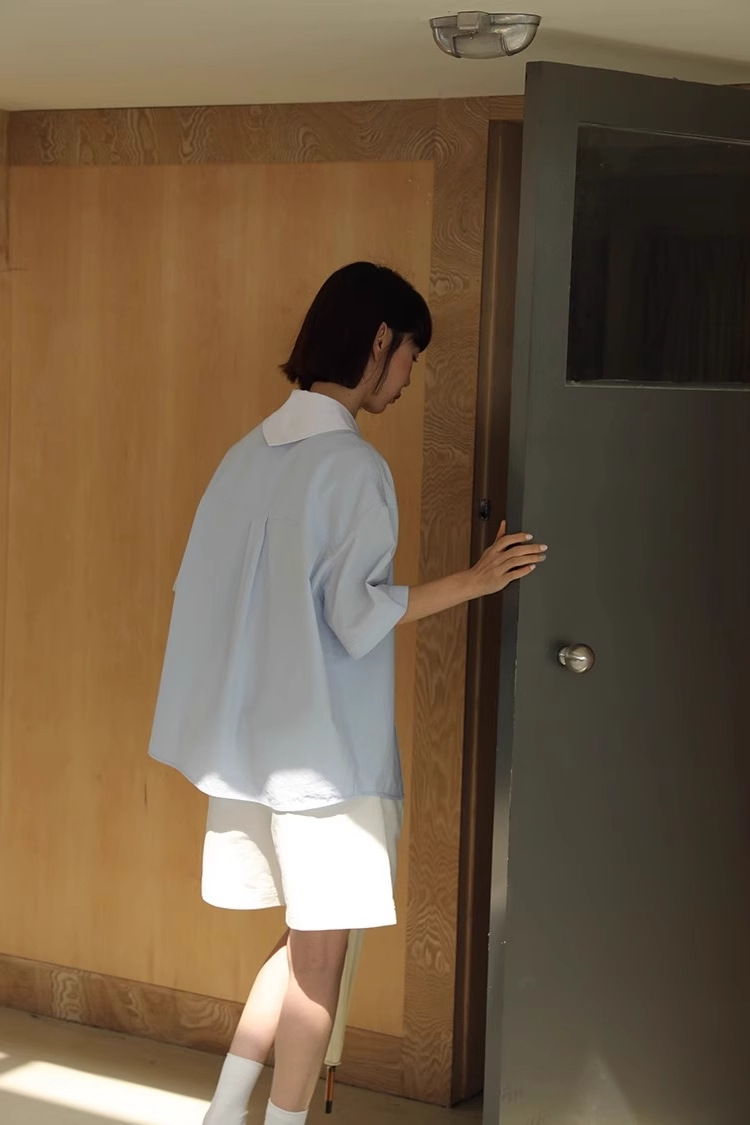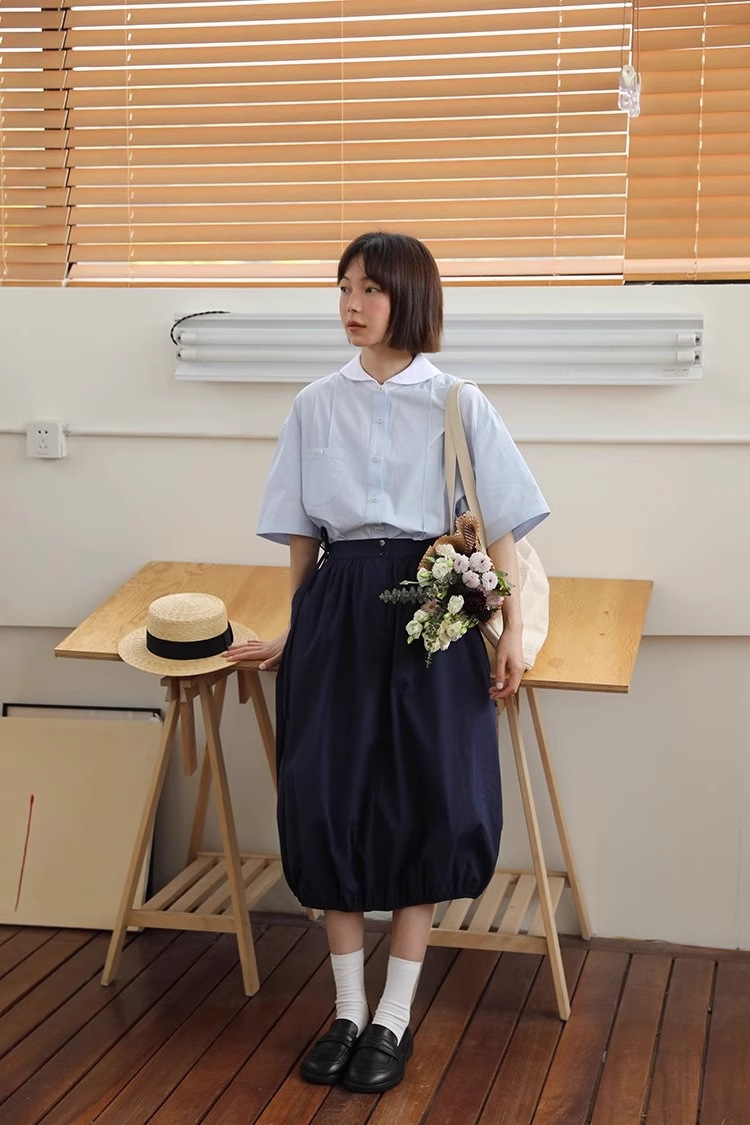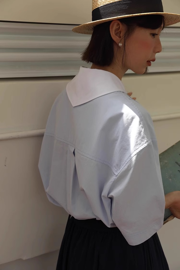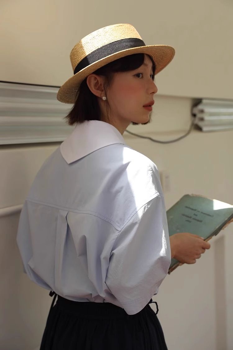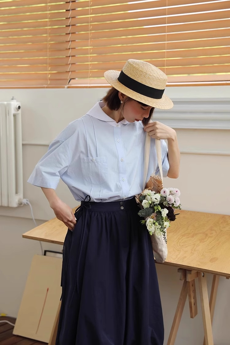 도파민 블루 주름 셔츠 여성의 여름 슬림 셔츠 일본 대학 스타일 독특한 연령 감소 인형 칼라 탑스토어 가기