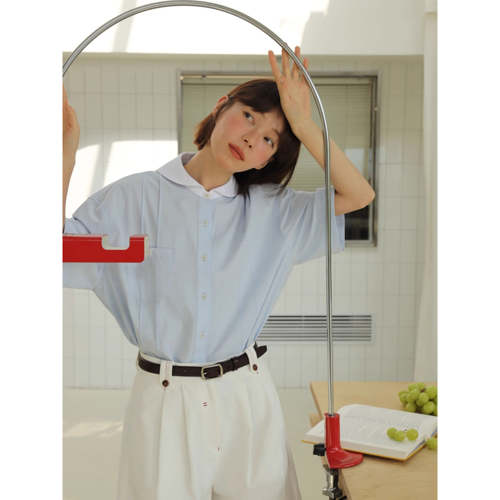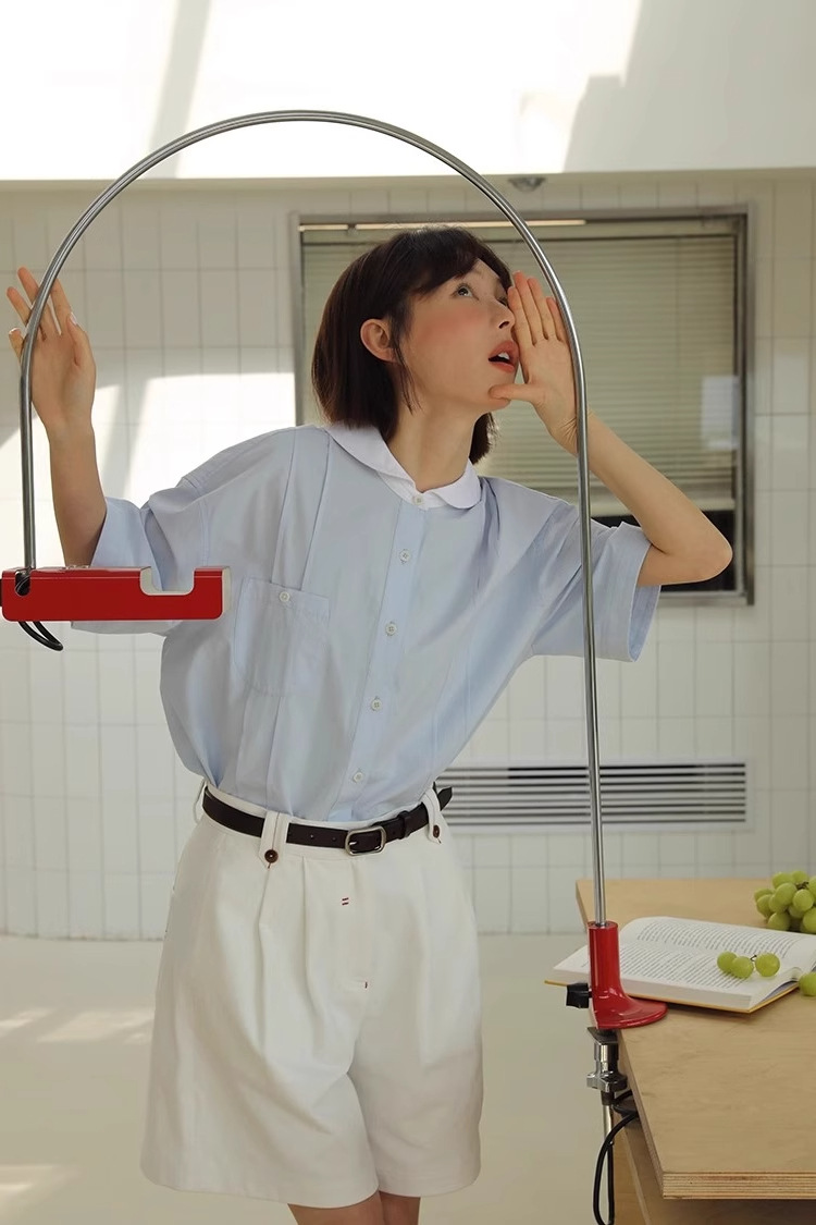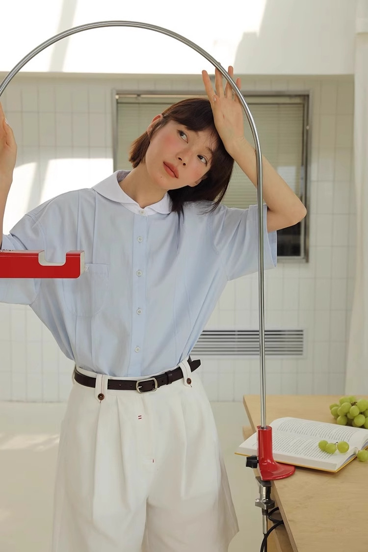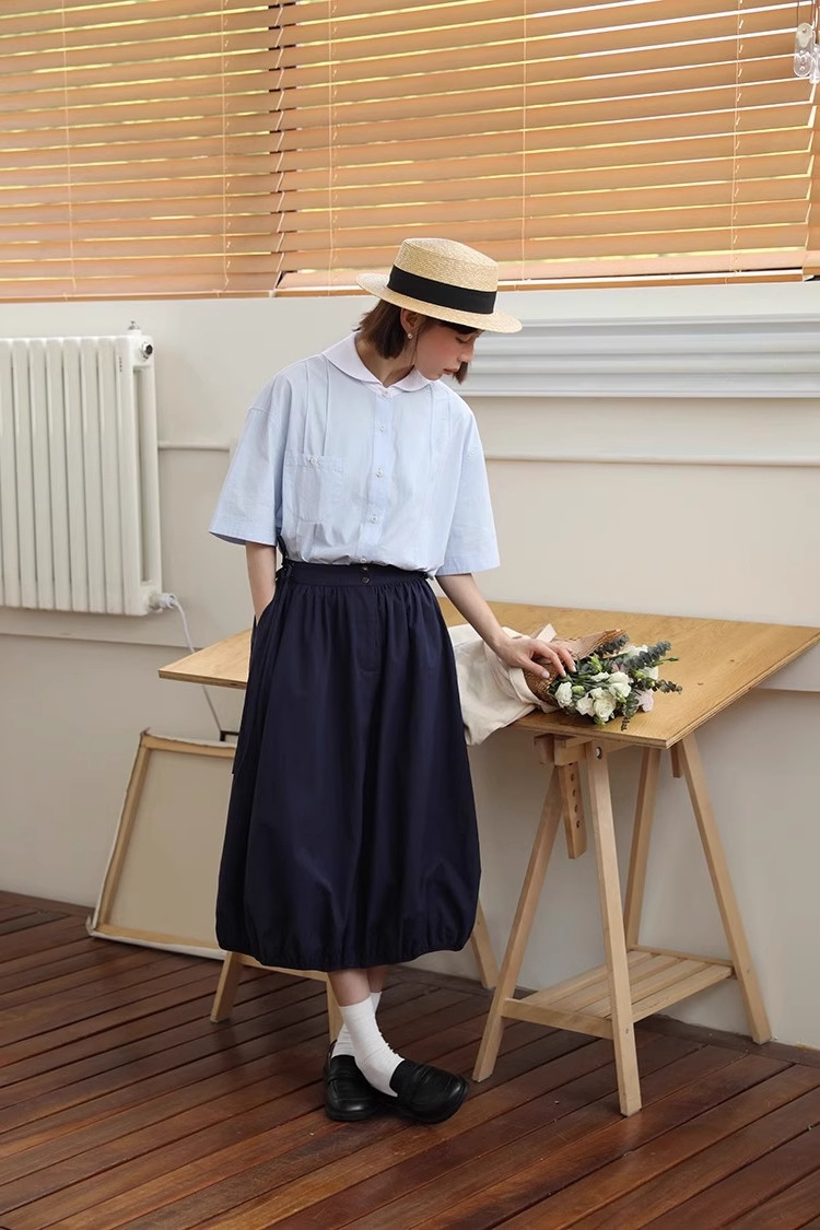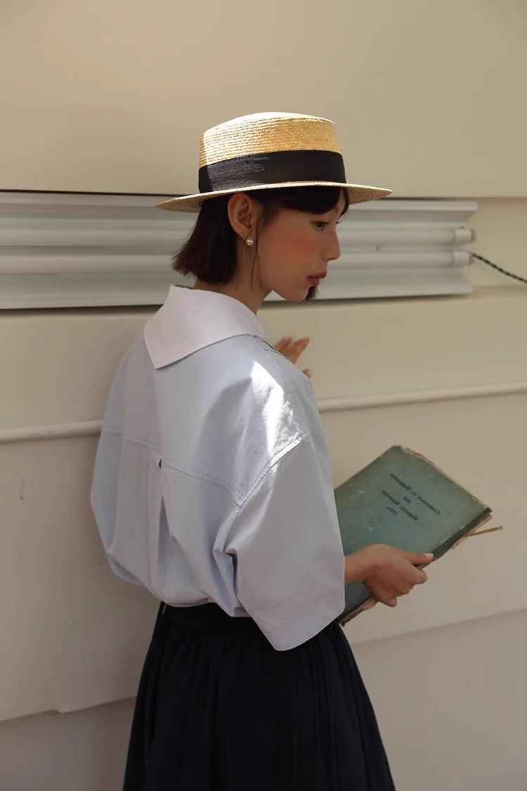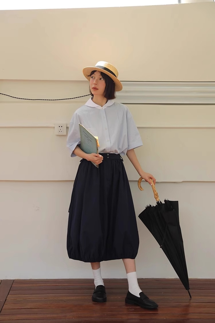 도파민 블루 주름 셔츠 여성의 여름 슬림 셔츠 일본 대학 스타일 독특한 연령 감소 인형 칼라 탑스토어 가기