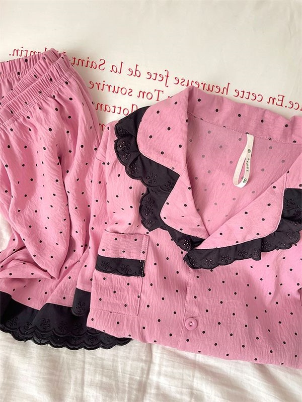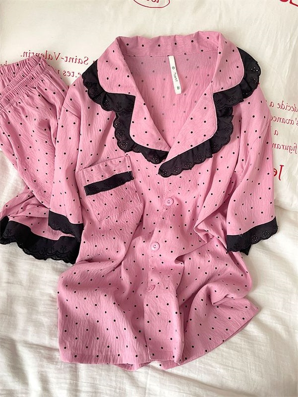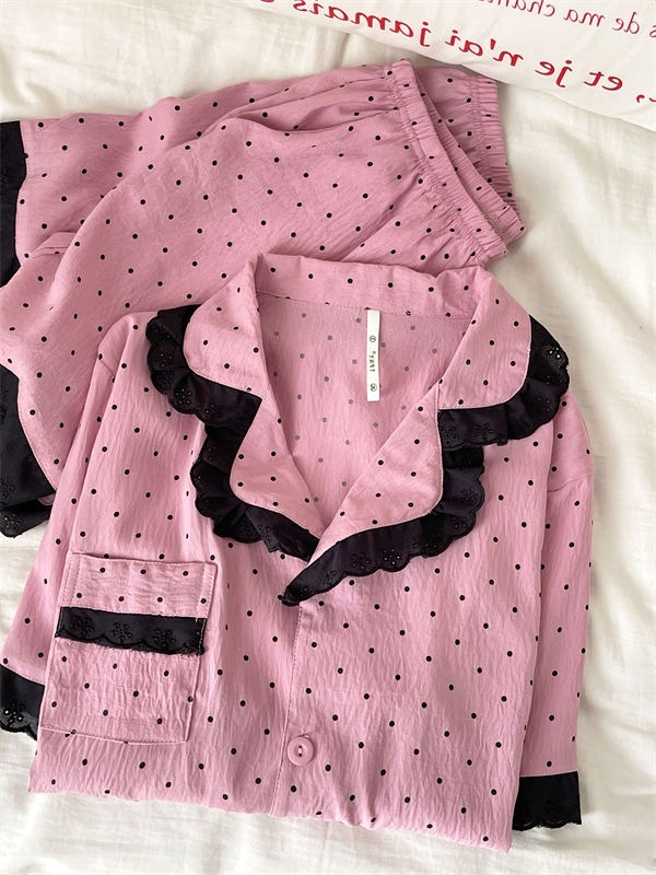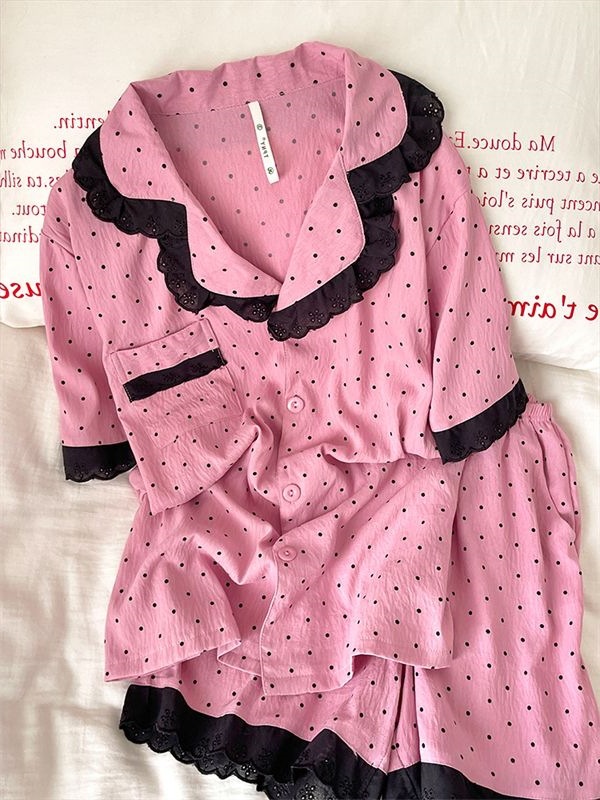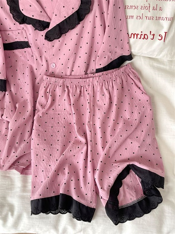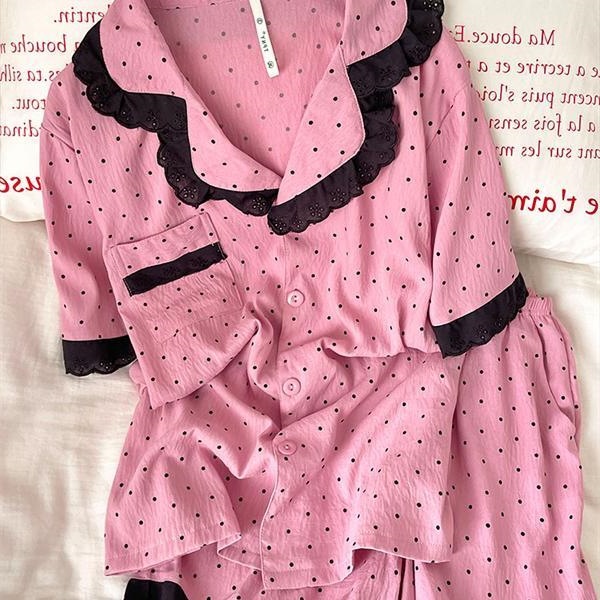 한국 스타일 귀여운 핑크 레이스 웨이브 닷 파자마 여성 2025 새로운 짧은 소매 반바지 여름 한국 스타일 홈 의류 세트
