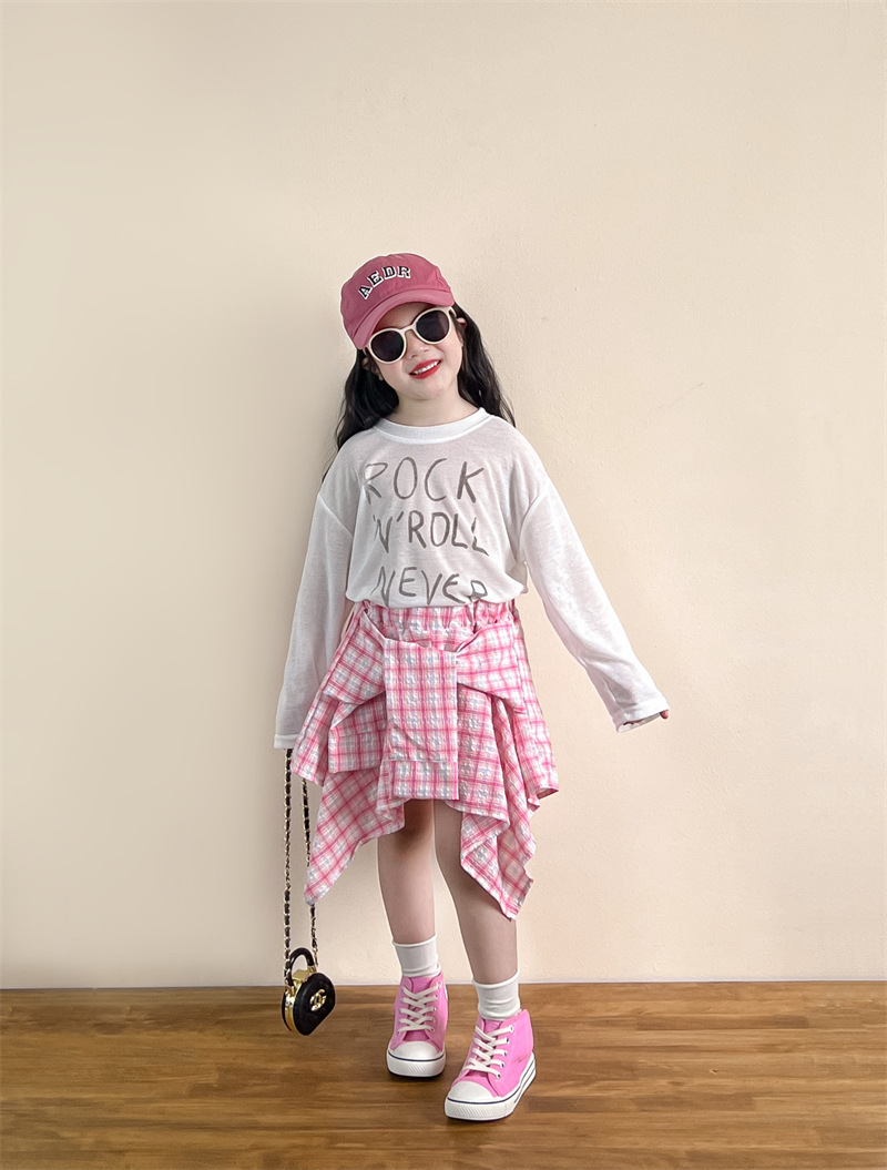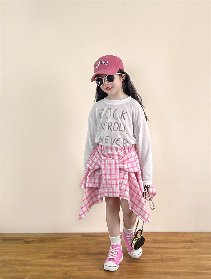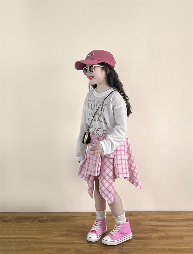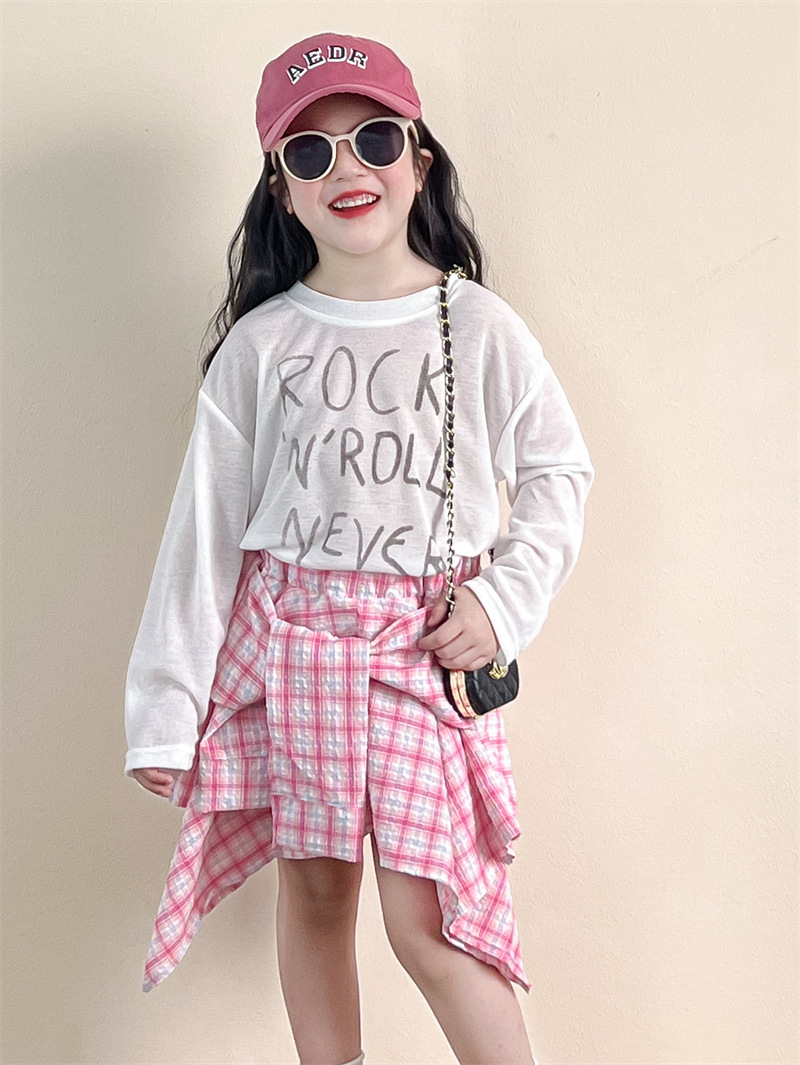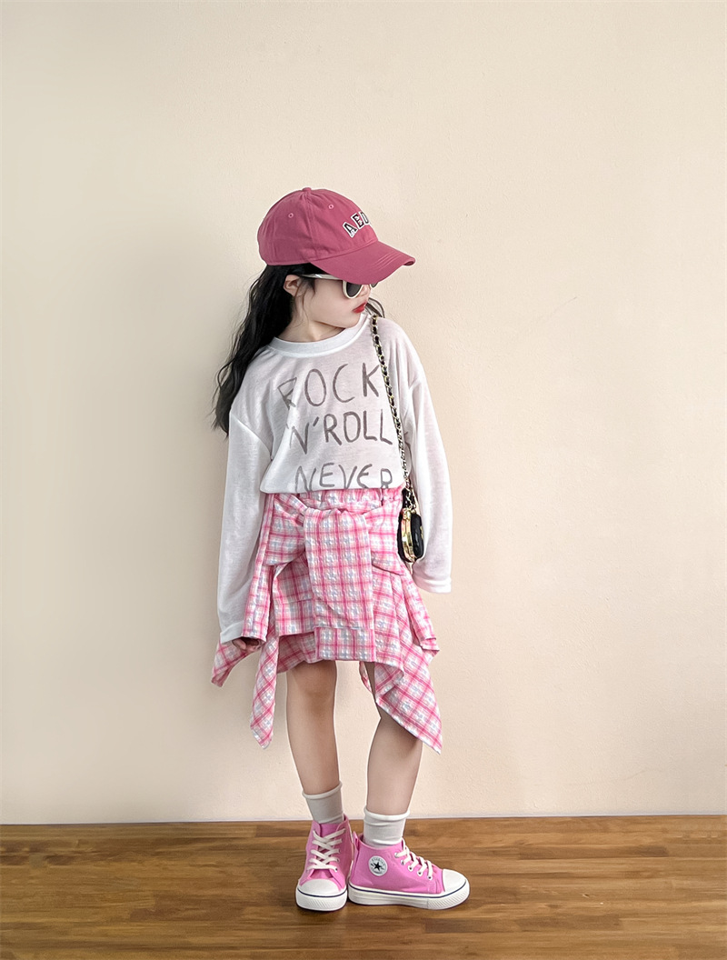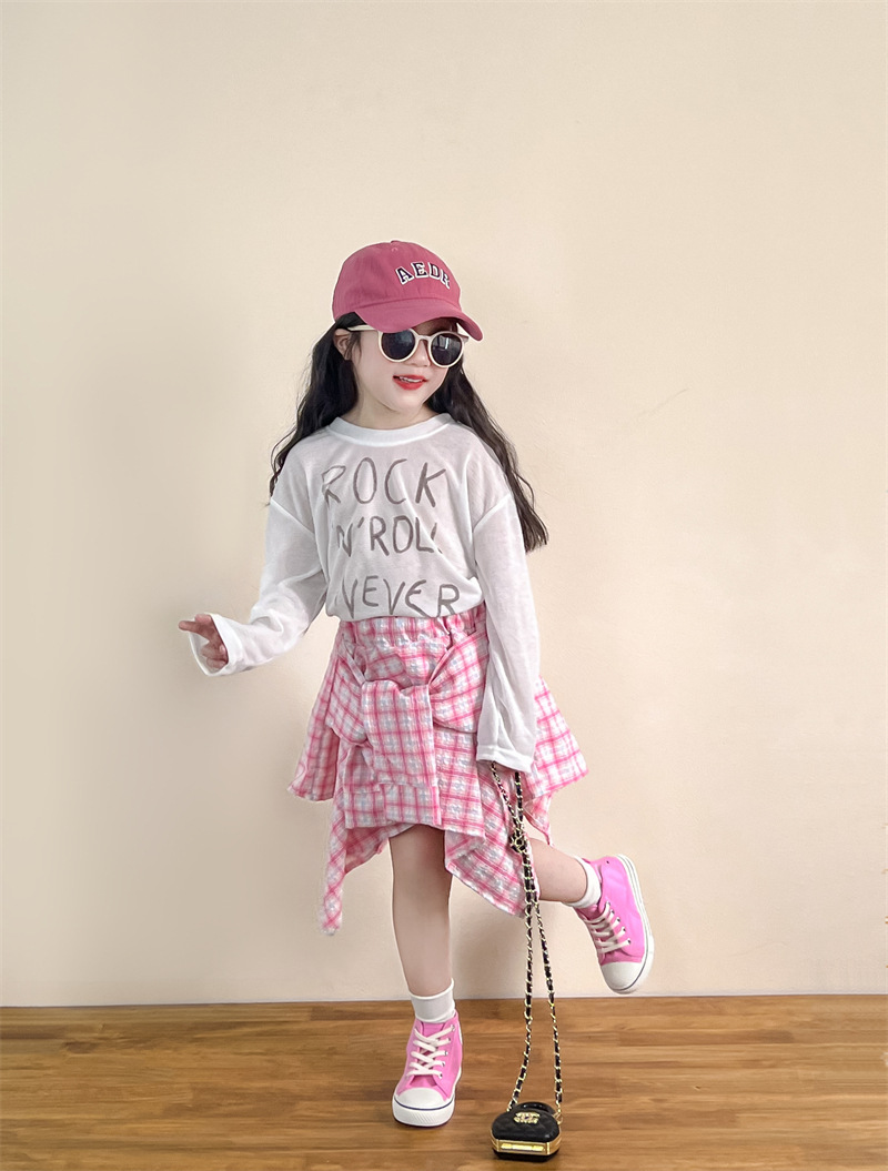 2025 새로운 한국 스타일 얇은 인쇄 된 편지 선 스크린 티셔츠 아카데미 스타일 파우더 쌍 불규칙한 높은 허리 스커트 바지