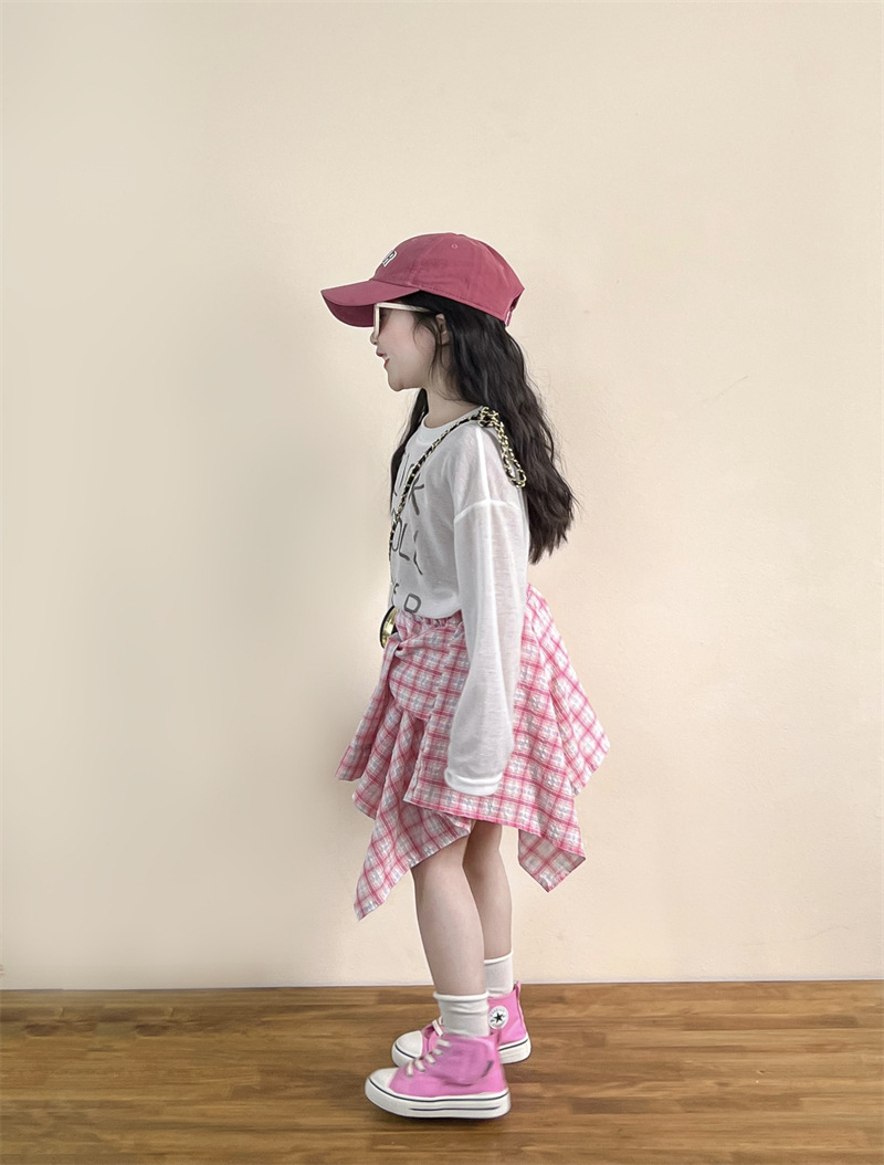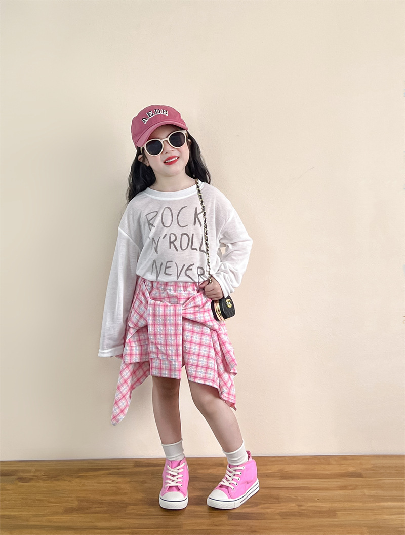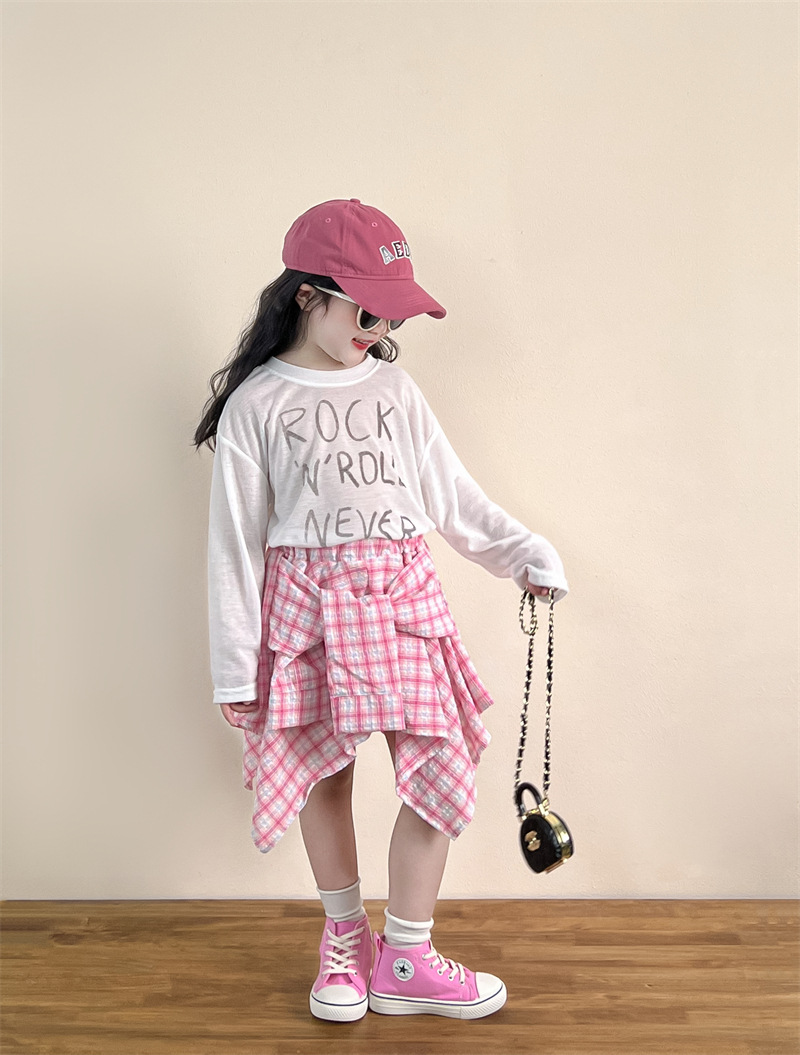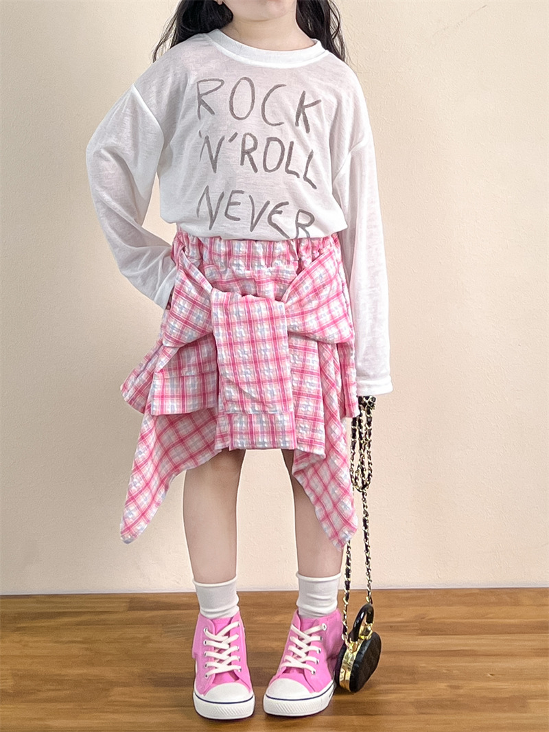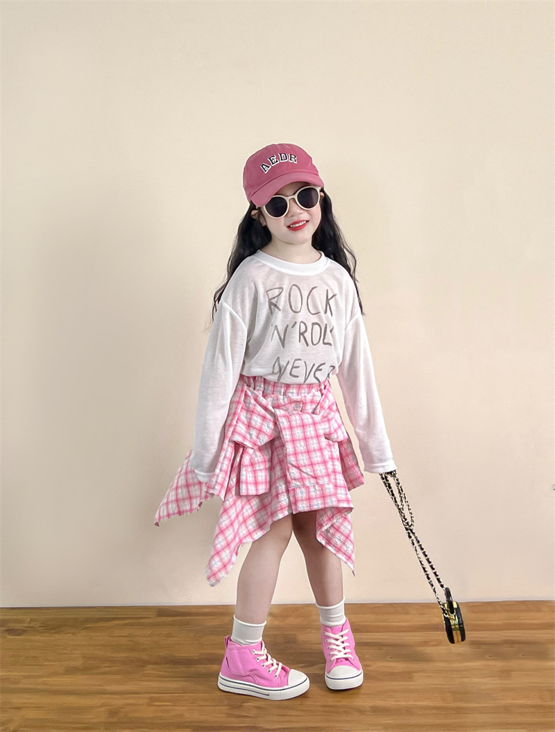 2025 새로운 한국 스타일 얇은 인쇄 된 편지 선 스크린 티셔츠 아카데미 스타일 파우더 쌍 불규칙한 높은 허리 스커트 바지