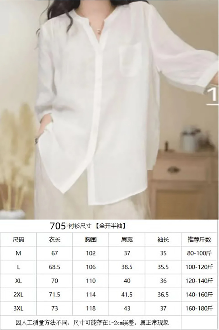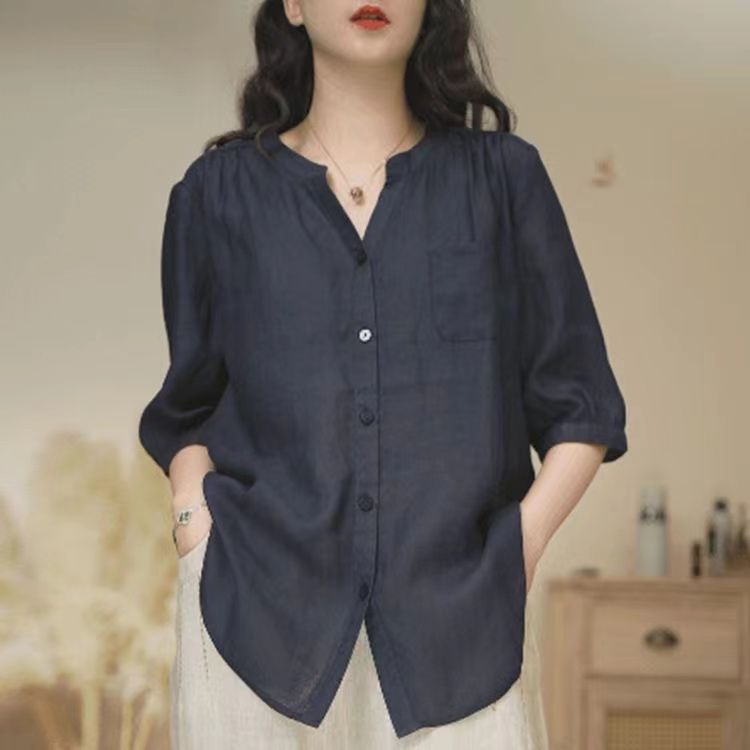 캐주얼 통근 아티스틱 레트로 캐주얼 하프 슬리브 코튼 리넨 셔츠 탑 여름 새로운 올 매치 V 넥 디자인 센스 여성