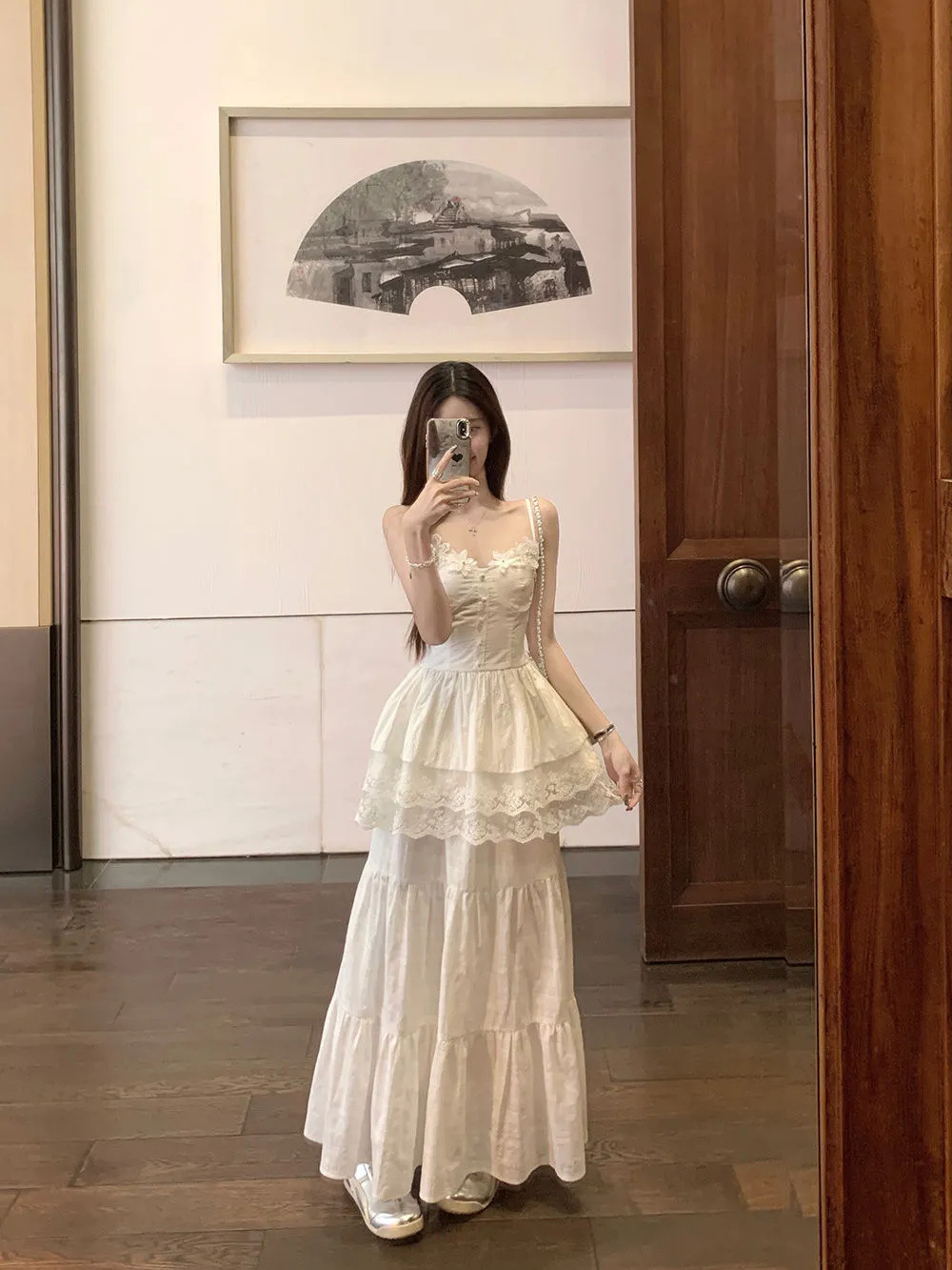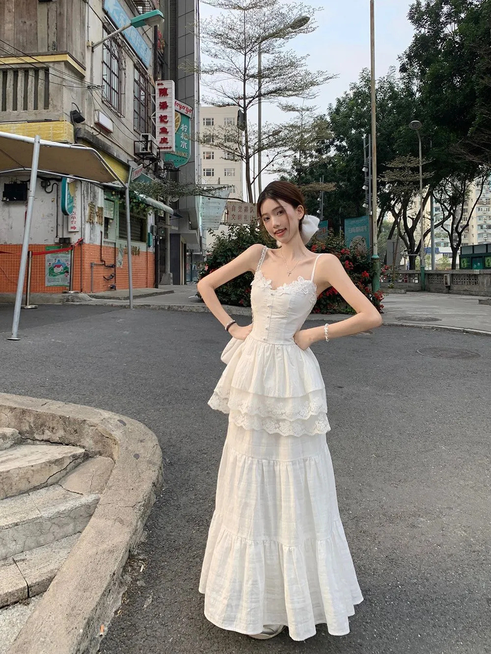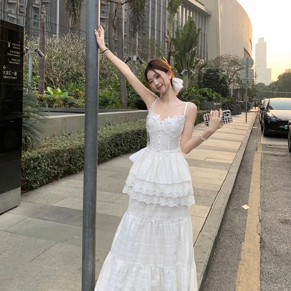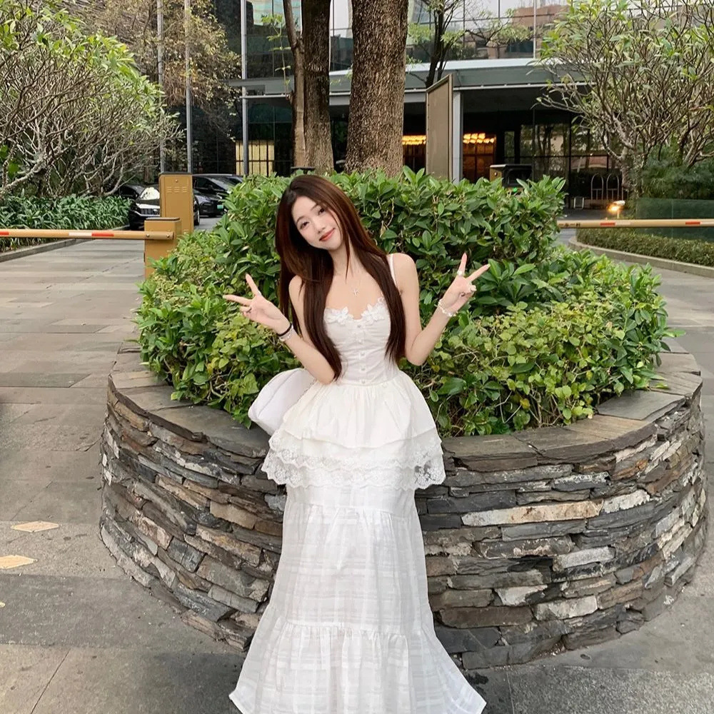 레이스 바느질 슬리밍 디자인 카미 솔 조끼 높은 허리 반쪽 원피스 여성의 2025 여름 새로운 패션 세트