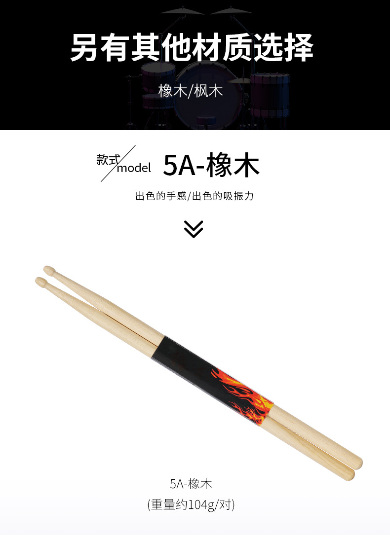 • 불꽃 골판지 스타일 오크 드럼 스틱 [5A]