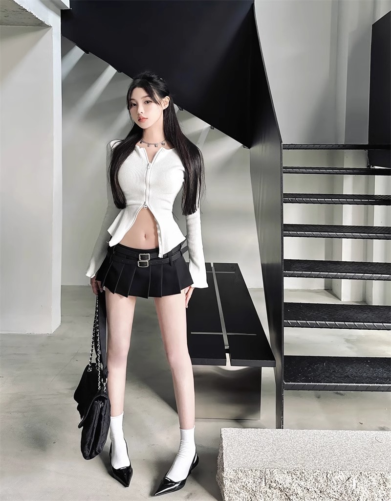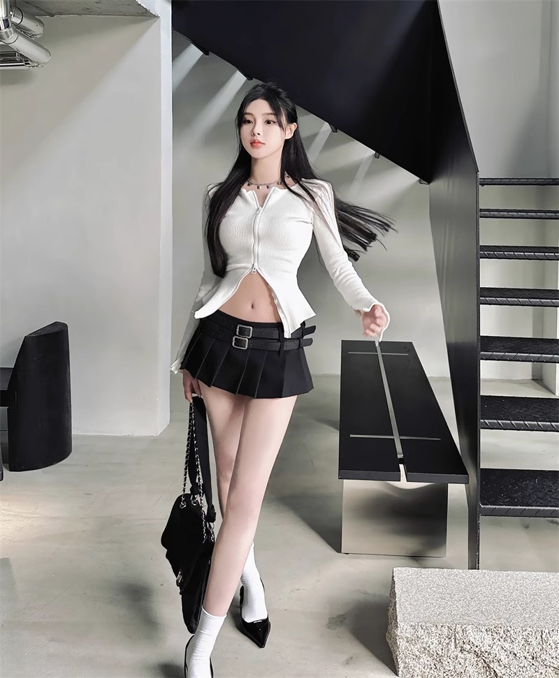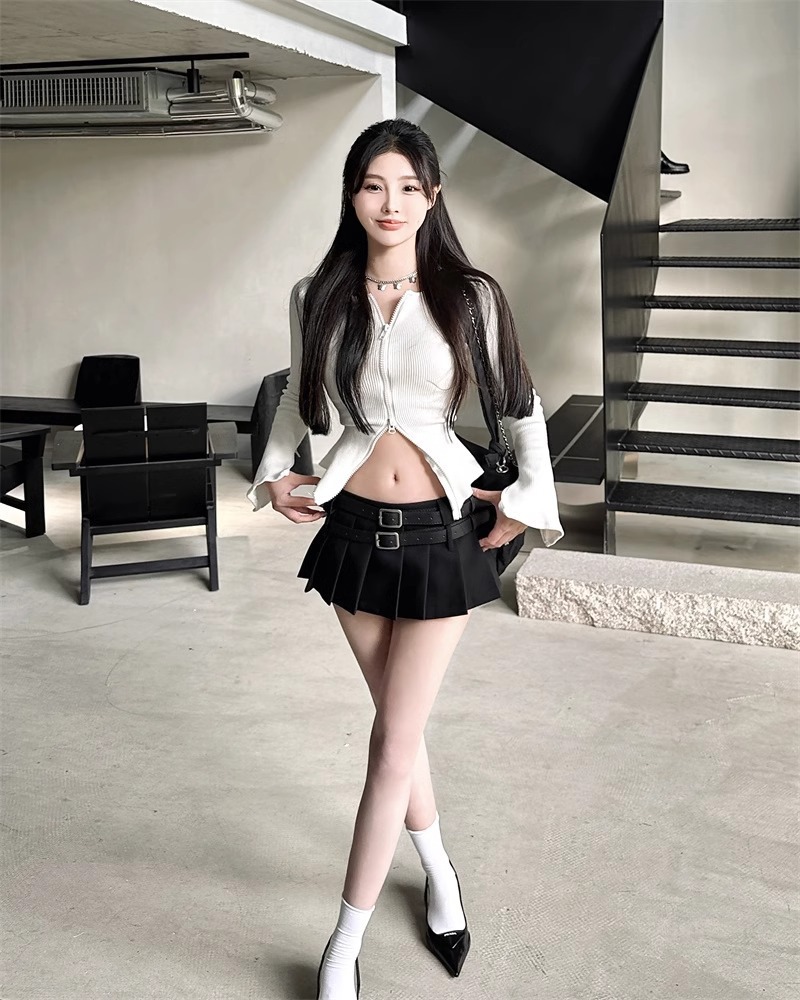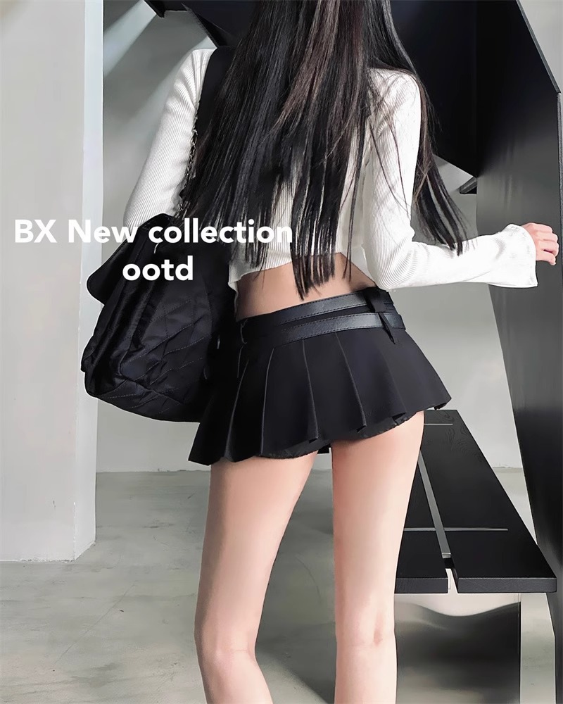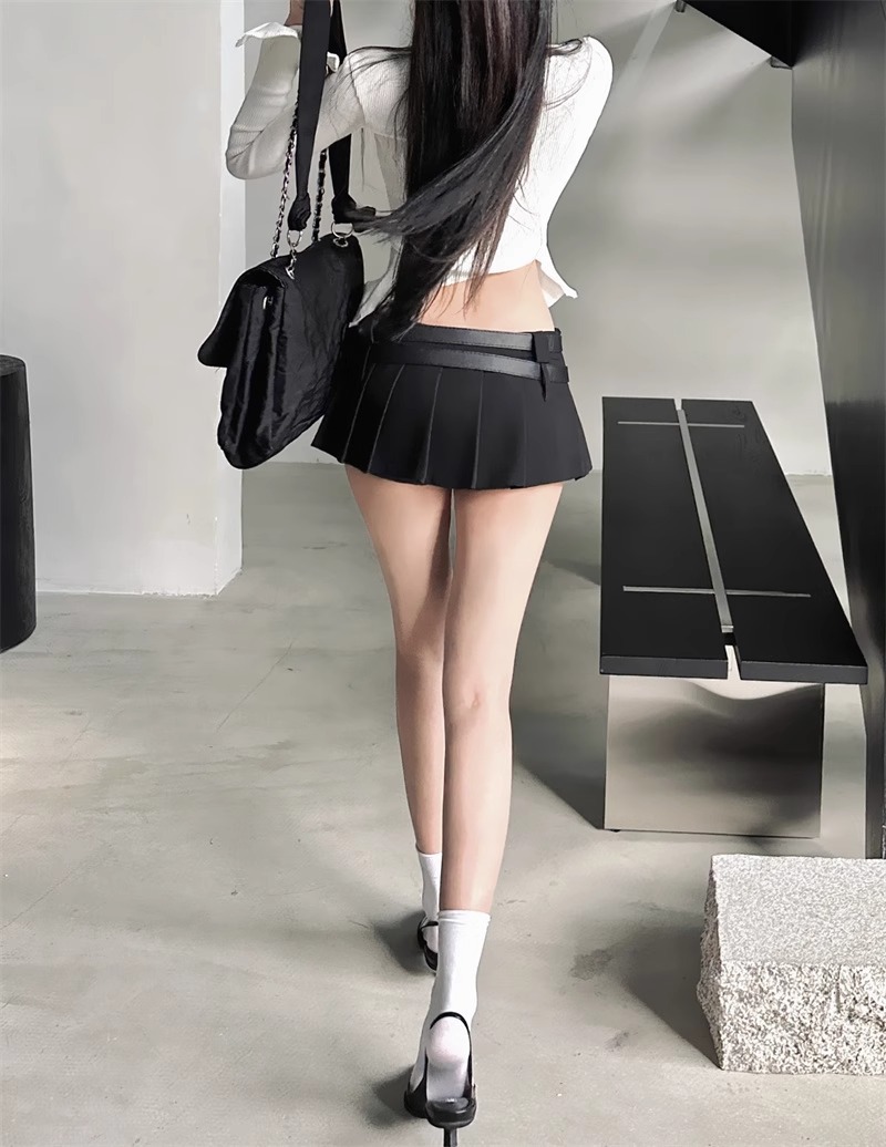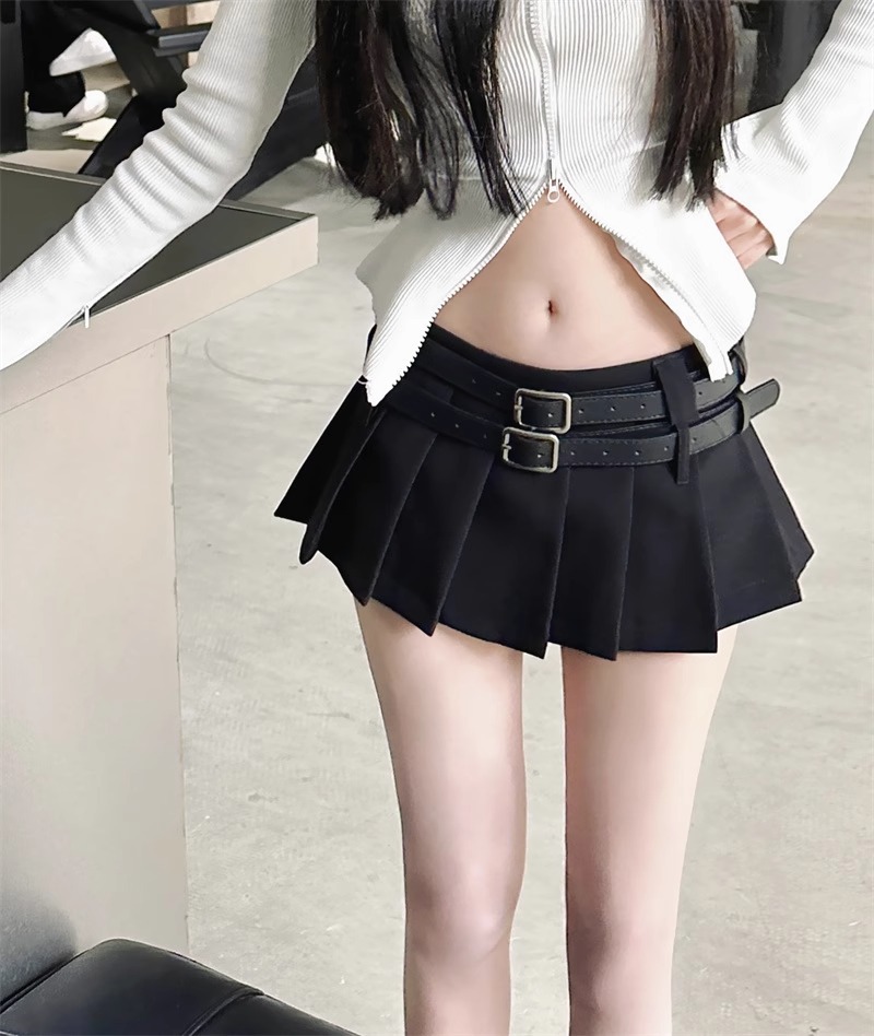 한국식 틈새 시크 더블 벨트 더블 허리 블랙 노출 방지 플리츠 스커트 핫걸 여성용 초짧은 로우 웨이스트 스커트