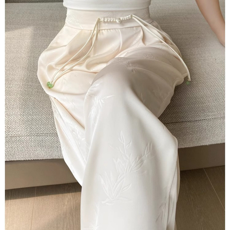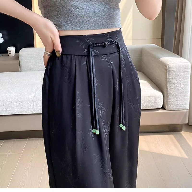새로운 중국 새틴 자카드 넓은 다리 바지 여성의 봄과 여름 2025 새로운 아치 버클 높은 허리 슬림 스트레이트 캐주얼 바지