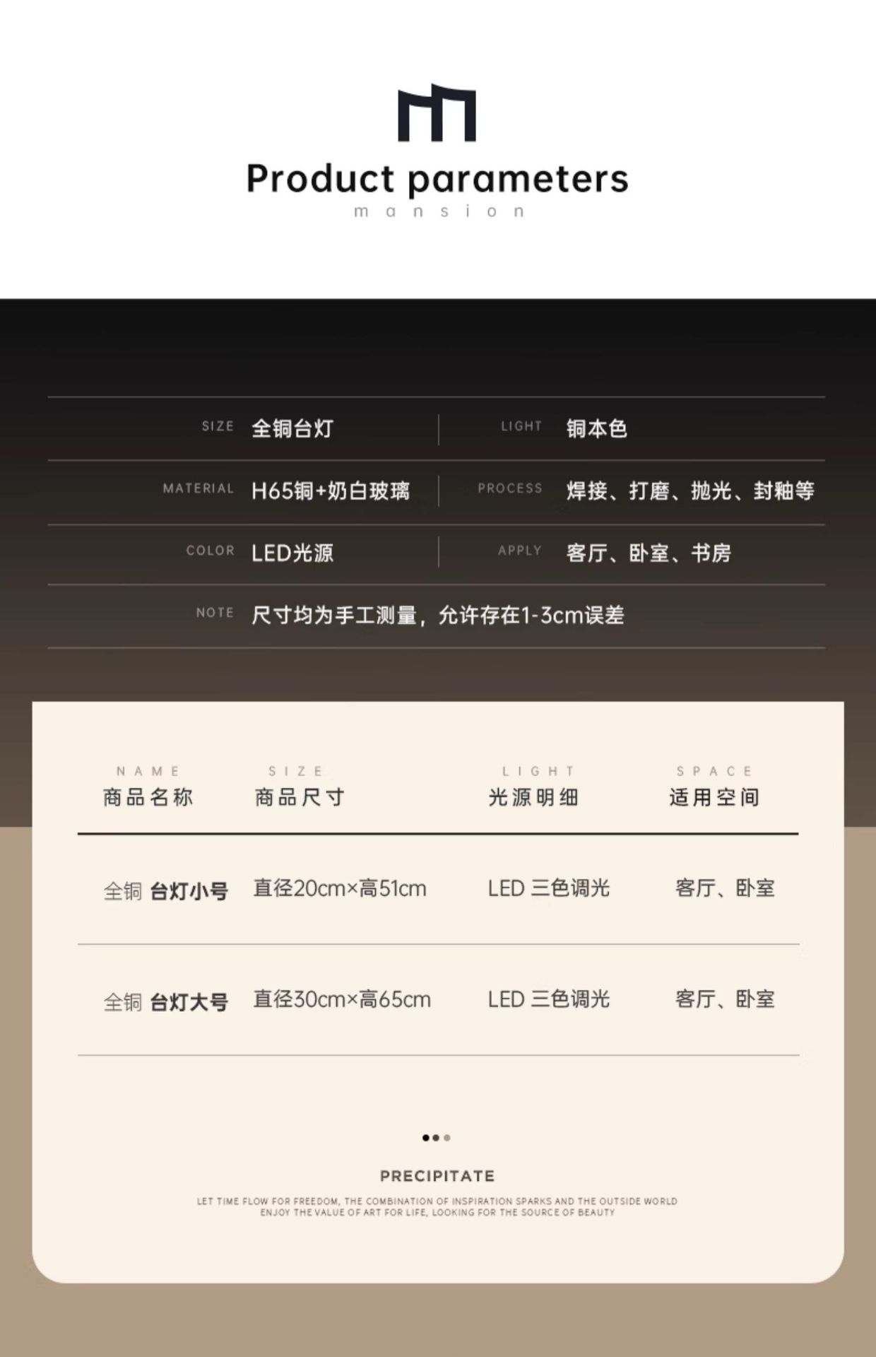 • 소형 - 직경 15x 높이 51cm [전체 구리 소재] 3색 디밍