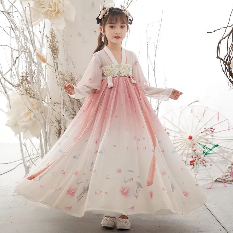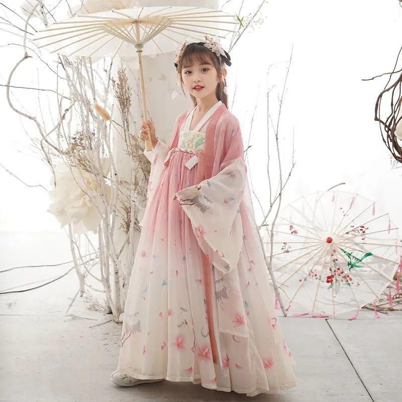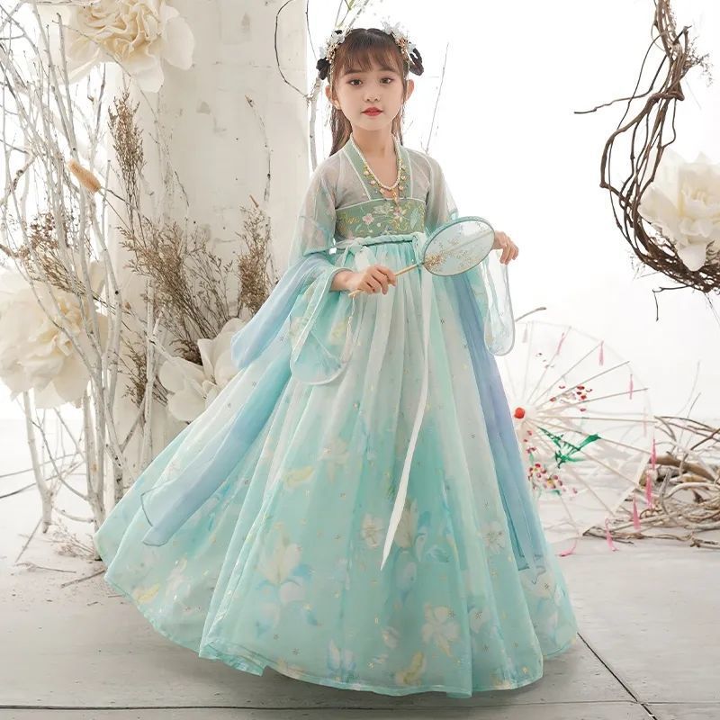 새로운 스타일의 소녀 Hanfu 여름 고대 의상 중국 스타일 어린이 스커트 슈퍼 요정 우아한 봄과 가을 고대 스타일 소녀 드레스