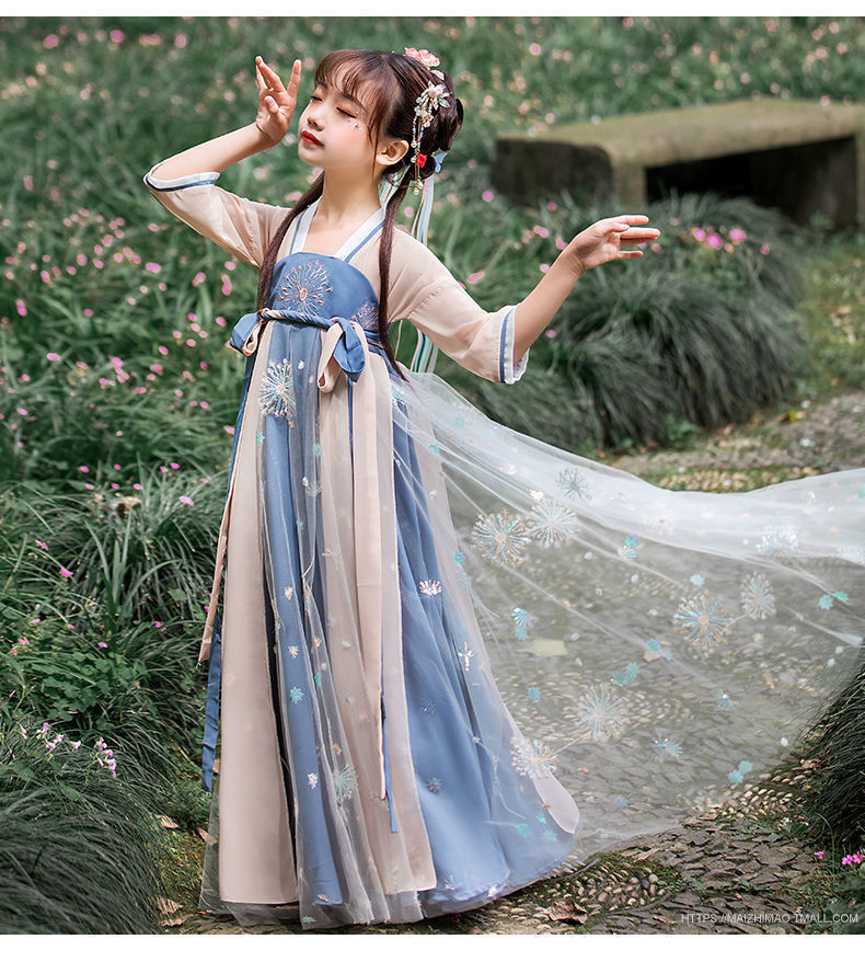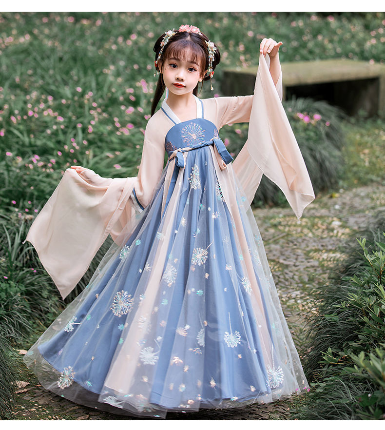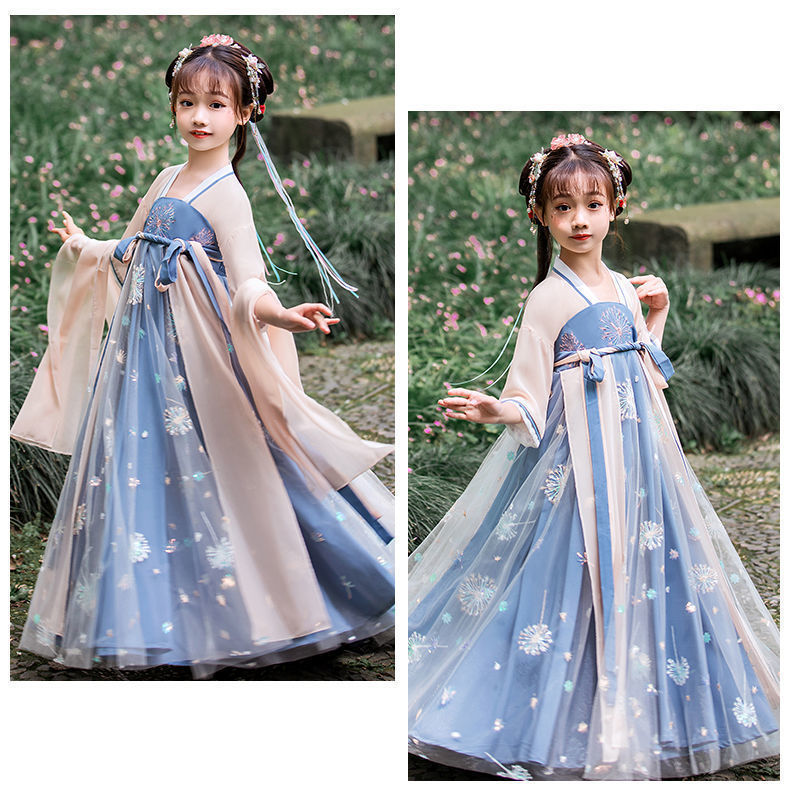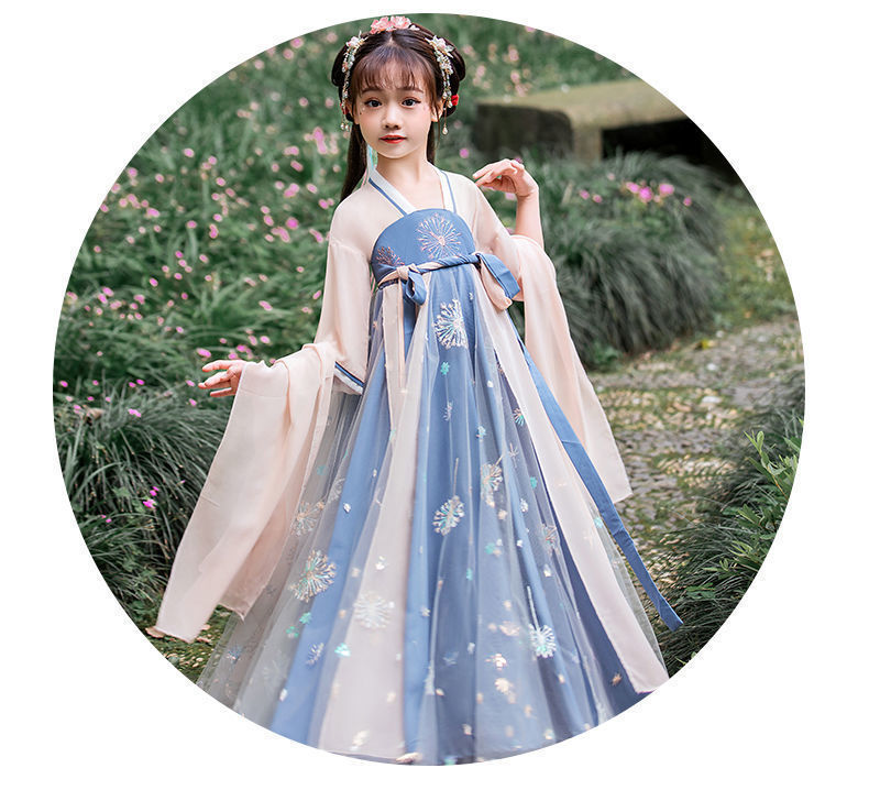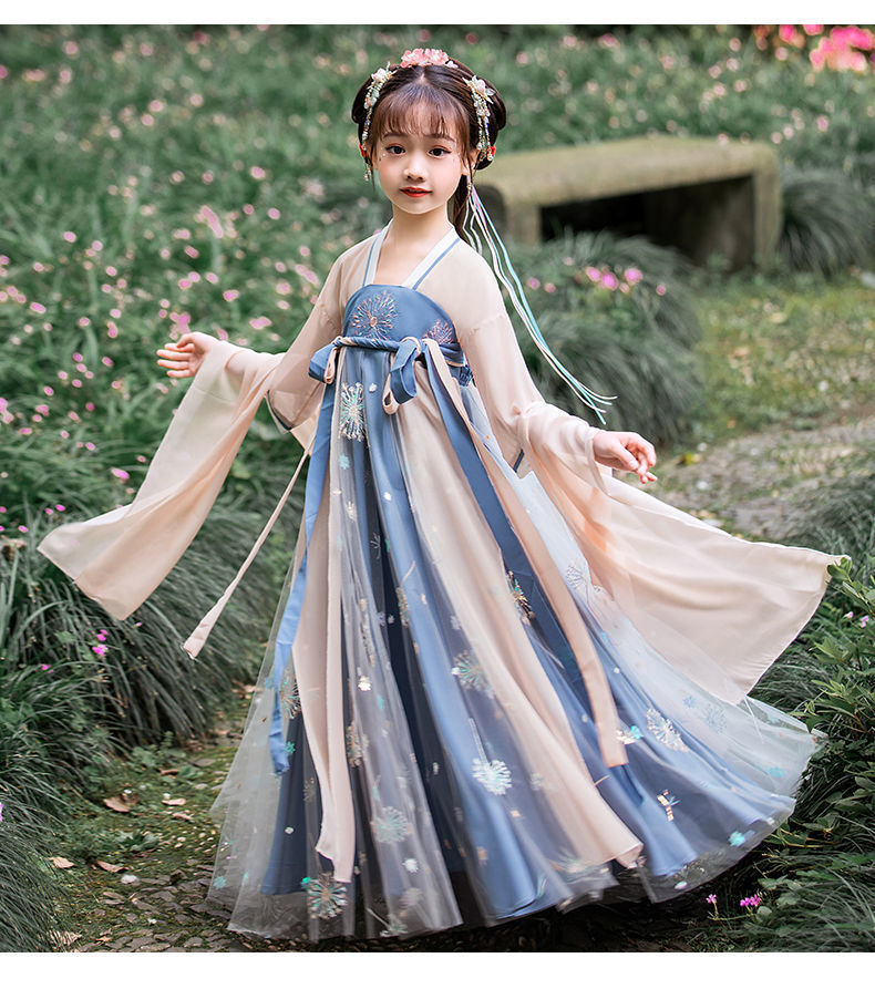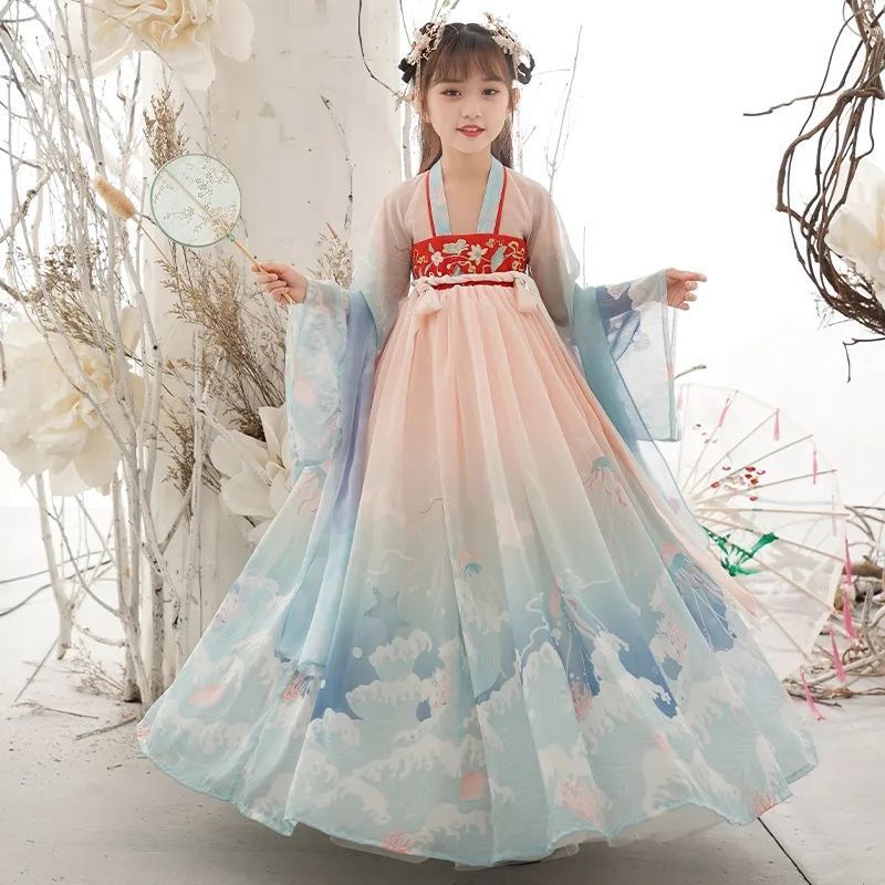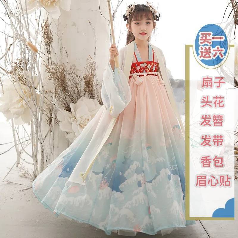 새로운 스타일의 소녀 Hanfu 여름 고대 의상 중국 스타일 어린이 스커트 슈퍼 요정 우아한 봄과 가을 고대 스타일 소녀 드레스스토어 가기