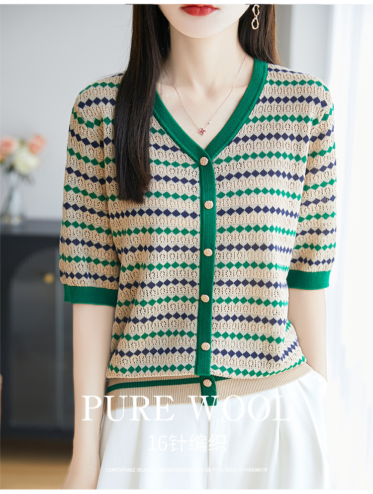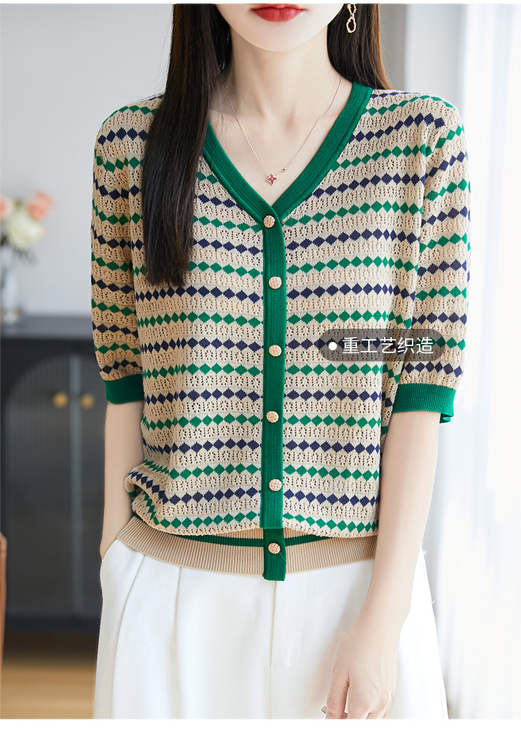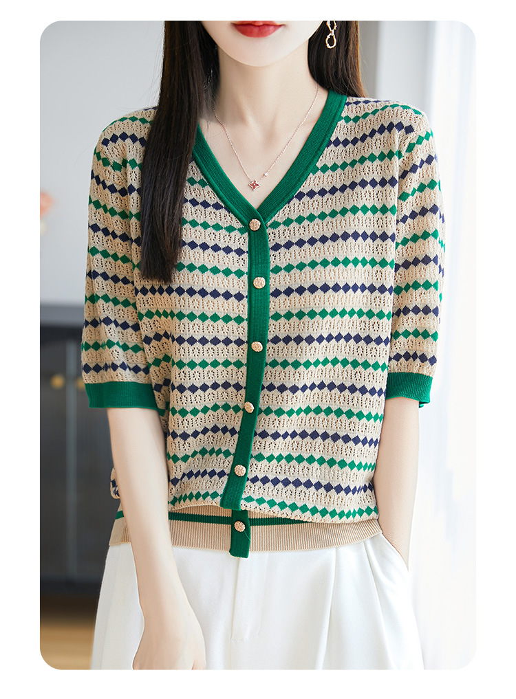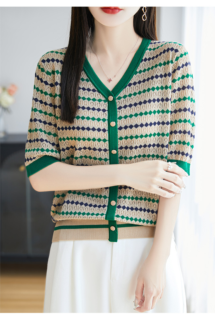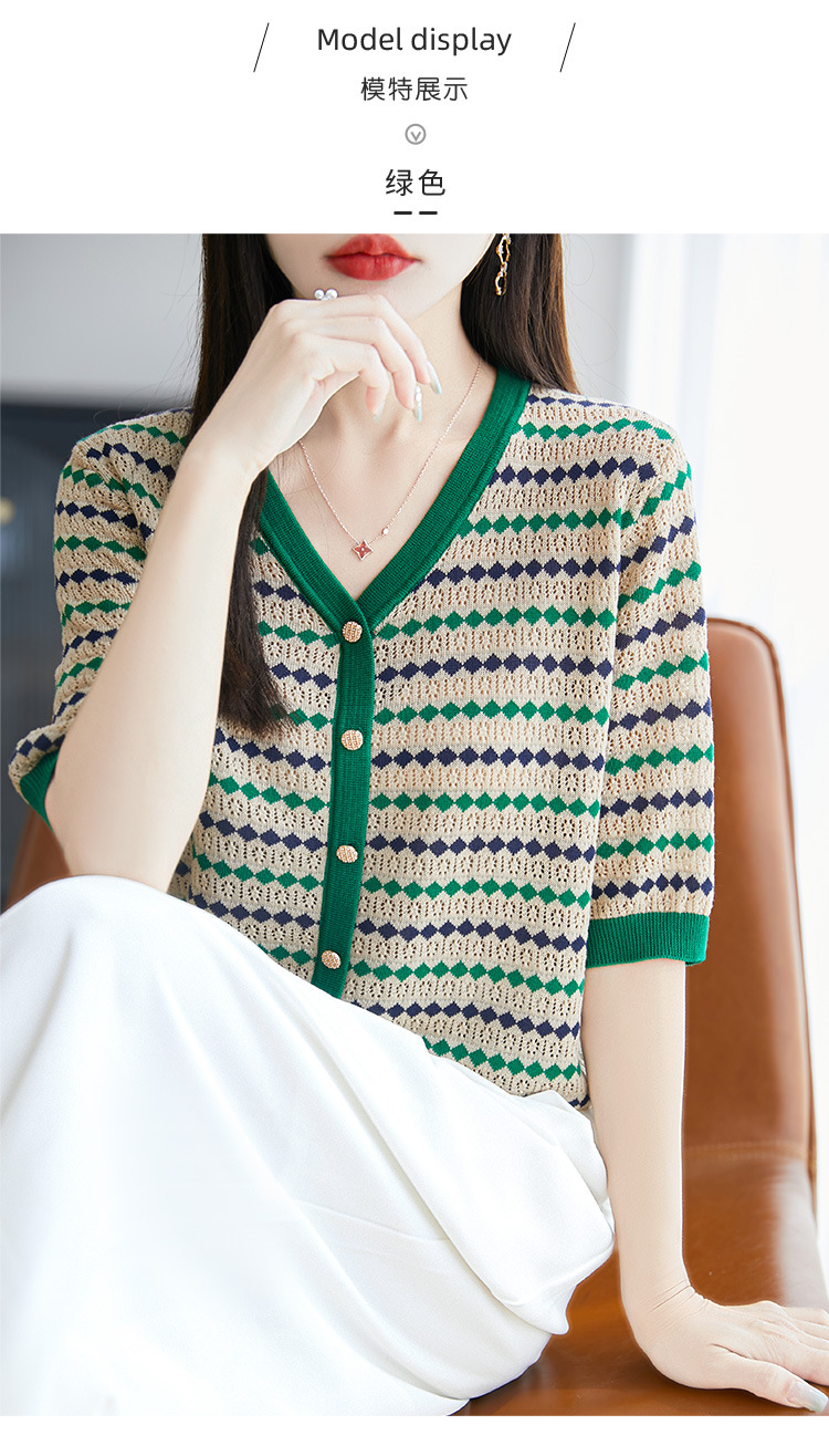 여름 Lyocell Loose Half Sleeve 니트 카디건 여성의 새로운 V 넥 대조 줄무늬 슬림 싱글 브레스트 탑