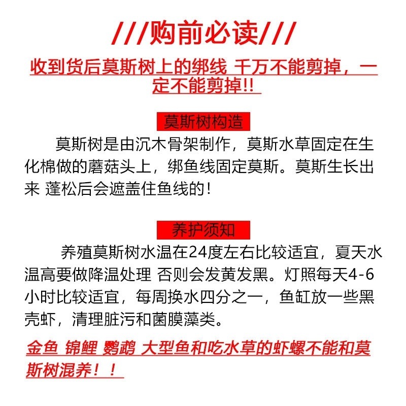• 금붕어, 잉어 및 기타 초식성 물고기는 이끼나무를 키울 수 없습니다.