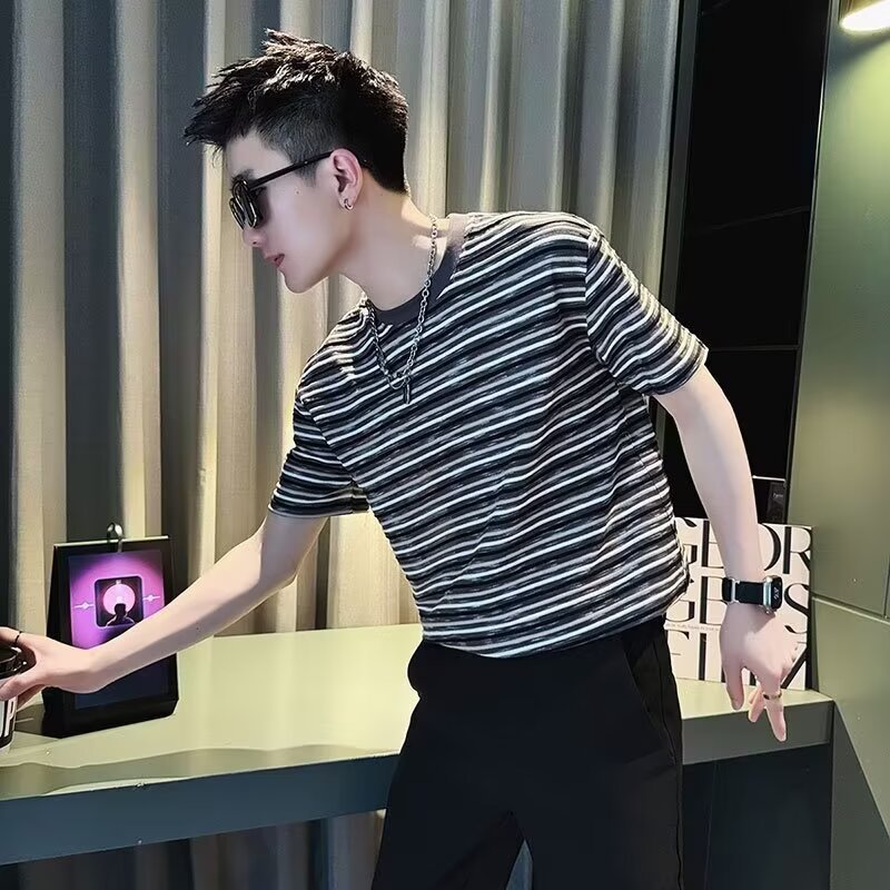 여름 신작 스트라이프 반팔 남성 복고풍 트렌디 브랜드 슬림 비즈니스 스타일 캐주얼 잘 생긴 티셔츠 대외 무역 국경 간 도매