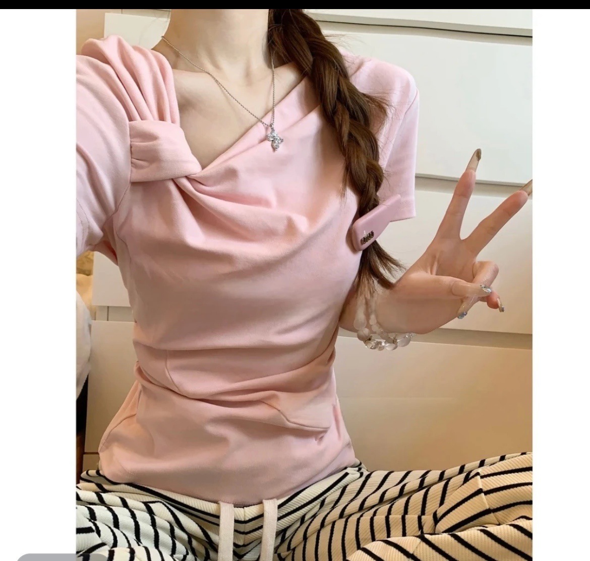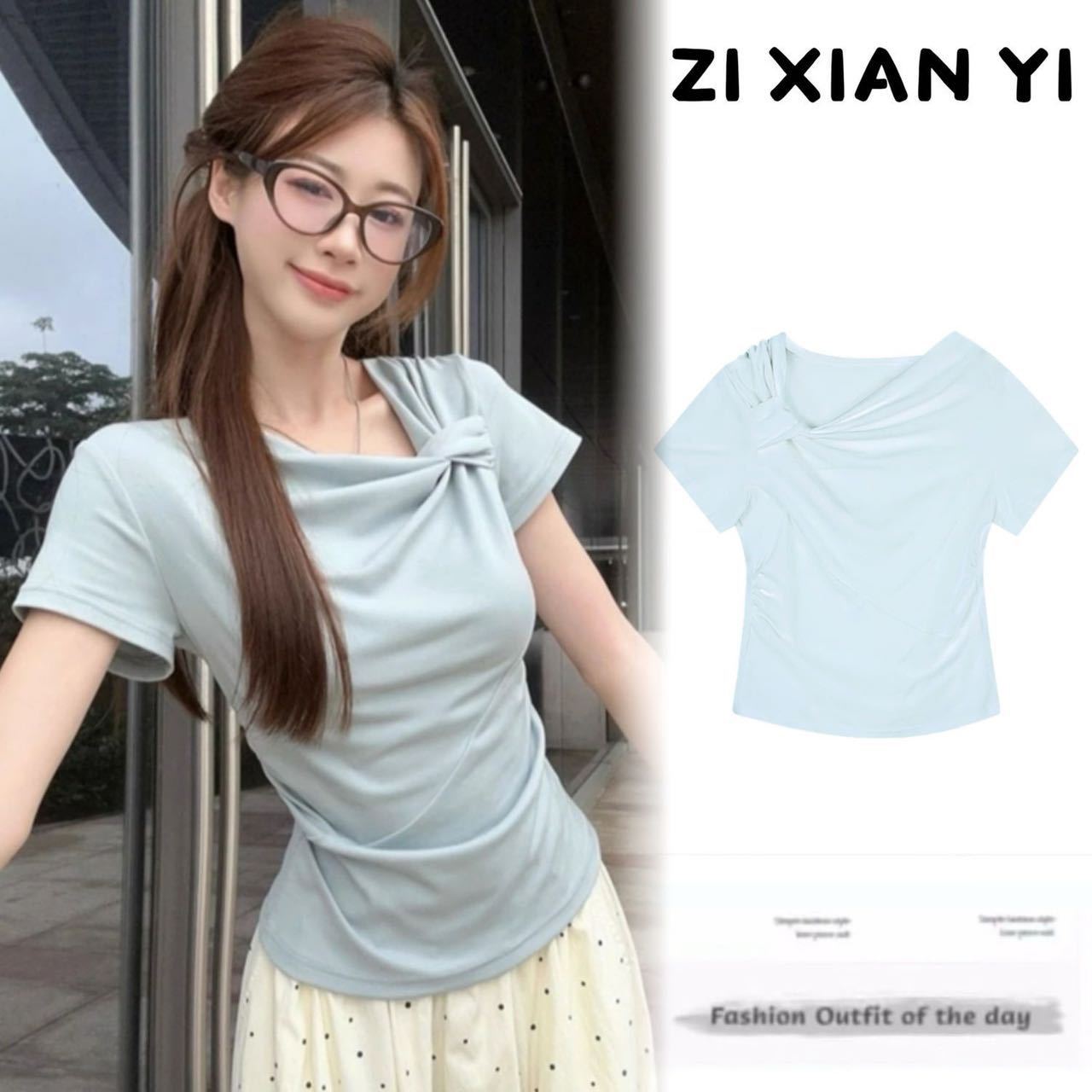 불규칙한 오프숄더 반팔 티셔츠 여성용 다용도 여름 트위스트 주름 캐주얼 탑 슬림 디자인스토어 가기