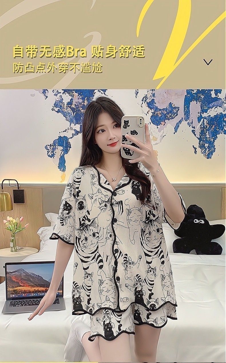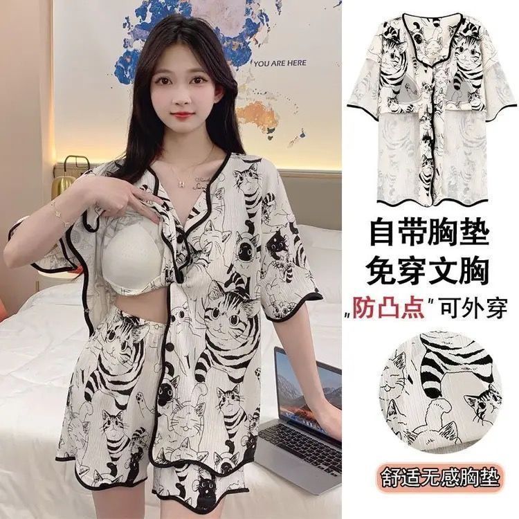 잠옷 여성 여름 십대 자급 벌거 벗은 가슴 패드 달콤한 기질 캐주얼 패션 인쇄 패턴 홈 의류